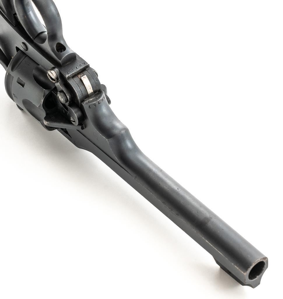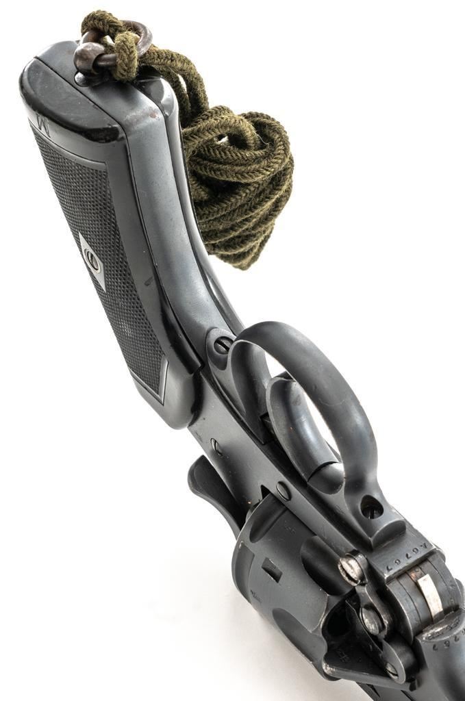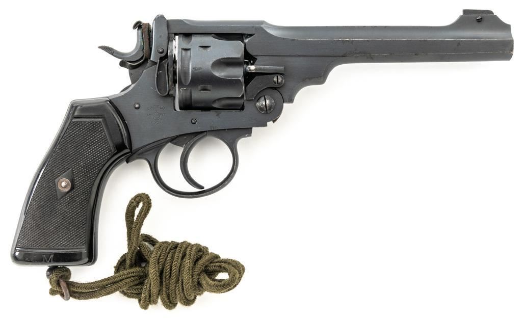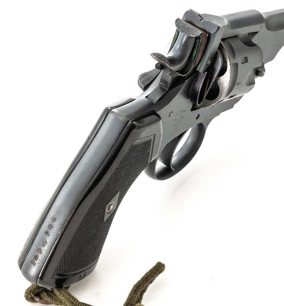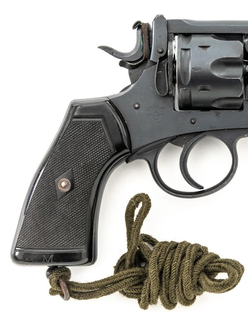 British Enfield No.1 Mk VI Double Action Revolver, #A6767, .45 ACP cal., 6" flat sided barrel, blued finish, checkered black plastic grips marked "M" on each side, pinned blade front sight, fixed rear sight with "U"-notched groove, and swiveling steel lanyard ring at bottom of the grip frame, with an excellent condition green lanyard. A leather protector is attached to face of the hammer. Right side of the frame is marked "ENFIELD/Mk(crown)VI" with a "25 (in service stamp)/(proof stamp)/(broad arrow)/(view inspection mark)" on left side of the barrel strap. Pistol was in Australian service and is stamped with a "D(broad arrow)D" and "784" rack number on the rear grip strap. With "(broad arrow)D" on left side of the frame and barrel. Matching numbers. No visible import marks. Cylinder was importer converted to .45 ACP caliber by machining off the rear. Condition overall is fine, retaining approx. 95% reblued finish, showing a few old patina spots to the barrel. Grips are very good, showing handling marks and areas of flattening to the checkering. An "M" has been scratched into the bottom of the right grip. Action locks up, cycles, and ejects smoothly. Bore is bright with very good, clearly defined rifling. There is some mild pitting visible in the chambers. Est.: $400-$600. (C&R/PPT)
