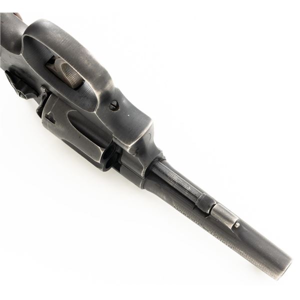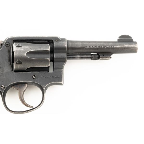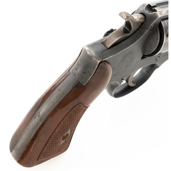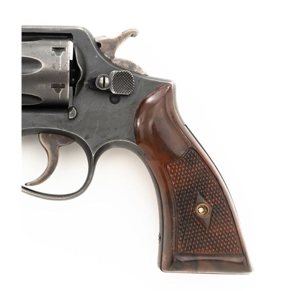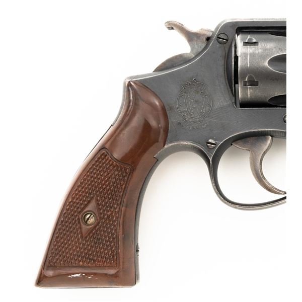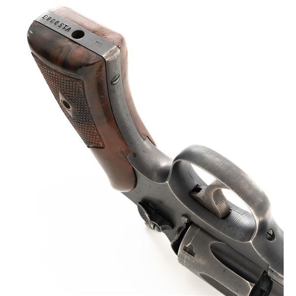 Smith & Wesson Victory Model Double Action Revolver, #V150083, .38 Spl. cal., 4" barrel, parkerized finish with case hardened hammer and trigger, replacement checkered brown plastic grips, blade front sight and fixed rear sight with square-notched groove. The lanyard loop has been removed. "U.S.PROPERTY" markings have been removed. Matching numbers on barrel and cylinder. No visible import marks. Condition overall is good, metal has been buffed and polished, retaining approx. 55%-60% finish, there has been filing to the barrel at the frame, showing thinning and light patina to the rear grip strap. Grips are good with scattered scratches and finish loss to the bottom. Action locks up, cycles, and extracts smoothly. Bore is bright with good rifling. Est.: $300-$400. (C&R/PPT)