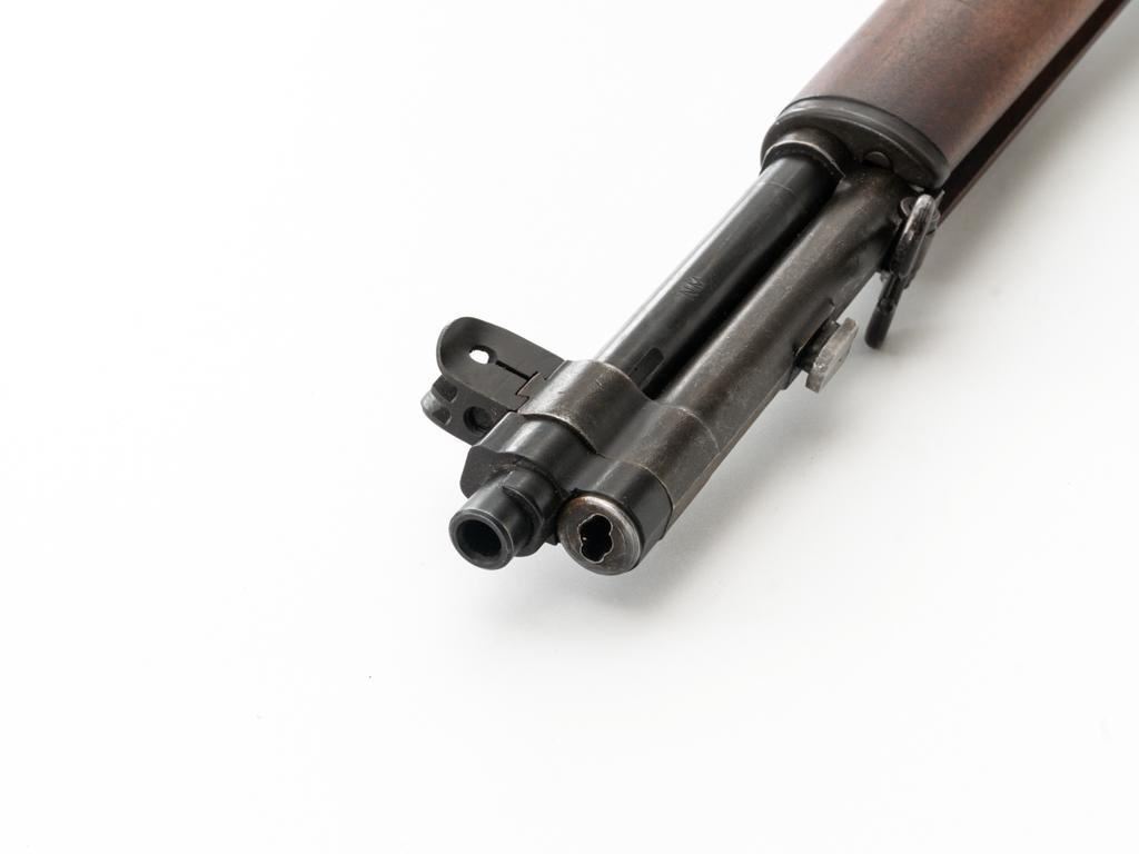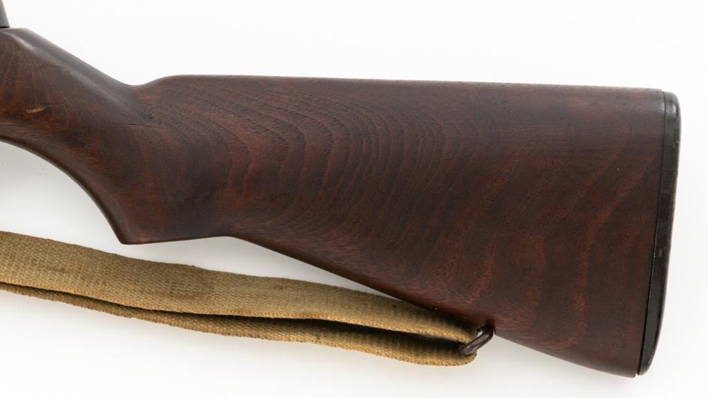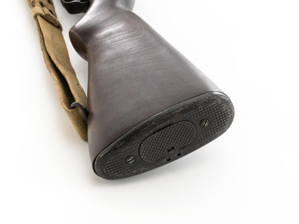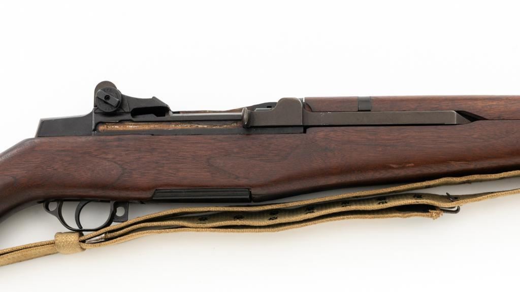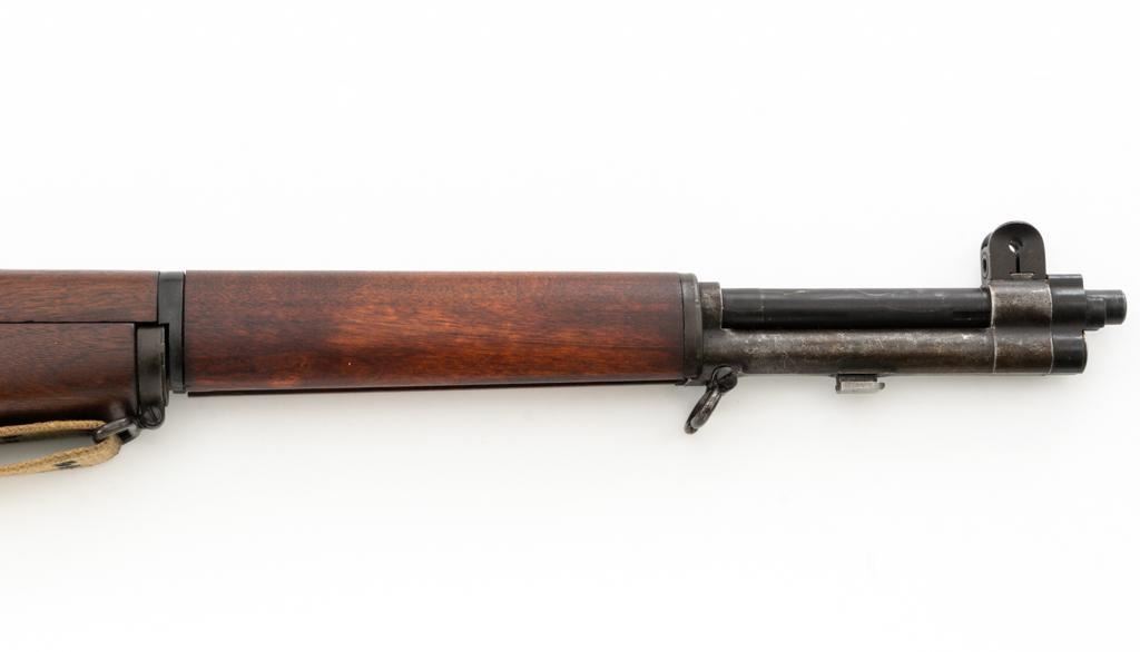 National Ordnance M1 Garand Semi-Automatic Rifle, #1096, .30-06 cal., 24" barrel, blackened finish, walnut stock with two-piece handguard, blade front sight with protectors, and adjustable aperture rear sight with early locking bar and "Battle Range" setting. Includes an aftermarket cotton sling, in fair used condition. Receiver tang faintly marked "NATL. ORD. INC./S. EL MONTE. CA./U.S.RIFLE/CAL.30 M1". Right side of the barrel is stamped "SA 7791035" and "4 63", with a defense Dept "(eagle)" stamp. Left side of the barrel behind the front sight is marked "NM" and the gas cylinder is fitted with an early style locking nut. Top of the bolt is marked "SA". Markings have been removed from the underside of the forend, forward of the magazine. No visible import marks. Condition overall is very good, with the metal retaining approx. 85%-90% finish, which has toned dark, with wear to the gas cylinder, scratches to the barrel. Wood is very good, with scattered mostly moderate impressions and handling marks. Action operates smoothly. Bore is bright with very good, clearly defined rifling. Est.: $800-$1,100. (Modern)
