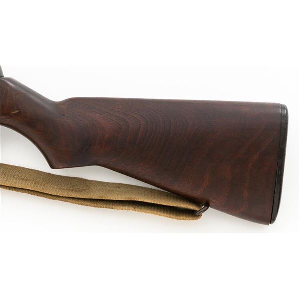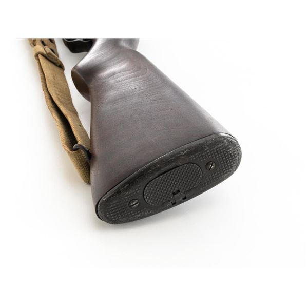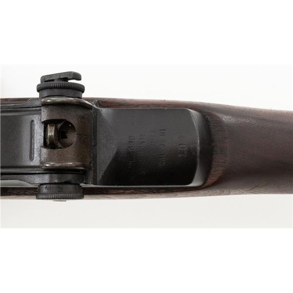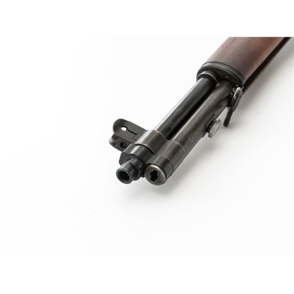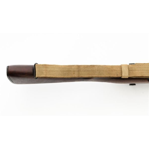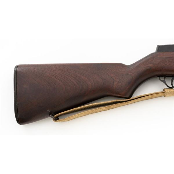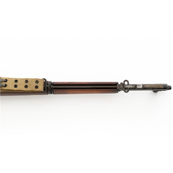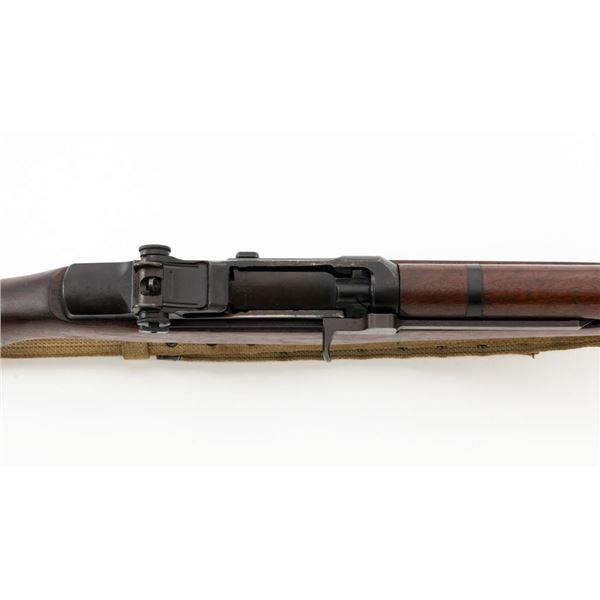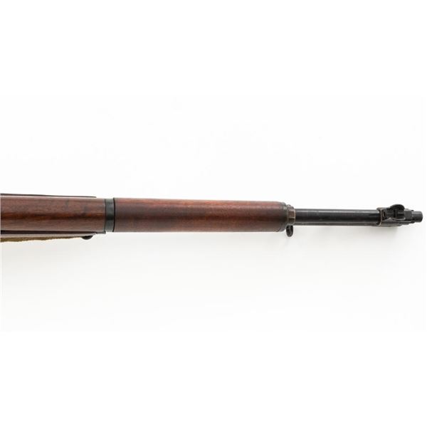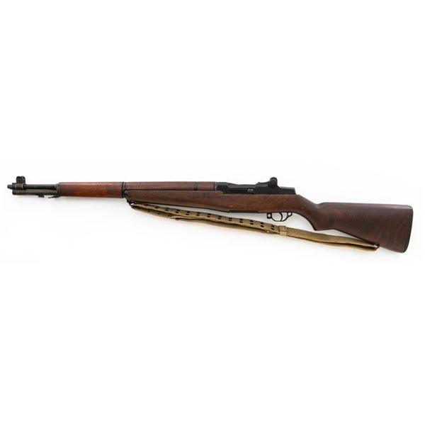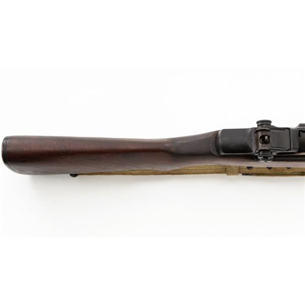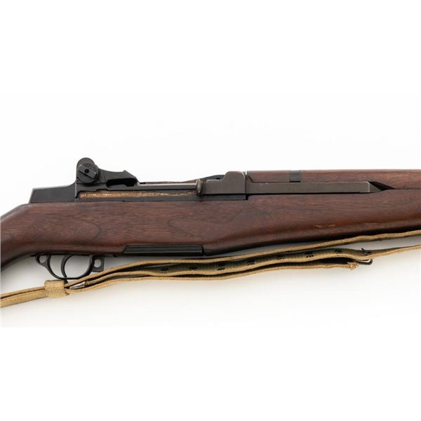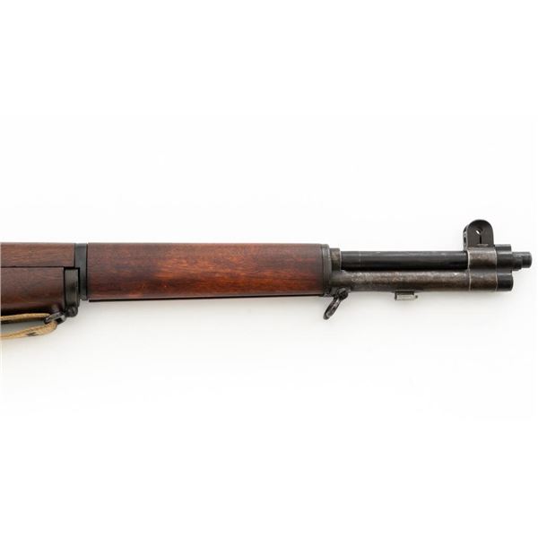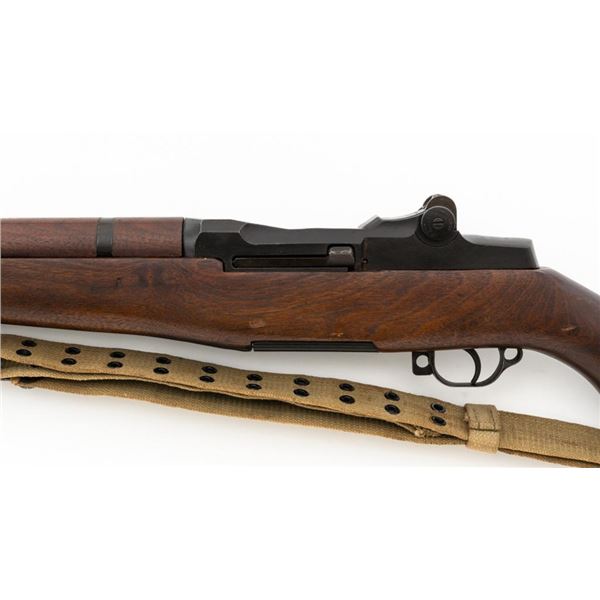 National Ordnance M1 Garand Semi-Automatic Rifle, #1096, .30-06 cal., 24" barrel, blackened finish, walnut stock with two-piece handguard, blade front sight with protectors, and adjustable aperture rear sight with early locking bar and "Battle Range" setting. Includes an aftermarket cotton sling, in fair used condition. Receiver tang faintly marked "NATL. ORD. INC./S. EL MONTE. CA./U.S.RIFLE/CAL.30 M1". Right side of the barrel is stamped "SA 7791035" and "4 63", with a defense Dept "(eagle)" stamp. Left side of the barrel behind the front sight is marked "NM" and the gas cylinder is fitted with an early style locking nut. Top of the bolt is marked "SA". Markings have been removed from the underside of the forend, forward of the magazine. No visible import marks. Condition overall is very good, with the metal retaining approx. 85%-90% finish, which has toned dark, with wear to the gas cylinder, scratches to the barrel. Wood is very good, with scattered mostly moderate impressions and handling marks. Action operates smoothly. Bore is bright with very good, clearly defined rifling. Est.: $800-$1,100. (Modern)