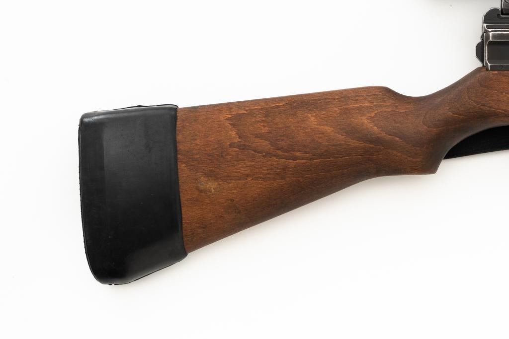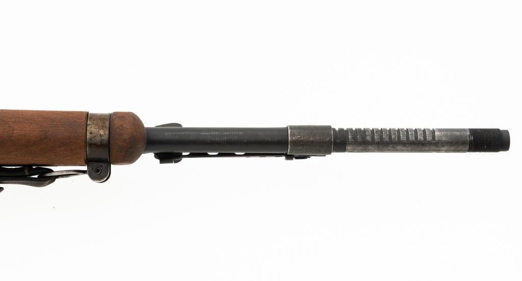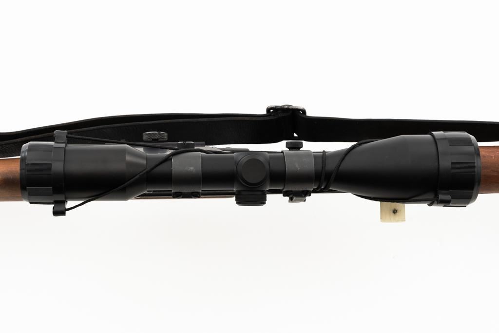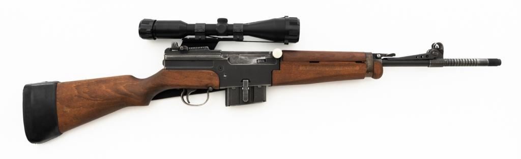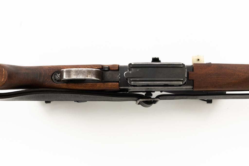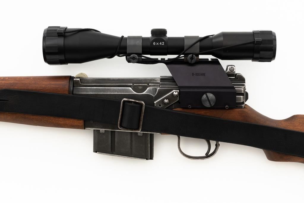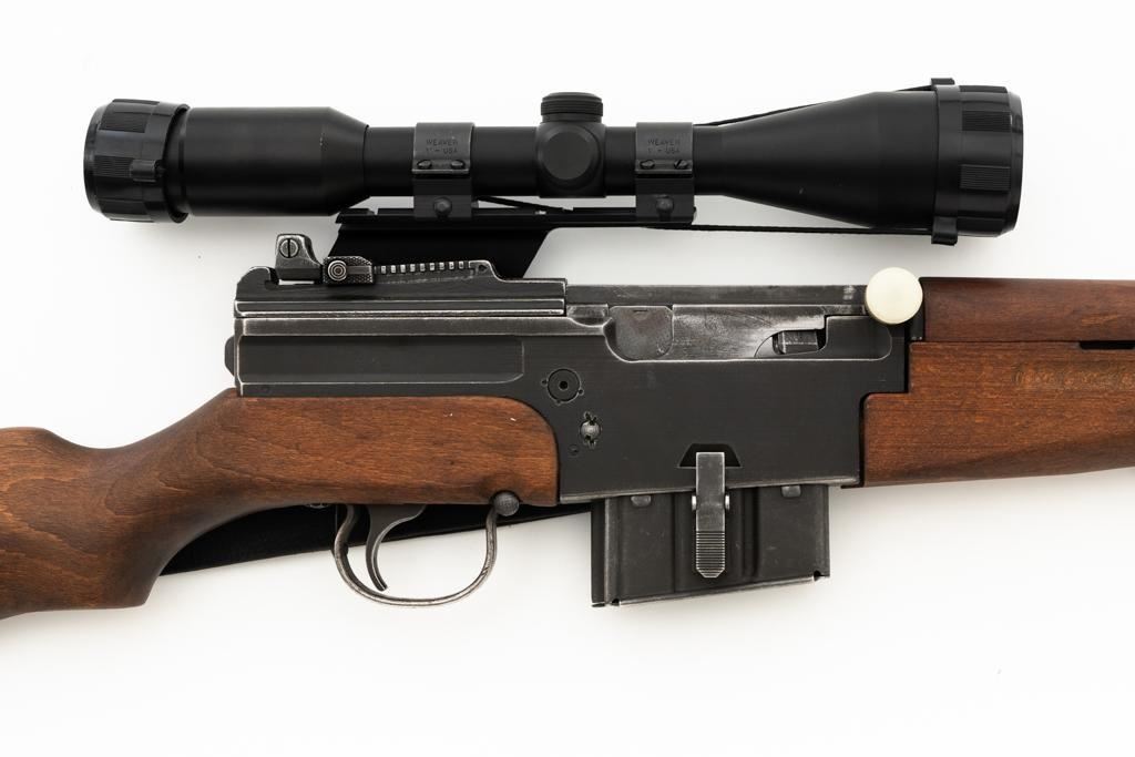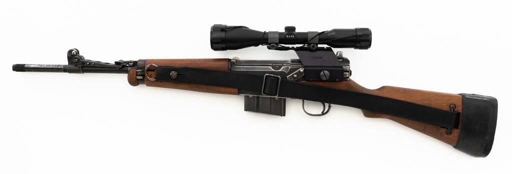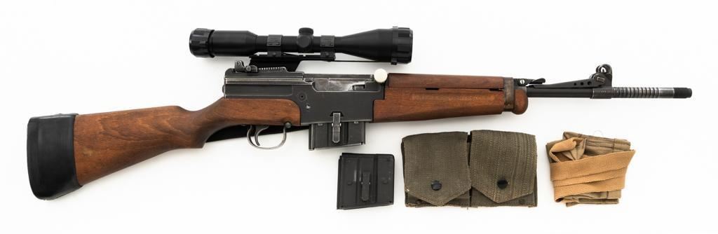 French MAS 49/56 Semi-Automatic Rifle with Scope, Two (2) Magazines, and Accessories, #H00298, .308 Win. cal., 19" barrel, parkerized finish, hardwood stock and handguard, post front sight with protectors, and adjustable aperture rear sight. A B-Square mount, Weaver rings, and 6x42 scope are attached to left side of the receiver. Scope has a few light marks to the tube, optics are bright and clear. Both magazines are stamped ".308"on the floorplates. Includes a French army two-cell green cotton magazine pouch, British military cotton ammunition bandoler, black rubber "MAS 1962" recoil pad, black leather French military sling. Left side of the receiver is marked "MAS MLE 1949-56/CAL.(overstamped)7.62/.308". Barrel stamped "12764". No visible import marks, possibly stamped under the scope mount. Launcher has been removed from the muzzle, and the two flip-up sights remain in place and operate smoothly. Condition overall is very good, retaining approx. 75%-80% finsih, with wear to the receiver and cover. There is rust patina to the end of the gas cylinder. Wood with scattered moderate dents to the handguard, with an even colored finish. Action is a little stiff but functions properly. Bore rates good with darkening in the grooves, and clearly defined rifling. Est.: $700-$900. (C&R)