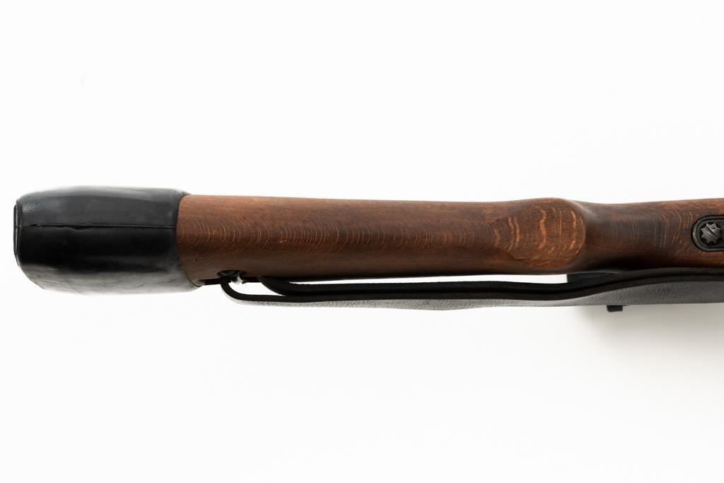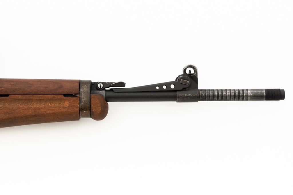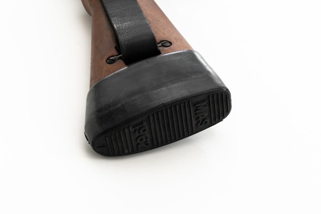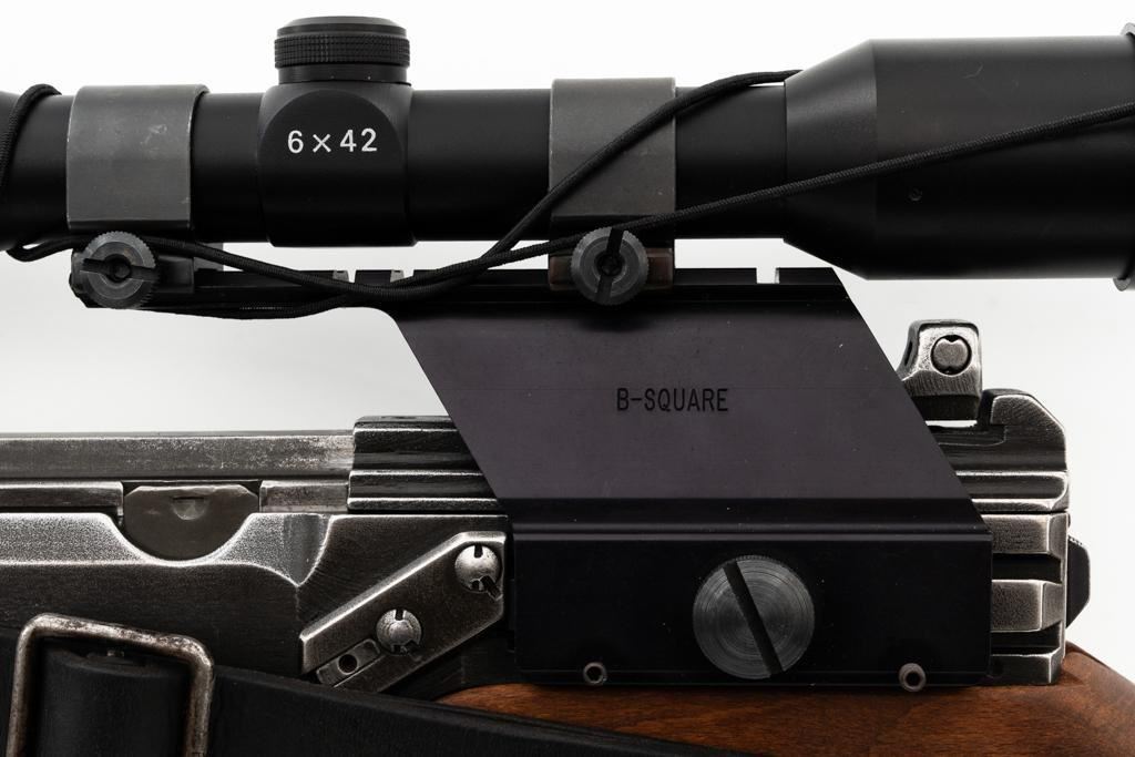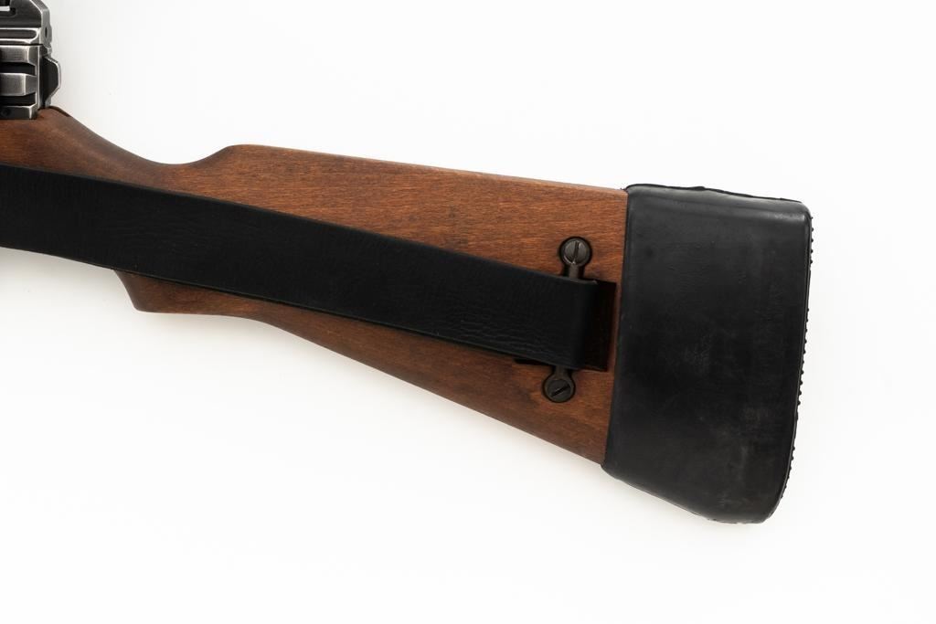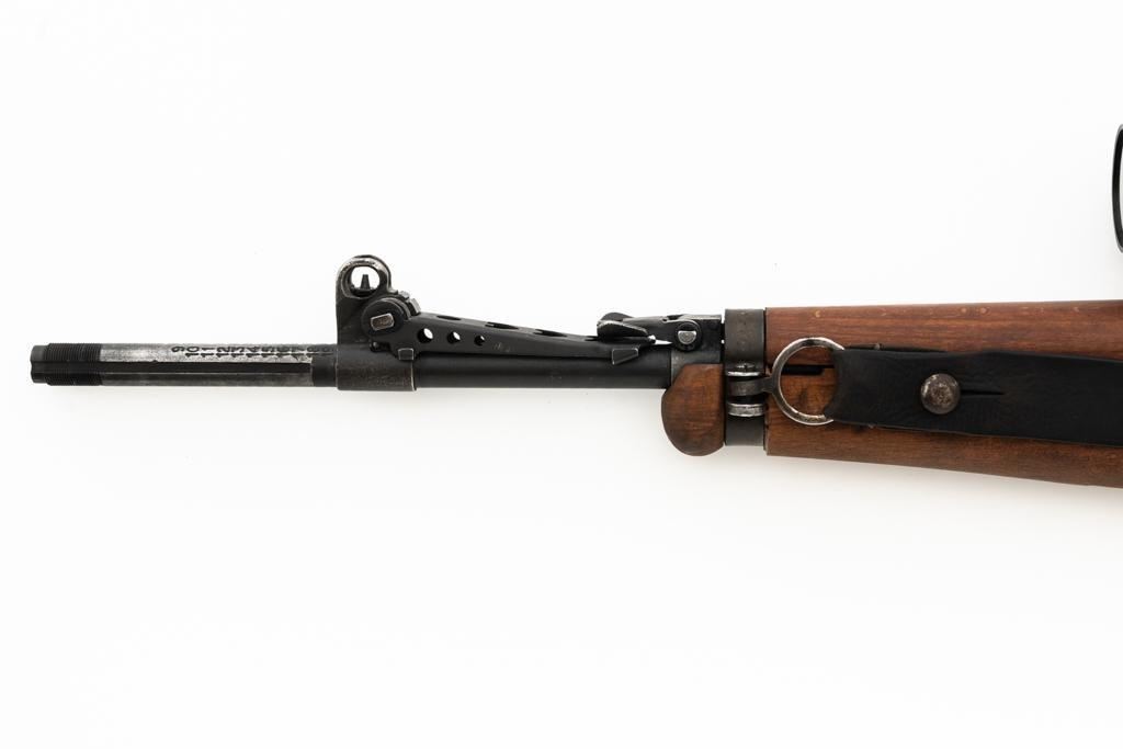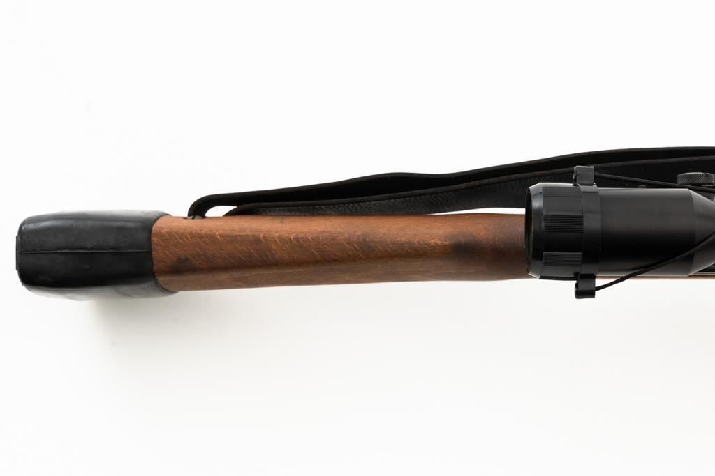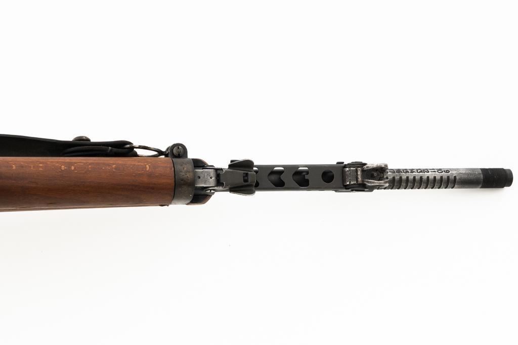 French MAS 49/56 Semi-Automatic Rifle with Scope, Two (2) Magazines, and Accessories, #H00298, .308 Win. cal., 19" barrel, parkerized finish, hardwood stock and handguard, post front sight with protectors, and adjustable aperture rear sight. A B-Square mount, Weaver rings, and 6x42 scope are attached to left side of the receiver. Scope has a few light marks to the tube, optics are bright and clear. Both magazines are stamped ".308"on the floorplates. Includes a French army two-cell green cotton magazine pouch, British military cotton ammunition bandoler, black rubber "MAS 1962" recoil pad, black leather French military sling. Left side of the receiver is marked "MAS MLE 1949-56/CAL.(overstamped)7.62/.308". Barrel stamped "12764". No visible import marks, possibly stamped under the scope mount. Launcher has been removed from the muzzle, and the two flip-up sights remain in place and operate smoothly. Condition overall is very good, retaining approx. 75%-80% finsih, with wear to the receiver and cover. There is rust patina to the end of the gas cylinder. Wood with scattered moderate dents to the handguard, with an even colored finish. Action is a little stiff but functions properly. Bore rates good with darkening in the grooves, and clearly defined rifling. Est.: $700-$900. (C&R)