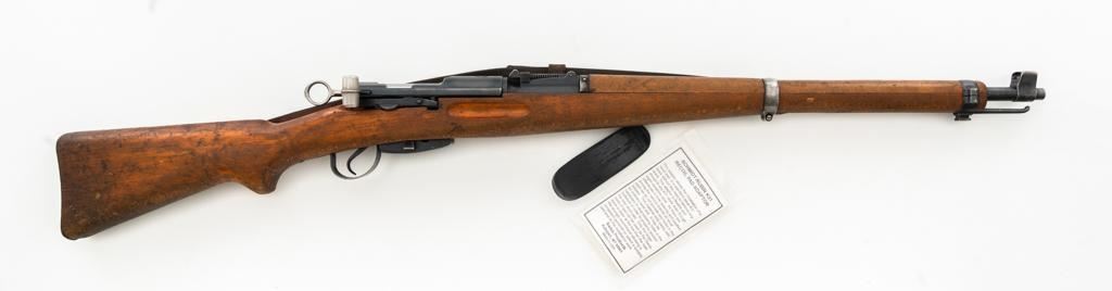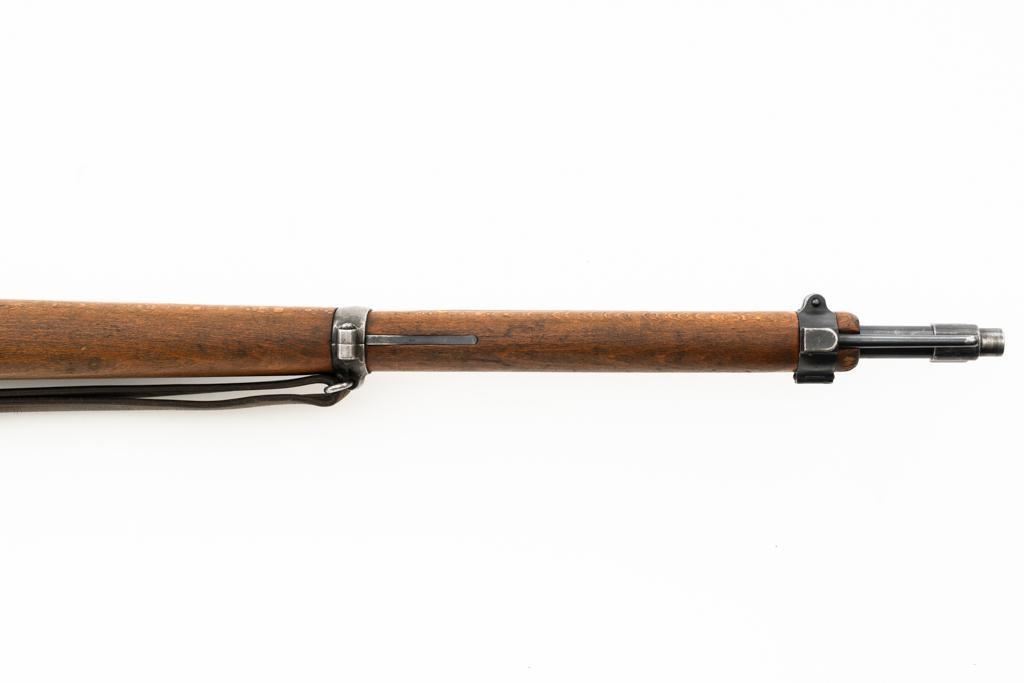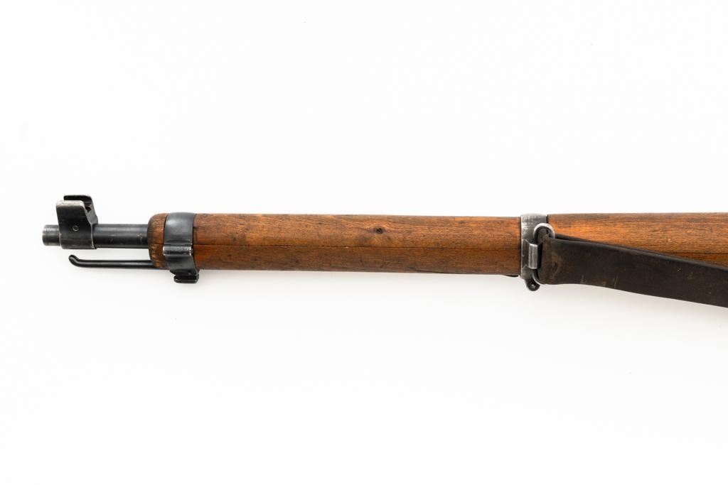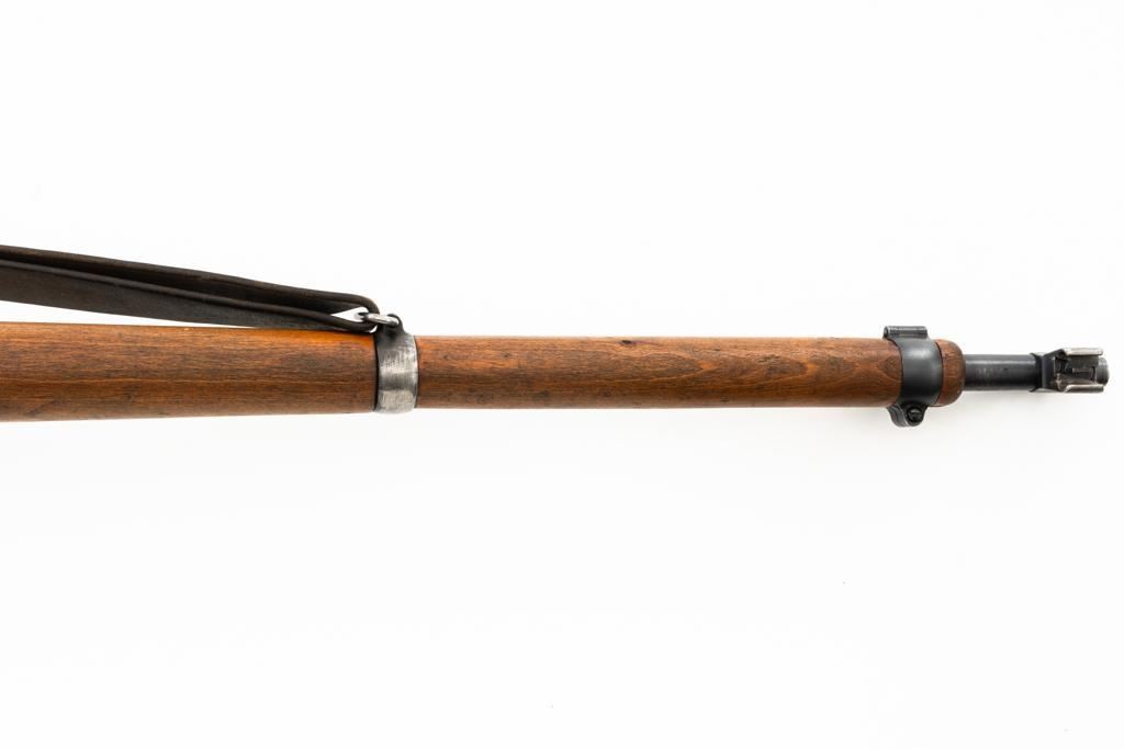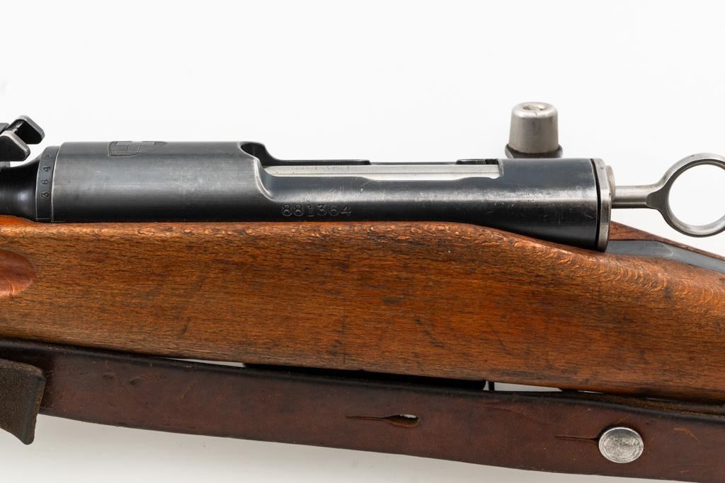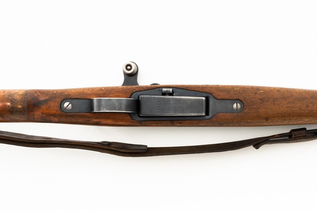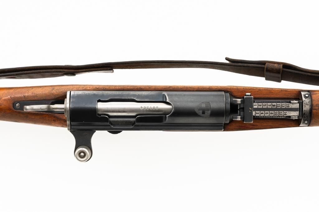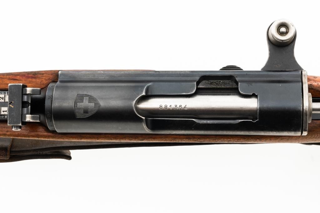 Swiss K31 Straight Pull Rifle #881364, 7.5x55mm cal., 26" barrel, blued finish, hardwood stock and handguard, blade front sight with protectors, and adjustable tangent rear sight with "U"-notched groove, graduated to 1500 meters. Includes one magazine and brown leather Swiss sling, and commercial recoil pad adaptor. Top of receiver ring is marked with a Swiss cross inside shield symbol and there is a faint Swiss cross in shield symbol stamped on right side of the buttstock. Matching visible numbers. No visible import marks. Condition overall is very good, retaining approx. 85%-87% blue, with wear around the muzzle, rear barrel band, and cleaning to the buttplate. Wood is good, with general marks, and wear to the finish. There are also a few small cracks behind the receiver tang and rear sling mount. Action operates smoothly. Bright bore rates excellent, with well-defined rifling. Est.: $400-$500. (C&R)
