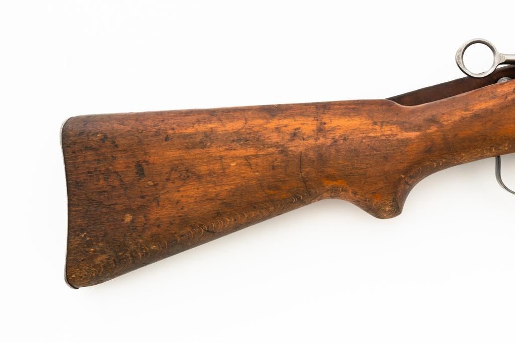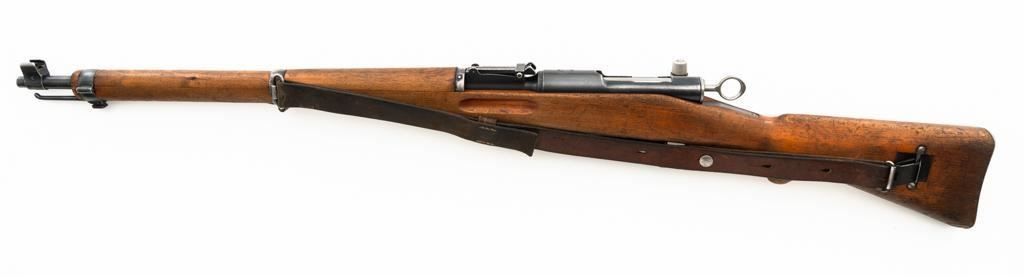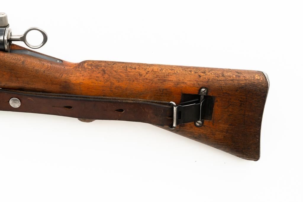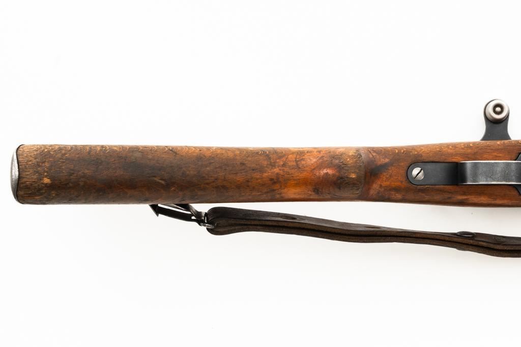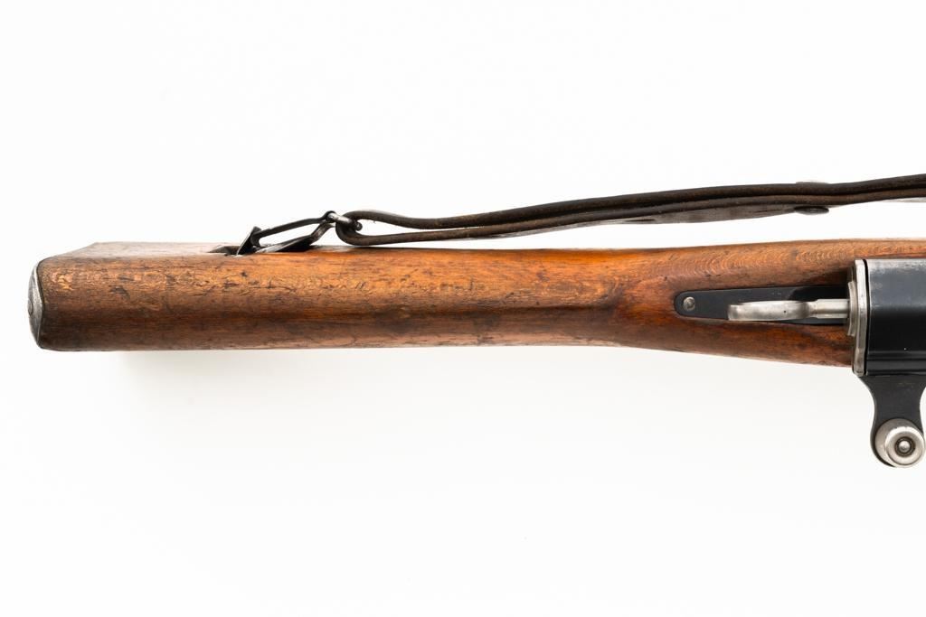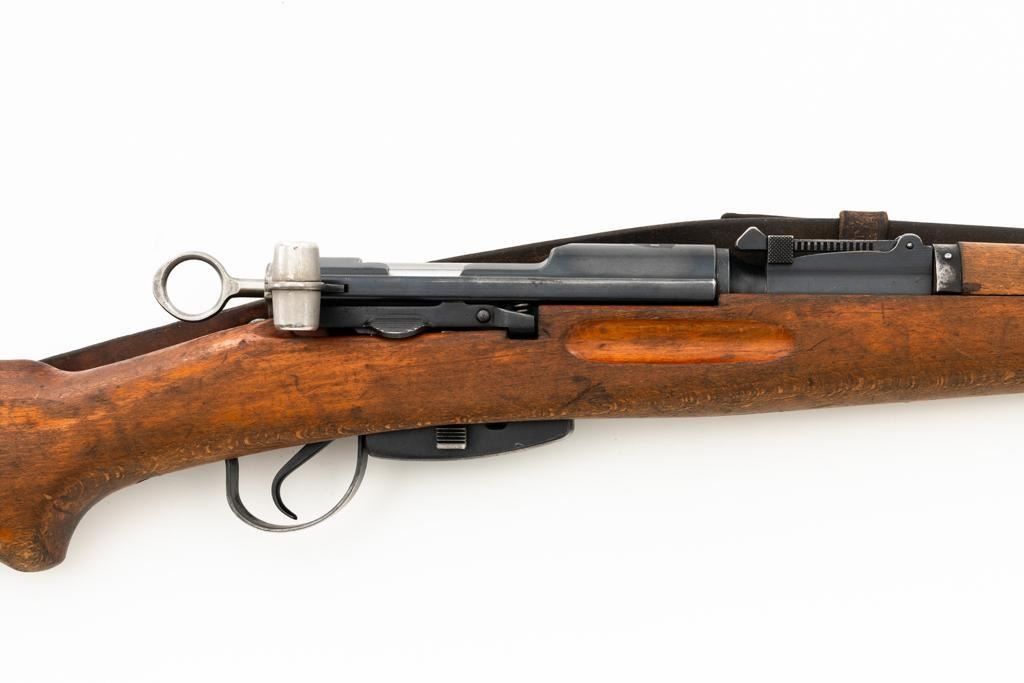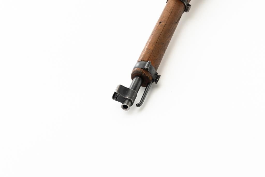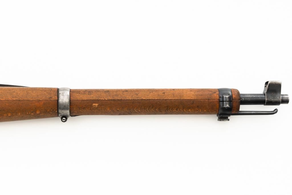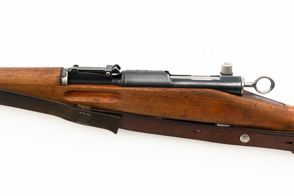 Swiss K31 Straight Pull Rifle #881364, 7.5x55mm cal., 26" barrel, blued finish, hardwood stock and handguard, blade front sight with protectors, and adjustable tangent rear sight with "U"-notched groove, graduated to 1500 meters. Includes one magazine and brown leather Swiss sling, and commercial recoil pad adaptor. Top of receiver ring is marked with a Swiss cross inside shield symbol and there is a faint Swiss cross in shield symbol stamped on right side of the buttstock. Matching visible numbers. No visible import marks. Condition overall is very good, retaining approx. 85%-87% blue, with wear around the muzzle, rear barrel band, and cleaning to the buttplate. Wood is good, with general marks, and wear to the finish. There are also a few small cracks behind the receiver tang and rear sling mount. Action operates smoothly. Bright bore rates excellent, with well-defined rifling. Est.: $400-$500. (C&R)