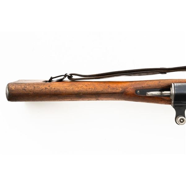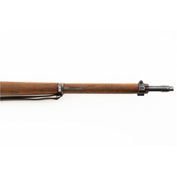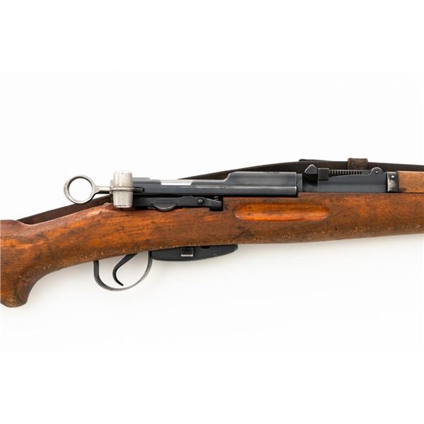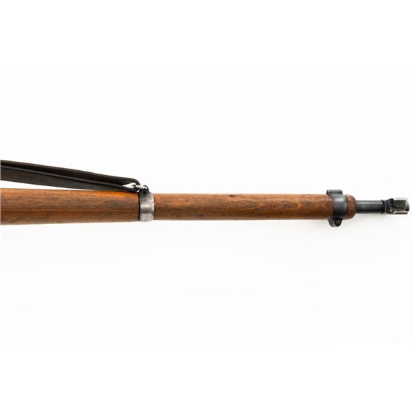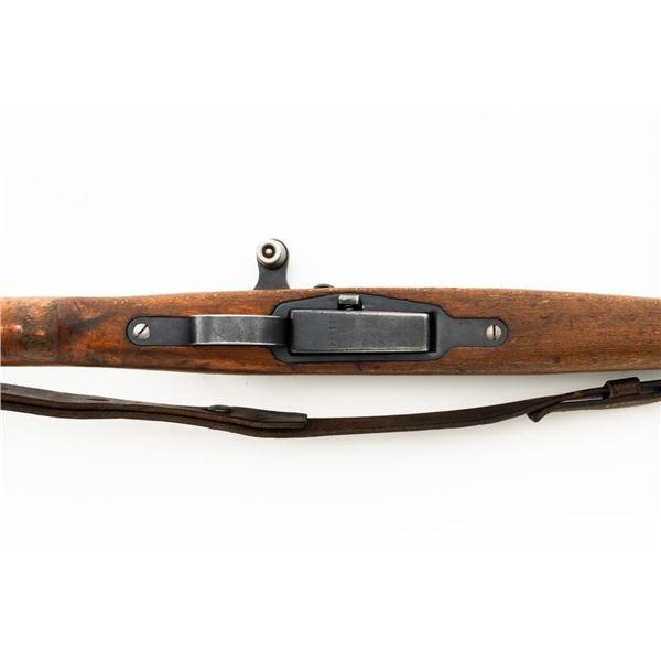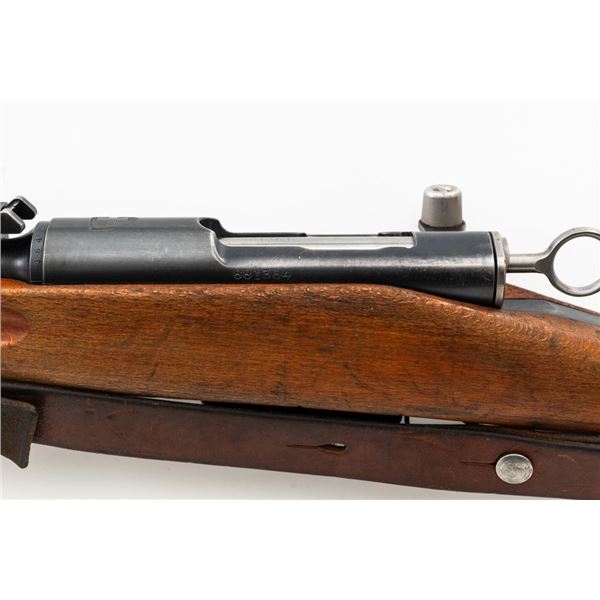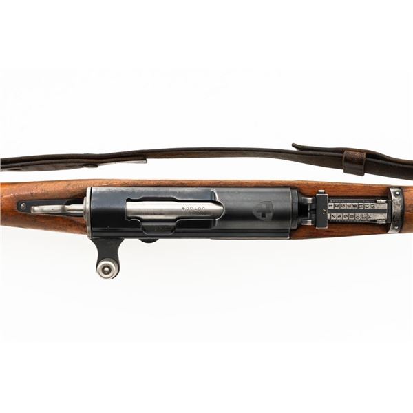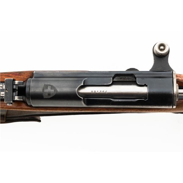 Swiss K31 Straight Pull Rifle #881364, 7.5x55mm cal., 26" barrel, blued finish, hardwood stock and handguard, blade front sight with protectors, and adjustable tangent rear sight with "U"-notched groove, graduated to 1500 meters. Includes one magazine and brown leather Swiss sling, and commercial recoil pad adaptor. Top of receiver ring is marked with a Swiss cross inside shield symbol and there is a faint Swiss cross in shield symbol stamped on right side of the buttstock. Matching visible numbers. No visible import marks. Condition overall is very good, retaining approx. 85%-87% blue, with wear around the muzzle, rear barrel band, and cleaning to the buttplate. Wood is good, with general marks, and wear to the finish. There are also a few small cracks behind the receiver tang and rear sling mount. Action operates smoothly. Bright bore rates excellent, with well-defined rifling. Est.: $400-$500. (C&R)