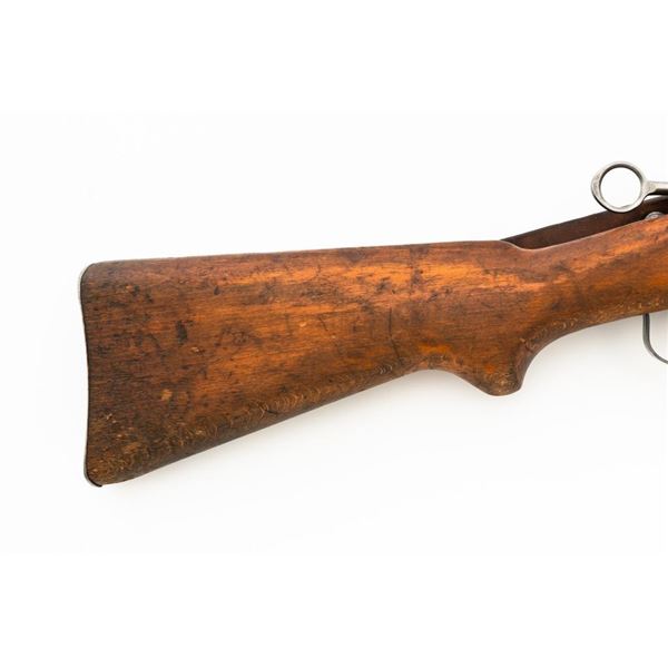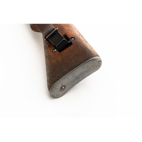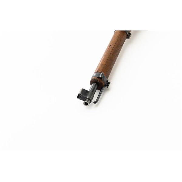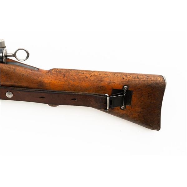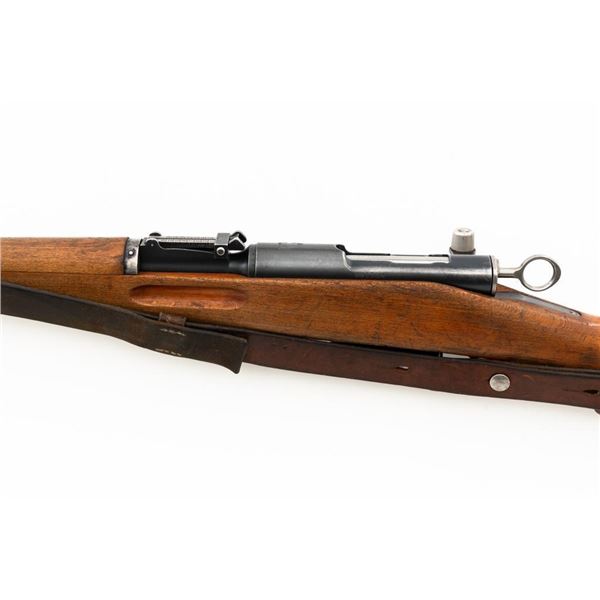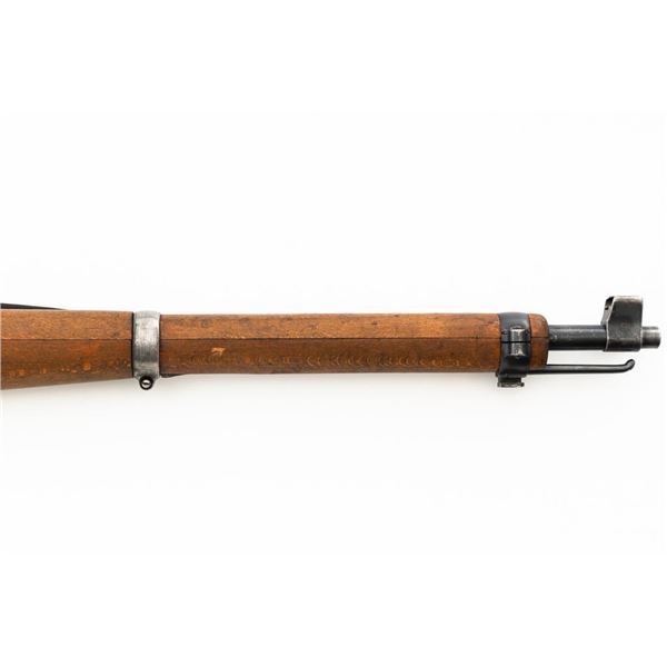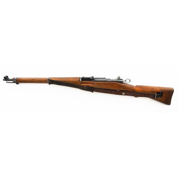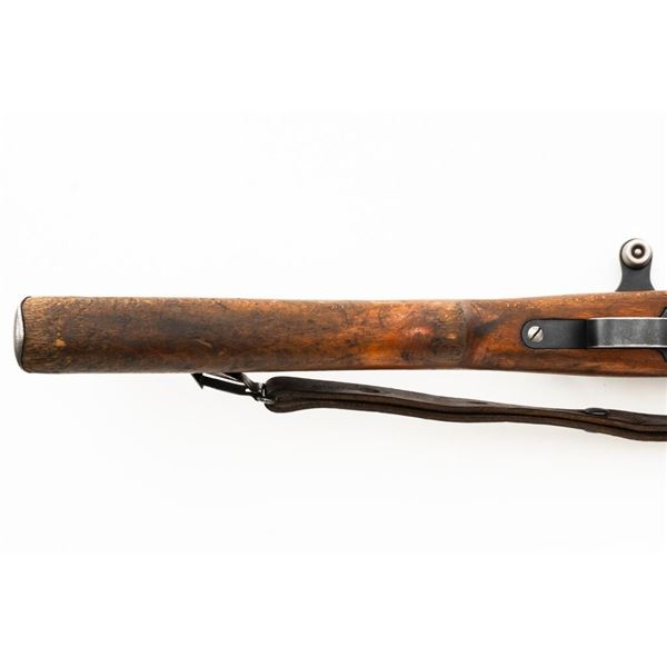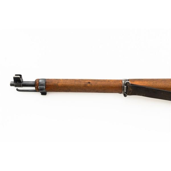 Swiss K31 Straight Pull Rifle #881364, 7.5x55mm cal., 26" barrel, blued finish, hardwood stock and handguard, blade front sight with protectors, and adjustable tangent rear sight with "U"-notched groove, graduated to 1500 meters. Includes one magazine and brown leather Swiss sling, and commercial recoil pad adaptor. Top of receiver ring is marked with a Swiss cross inside shield symbol and there is a faint Swiss cross in shield symbol stamped on right side of the buttstock. Matching visible numbers. No visible import marks. Condition overall is very good, retaining approx. 85%-87% blue, with wear around the muzzle, rear barrel band, and cleaning to the buttplate. Wood is good, with general marks, and wear to the finish. There are also a few small cracks behind the receiver tang and rear sling mount. Action operates smoothly. Bright bore rates excellent, with well-defined rifling. Est.: $400-$500. (C&R)
