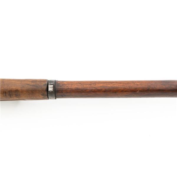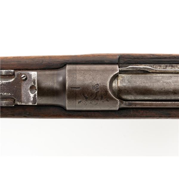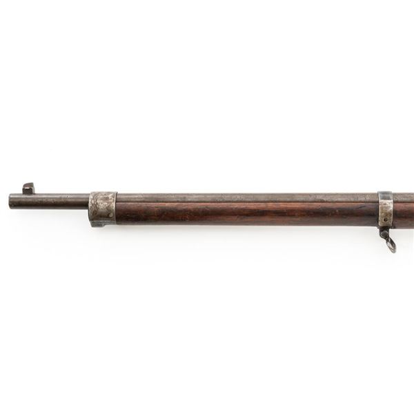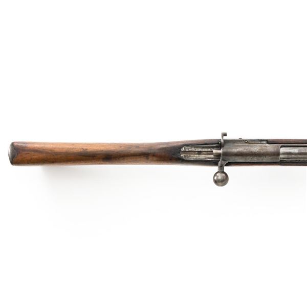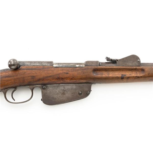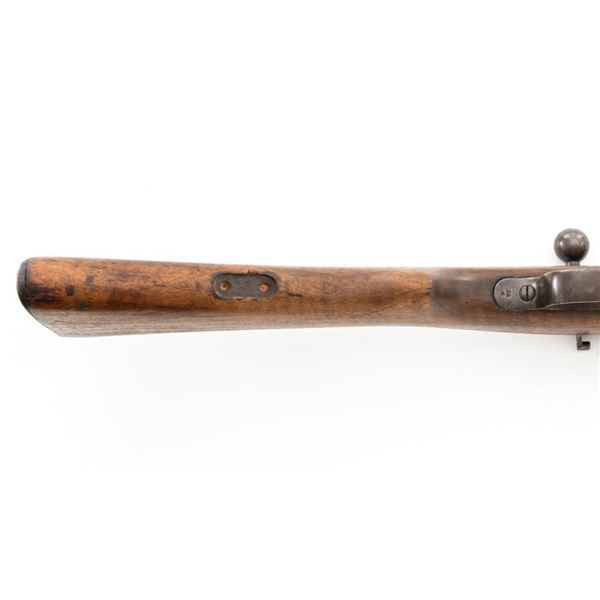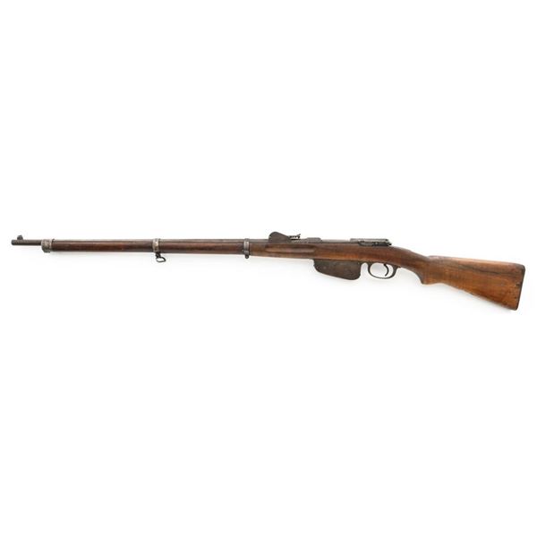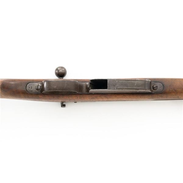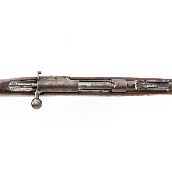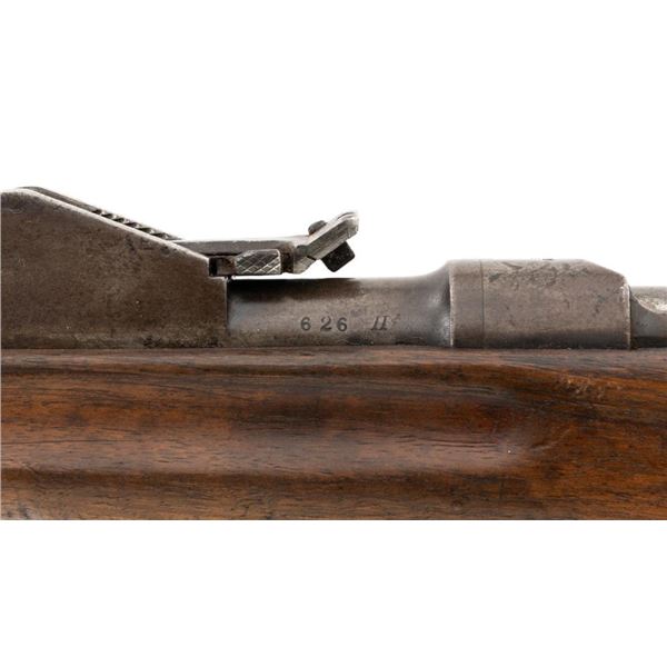 Antique Austrian M1886 Mannlicher Straight Pull Rifle, #626, 11mm Werndl cal., 31.5" barrel, blued finish, hardwood stock, dovetailed inverted-"V" front sight, and adjustable rear sight with "V"-notched groove, graduated to 2300 meters. Stacking hook is missing from under the barrel and the sling mount is missing from the buttstock. Made by Steyr in Austria and marked "OEWG" on top of the receiver ring. There is a faint number stamped on left side of the buttstock. Condition overall is good. Metal has mostly toned brown with areas of light pitting on the receiver and barrel. Wood has been sanded behind the rear barrel band, now in fair condition with a crack to right side of the wrist, with scattered marks from service use. Action operates smoothly. Bright bore rates excellent, with well-defined rifling. Est.: $300-$500. (Antique)