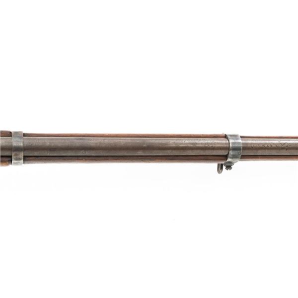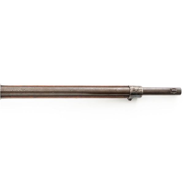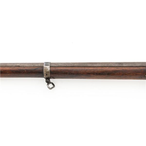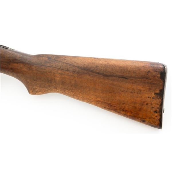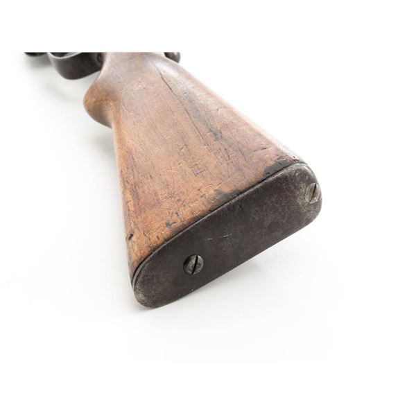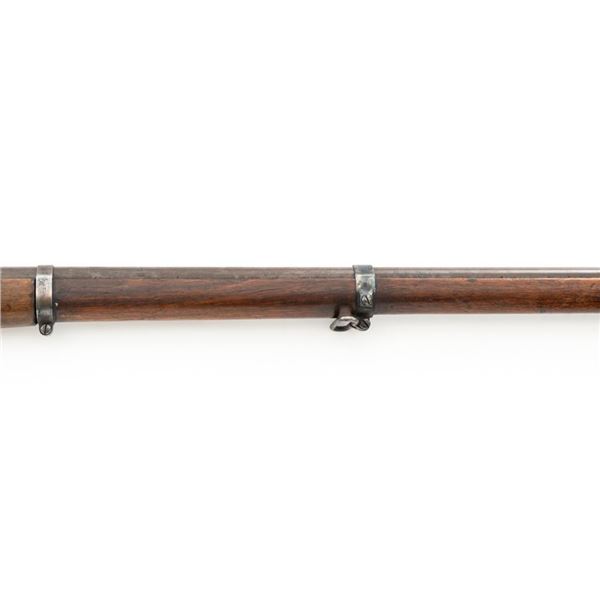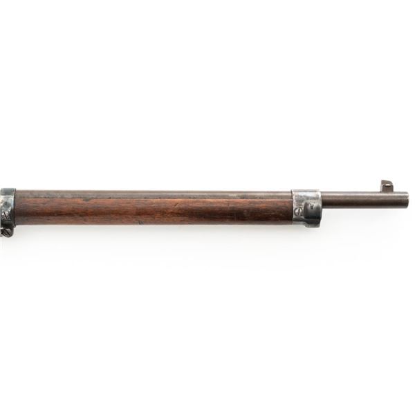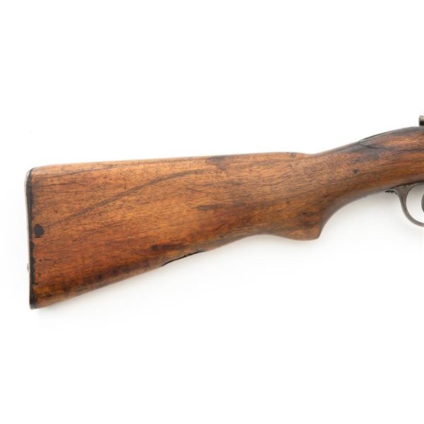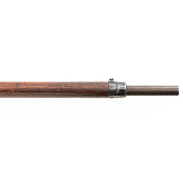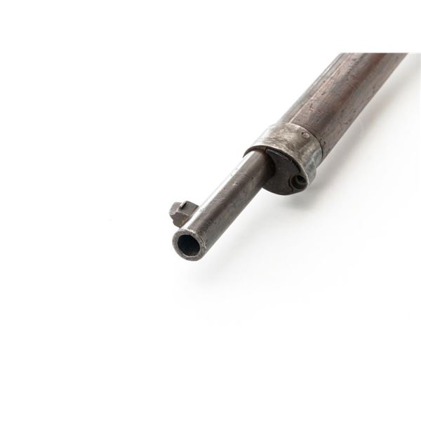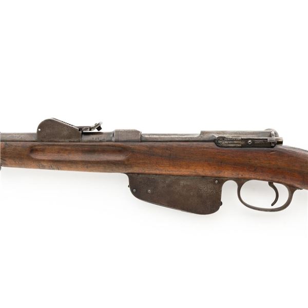 Antique Austrian M1886 Mannlicher Straight Pull Rifle, #626, 11mm Werndl cal., 31.5" barrel, blued finish, hardwood stock, dovetailed inverted-"V" front sight, and adjustable rear sight with "V"-notched groove, graduated to 2300 meters. Stacking hook is missing from under the barrel and the sling mount is missing from the buttstock. Made by Steyr in Austria and marked "OEWG" on top of the receiver ring. There is a faint number stamped on left side of the buttstock. Condition overall is good. Metal has mostly toned brown with areas of light pitting on the receiver and barrel. Wood has been sanded behind the rear barrel band, now in fair condition with a crack to right side of the wrist, with scattered marks from service use. Action operates smoothly. Bright bore rates excellent, with well-defined rifling. Est.: $300-$500. (Antique)