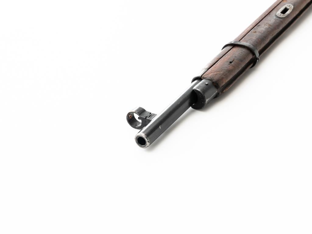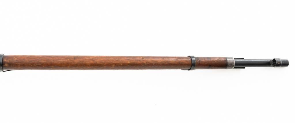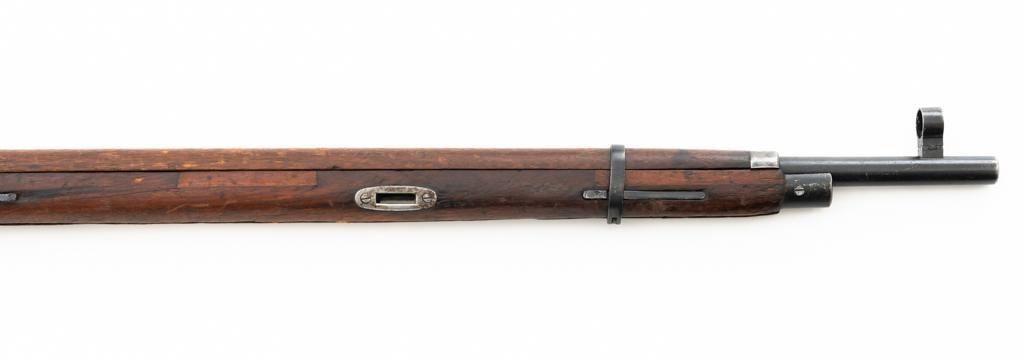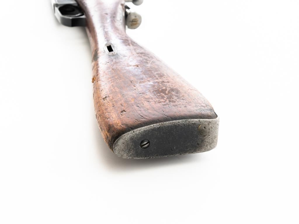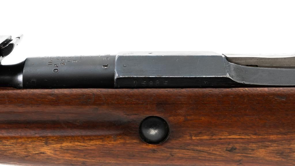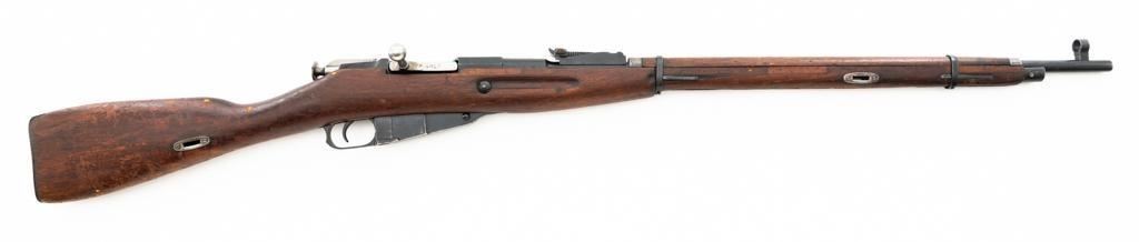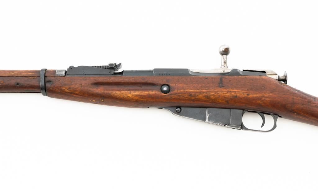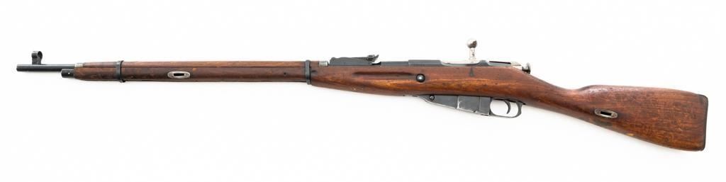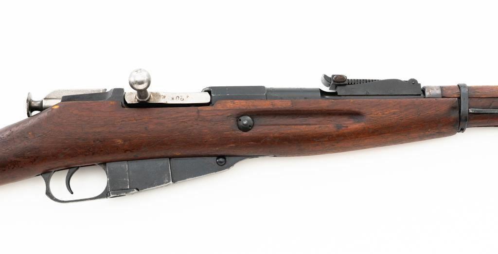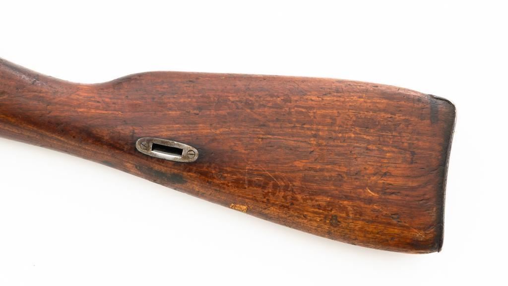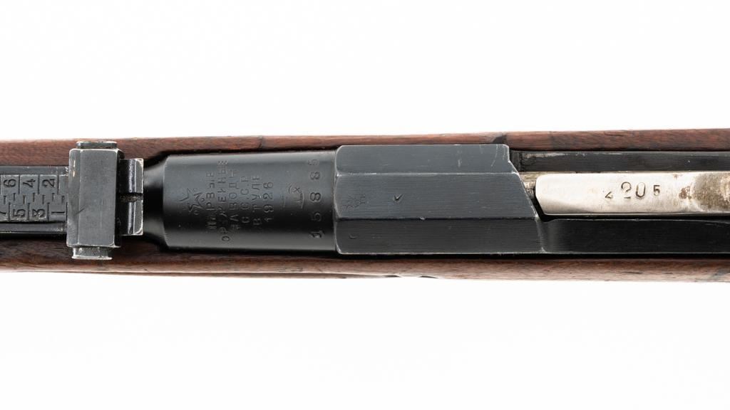 Soviet 1926 Dated M1891 Mosin Nagant Bolt Action Rifle, #15885, 7.62x54Rmm cal., 29" barrel, blued finish with bright bolt assembly, hardwood stock and handguard, hooded post front sight, and adjustable tangent rear sight with "U"-notched groove, graduated to 2000 meters. Steel cleaning rod is missing. Top of the barrel shank is stamped with "(five pointed star)" over Cyrillic "NEPBBIE/OPYXEKHBLE/3ABONBL/CCCP/BTYNE/1926" over "(crossed hammers)". Top of the hexagonal receiver is stamped with faint Czarist crest. Matching number stamped on left side of the receiver and other parts, except for the bolt. Import marked on right side of the barrel. Condition overall is good, retaining approx. 85% blue, with wear primarily to the magazine floorplate and buttplate. Bolt assembly with areas of rust and pitting to top of the bolt handle. Wood general dents, scratches, and spots of flaking finish. Additionally, there is a spliced repair to right side of the forend. Action operates smoothly. Bore with good rifling. Est.: $300-$500. (C&R)