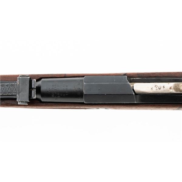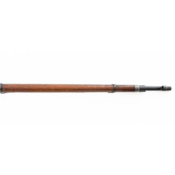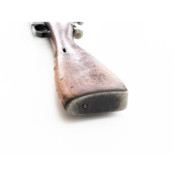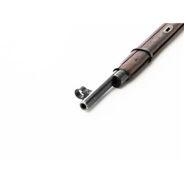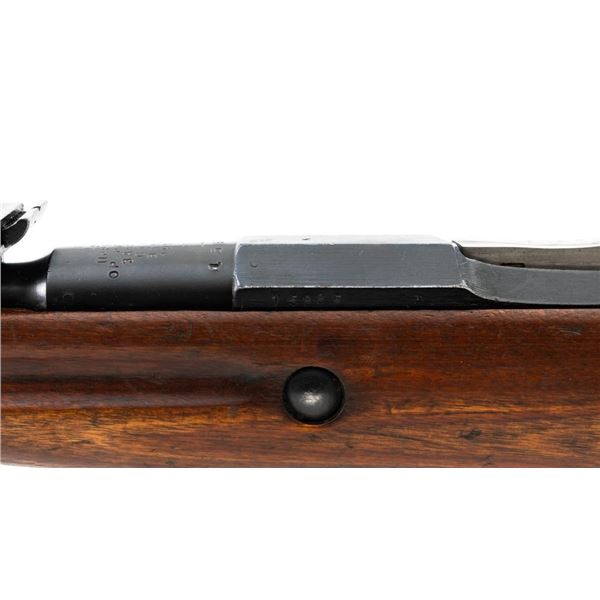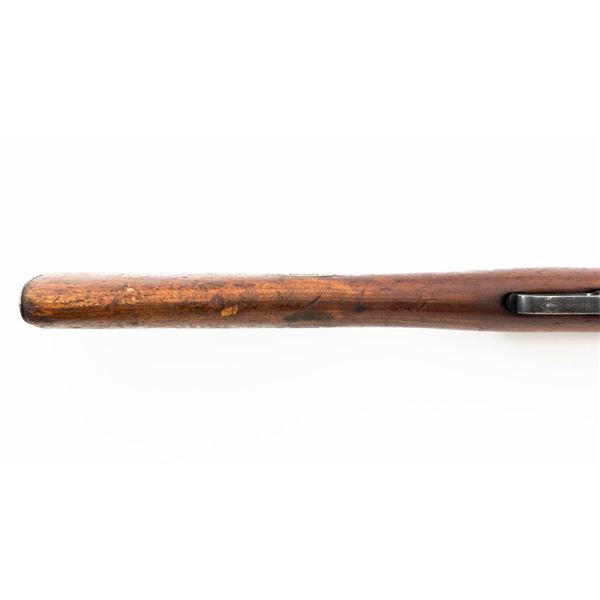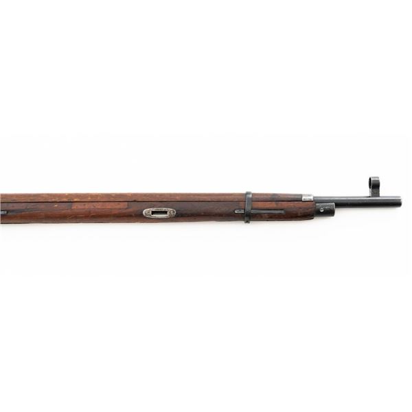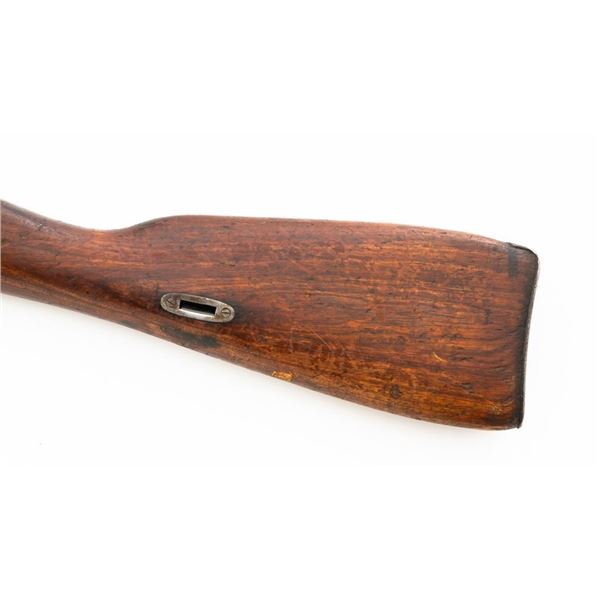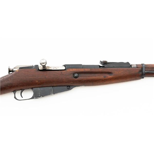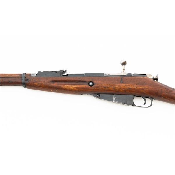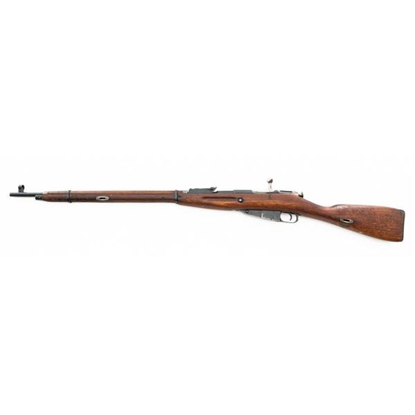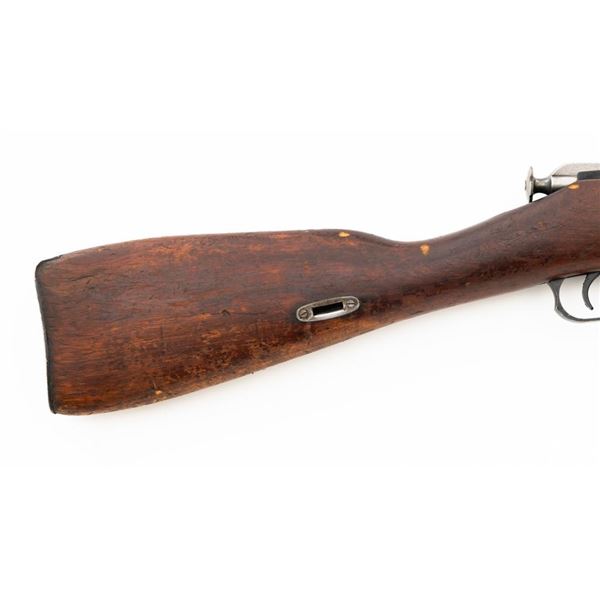 Soviet 1926 Dated M1891 Mosin Nagant Bolt Action Rifle, #15885, 7.62x54Rmm cal., 29" barrel, blued finish with bright bolt assembly, hardwood stock and handguard, hooded post front sight, and adjustable tangent rear sight with "U"-notched groove, graduated to 2000 meters. Steel cleaning rod is missing. Top of the barrel shank is stamped with "(five pointed star)" over Cyrillic "NEPBBIE/OPYXEKHBLE/3ABONBL/CCCP/BTYNE/1926" over "(crossed hammers)". Top of the hexagonal receiver is stamped with faint Czarist crest. Matching number stamped on left side of the receiver and other parts, except for the bolt. Import marked on right side of the barrel. Condition overall is good, retaining approx. 85% blue, with wear primarily to the magazine floorplate and buttplate. Bolt assembly with areas of rust and pitting to top of the bolt handle. Wood general dents, scratches, and spots of flaking finish. Additionally, there is a spliced repair to right side of the forend. Action operates smoothly. Bore with good rifling. Est.: $300-$500. (C&R)