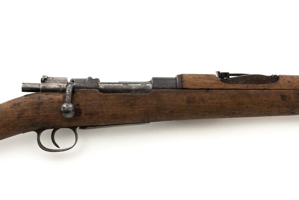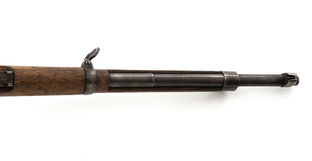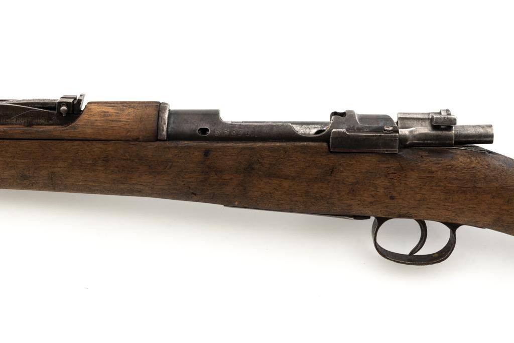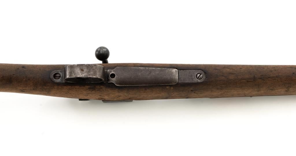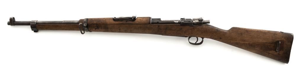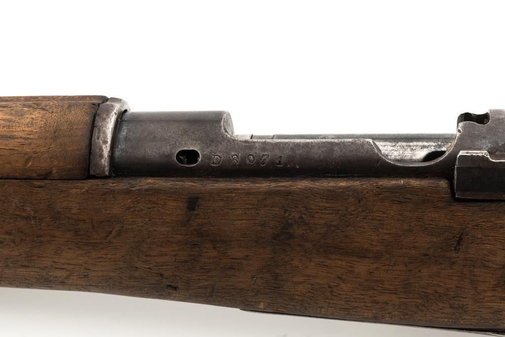 Spanish M1916 Mauser Bolt Action Rifle, #D8071, 7x57mm cal., 22" barrel, blued finish, hardwood stock and handguard, inverted-"V" front sight, and adjustable tangent rear sight with "V"-notched groove, graduated to 2000 meters. No cleaning rod. Numbers do not match. Import marked on right side of the barrel. Condition overall is good, retaining approx. 20%-25% blue, showing mostly brown toning. Right side sight protector is bent to the left. Wood with general dents, scratches, and the finish is rough. Action functions well. Bore rates good, with defined rifling. Est.: $200-$300. (C&R)