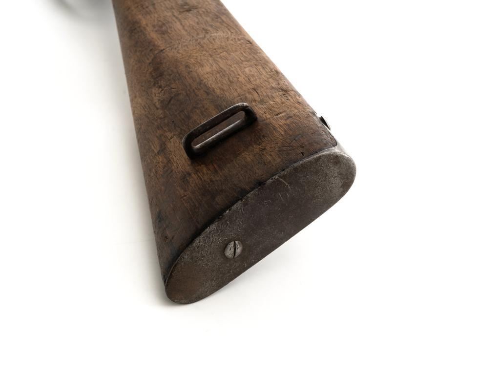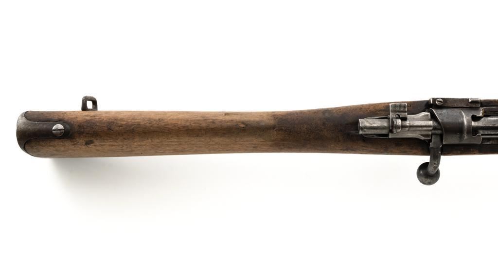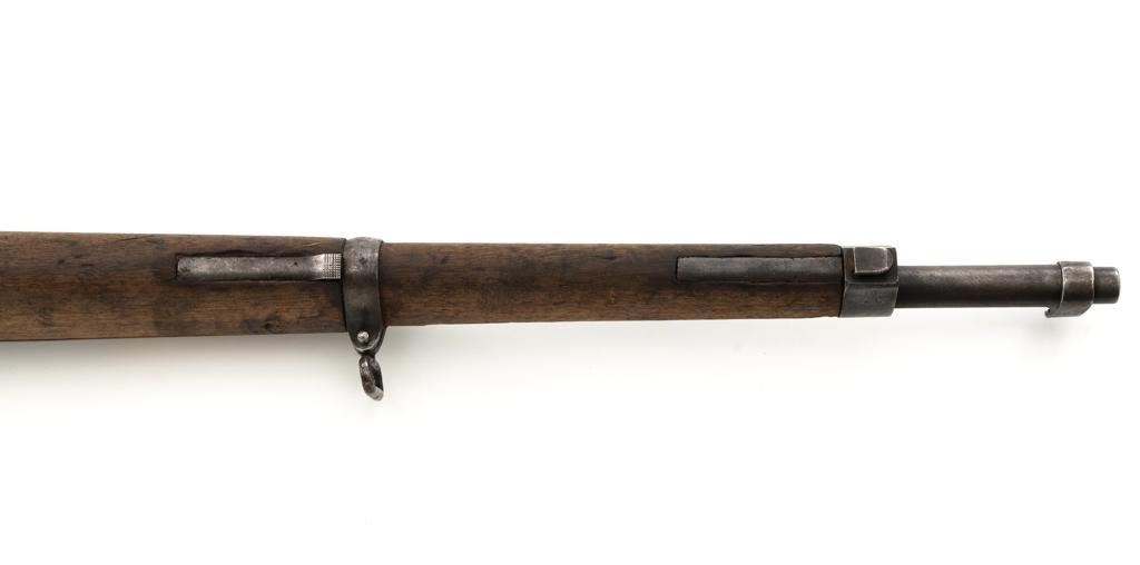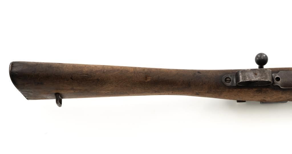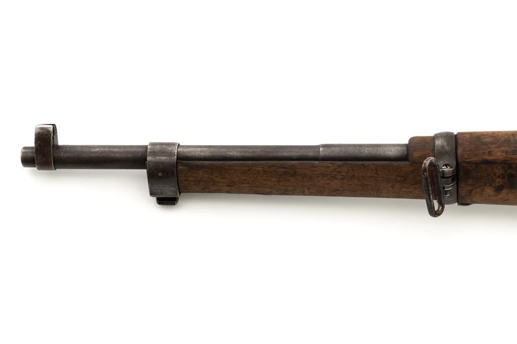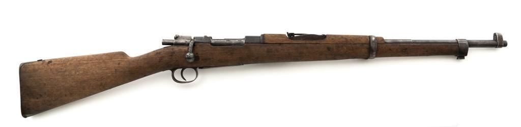 Spanish M1916 Mauser Bolt Action Rifle, #D8071, 7x57mm cal., 22" barrel, blued finish, hardwood stock and handguard, inverted-"V" front sight, and adjustable tangent rear sight with "V"-notched groove, graduated to 2000 meters. No cleaning rod. Numbers do not match. Import marked on right side of the barrel. Condition overall is good, retaining approx. 20%-25% blue, showing mostly brown toning. Right side sight protector is bent to the left. Wood with general dents, scratches, and the finish is rough. Action functions well. Bore rates good, with defined rifling. Est.: $200-$300. (C&R)