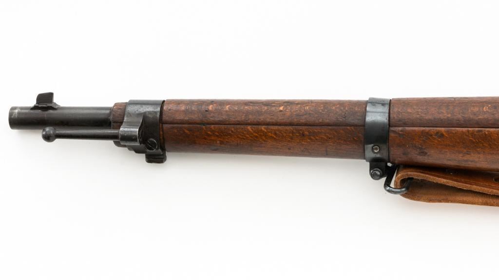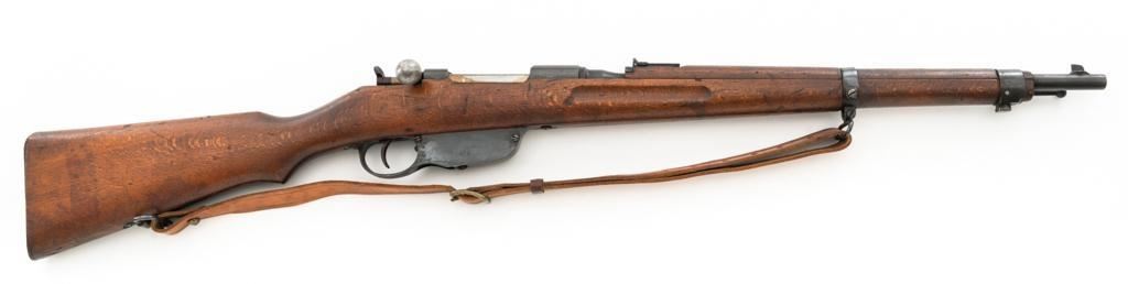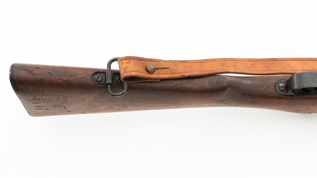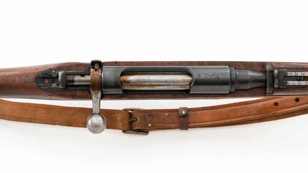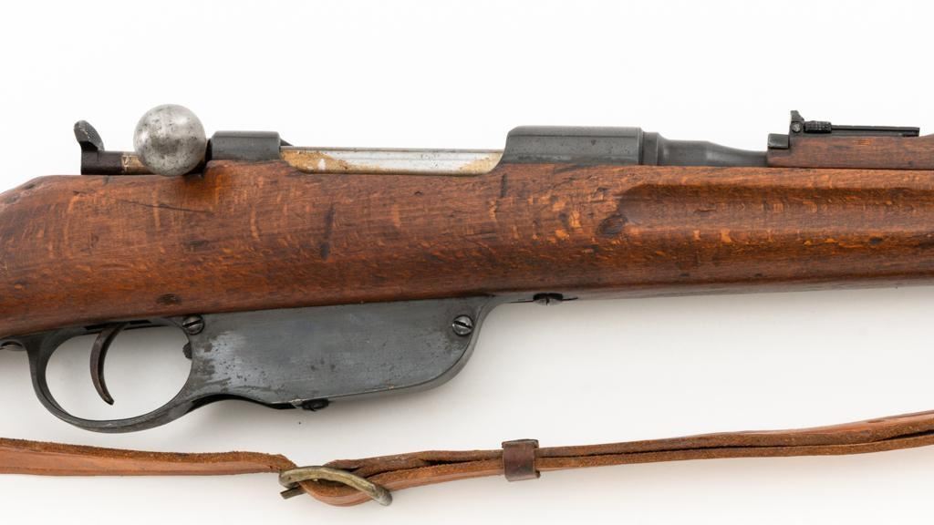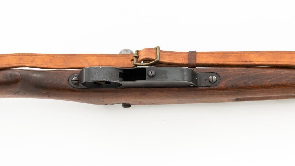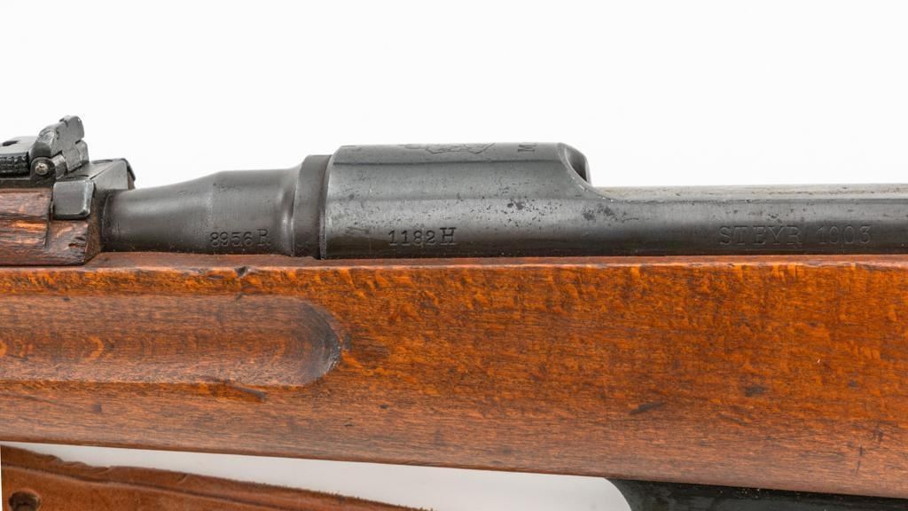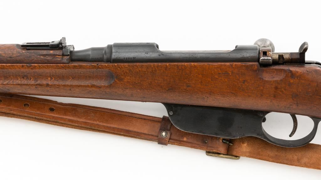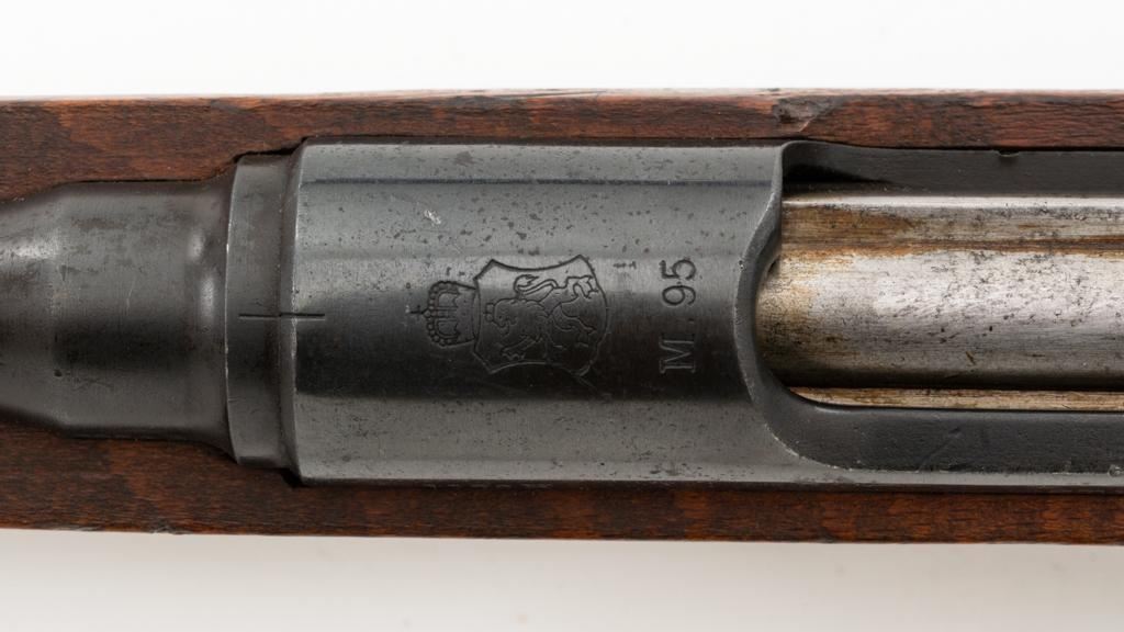 Bulgarian M95 Mannlicher Straight Pull Short Rifle, #1182H, 8x50Rmm cal., 20"barrel, blued finish, hardwood stock and handguard, dovetailed inverted-"V" front sight, and adjustable folding leaf rear sight with "V"-notched groove, graduated to 2400 meters. Includes a tan colored leather sling, in good used condition. Top of the receiver ring is marked with crowned Bulgarian crest over "M.95". Buttstock is numbered but does not match. No visible import marks. Condition overall is very good as arsenal reconditioned, retaining approx. 80%-85% blue, with wear around the muzzle, fine frosting to the receiver, and patina to the magazine and buttplate. Wood is good showing handling marks, crack at the buttplate tang, and an old chip to left side of the handguard. Action operates smoothly. Bore is bright with very good rifling. Est.: $250-$400. (C&R)