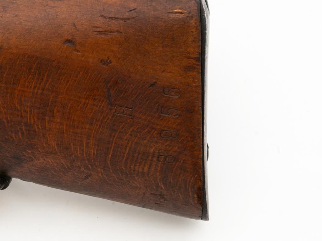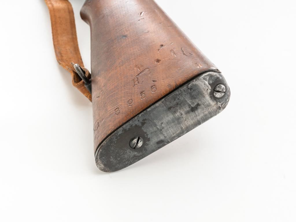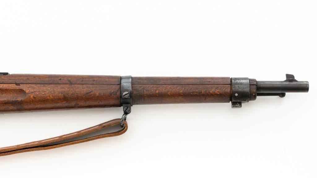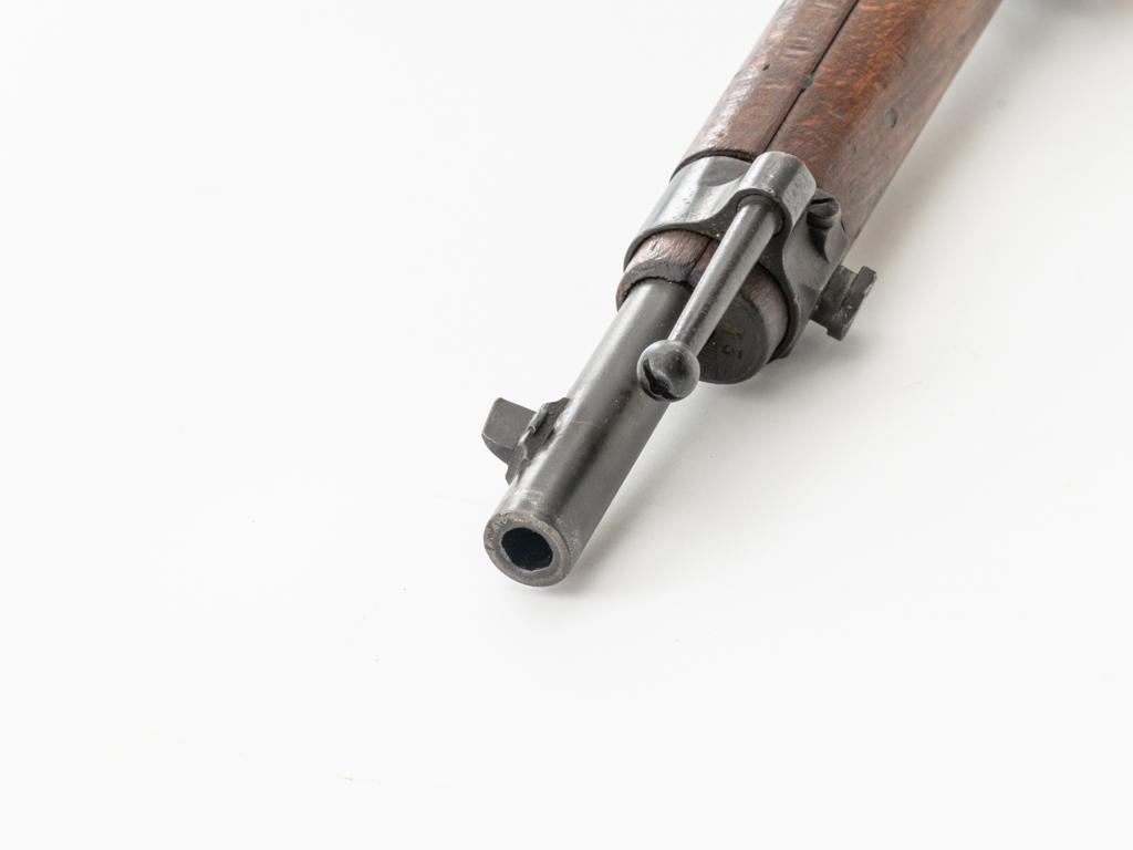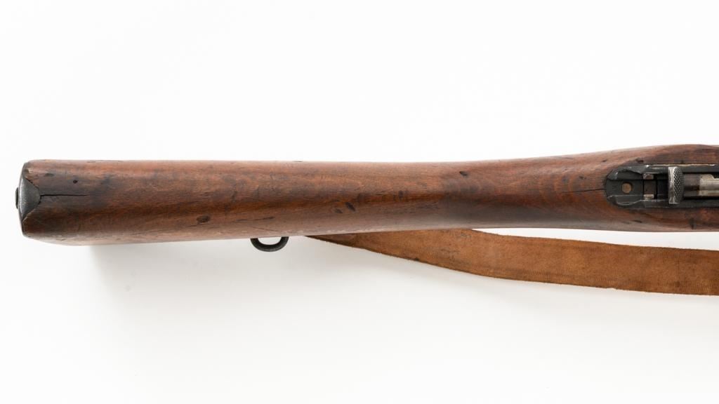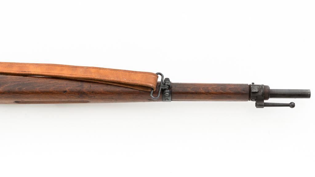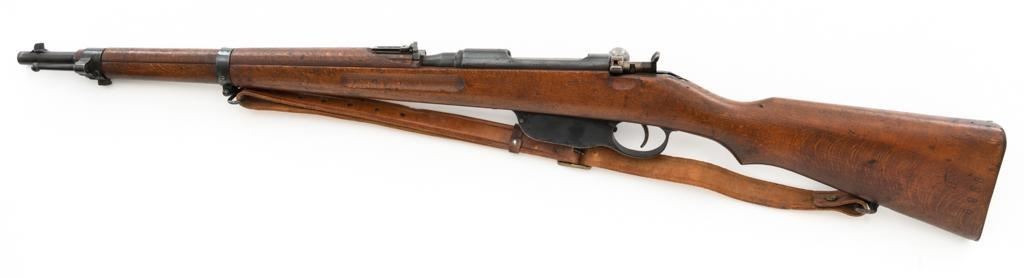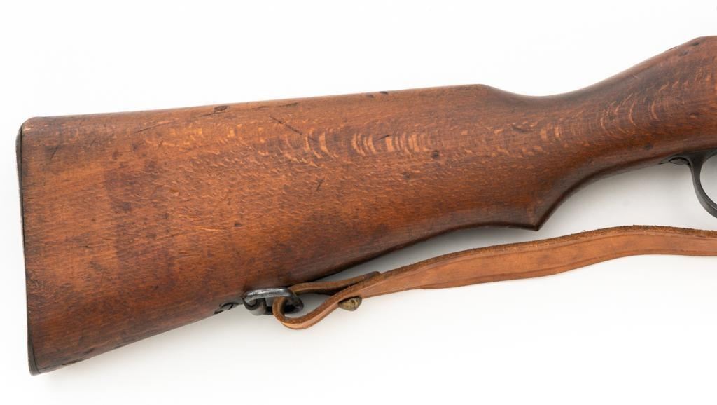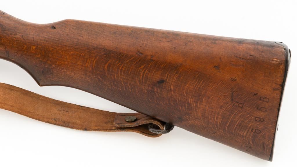 Bulgarian M95 Mannlicher Straight Pull Short Rifle, #1182H, 8x50Rmm cal., 20"barrel, blued finish, hardwood stock and handguard, dovetailed inverted-"V" front sight, and adjustable folding leaf rear sight with "V"-notched groove, graduated to 2400 meters. Includes a tan colored leather sling, in good used condition. Top of the receiver ring is marked with crowned Bulgarian crest over "M.95". Buttstock is numbered but does not match. No visible import marks. Condition overall is very good as arsenal reconditioned, retaining approx. 80%-85% blue, with wear around the muzzle, fine frosting to the receiver, and patina to the magazine and buttplate. Wood is good showing handling marks, crack at the buttplate tang, and an old chip to left side of the handguard. Action operates smoothly. Bore is bright with very good rifling. Est.: $250-$400. (C&R)