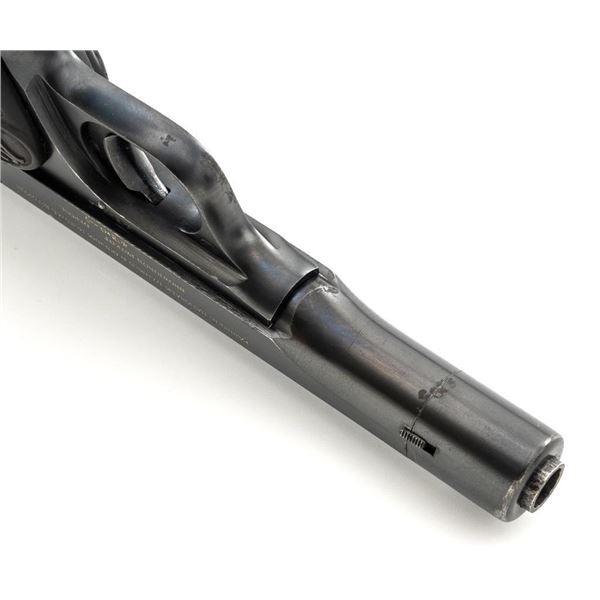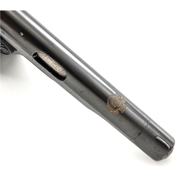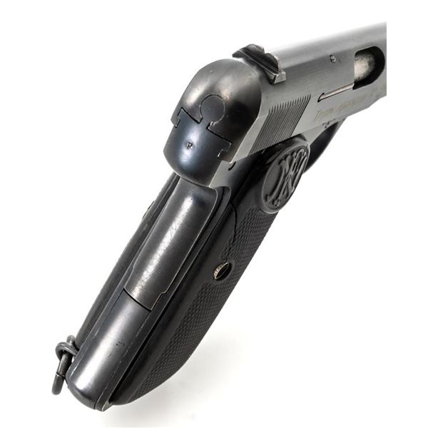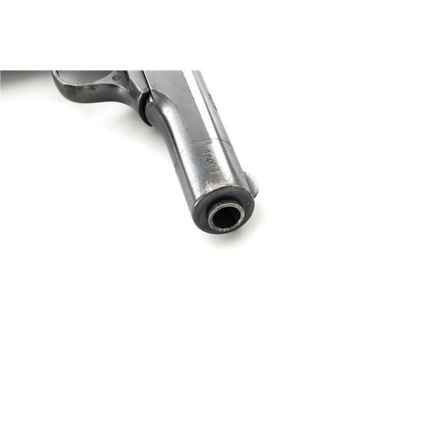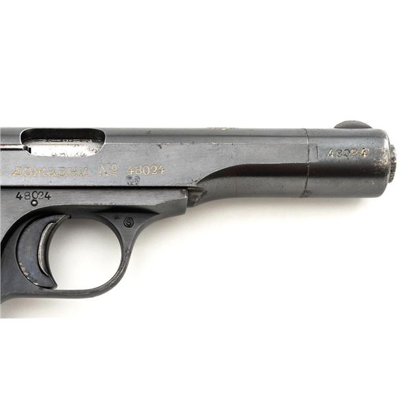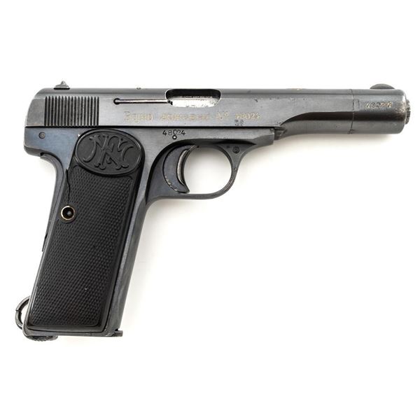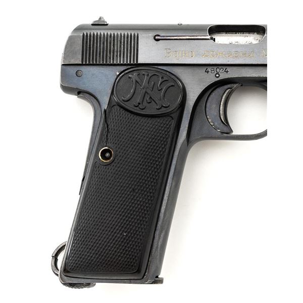 Yugoslavian Contract FN 1922 Semi-Automatic Pistol. #48024, .380 ACP cal., 4.5" barrel, blued finish, black plastic grips embossed with "FN" logos on each side. blade front sight, fixed rear sight with "V"-notched groove, and loose lanyard ring on left side of the frame. Includes one blued magazine, "(FN logo)/9 MM" on the right side. Pistol is marked "FABRIQUE NATIONALE DARMES de GUERRE HERSTAL BELGIQUE/BROWNINGS PATENT DEPOSE" on left side of the slide, with Cyrillic "BOJHO APKABHN" (War Department) on the right side. There is a crowned "(Yugoslavian crest)" on top of the slide. There are Belgian proof and inspection stamps on the frame, slide, and barrel. Matching numbers. Condition overall is very good, retaining approx. 90% blue, showing toning and light handling marks. There are several small impressions on left side of the slide. Both grips are cracked. Action operates smoothly. Bore rates good overall with defined rifling and may improve with thorough cleaning. Est.: $300-$500. (C&R/PPT)
