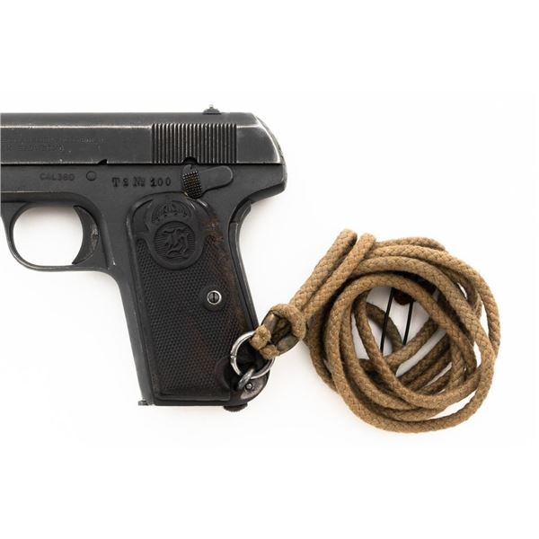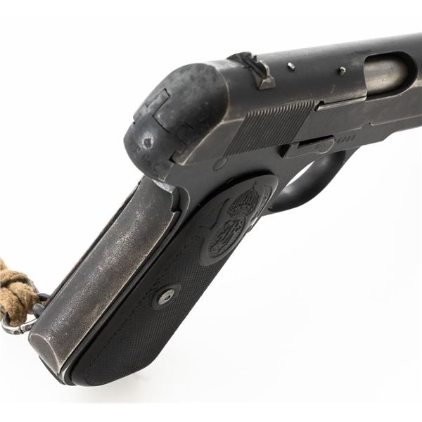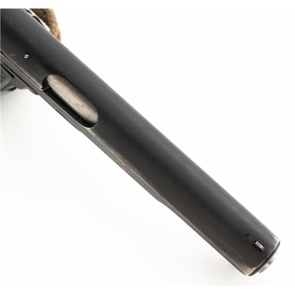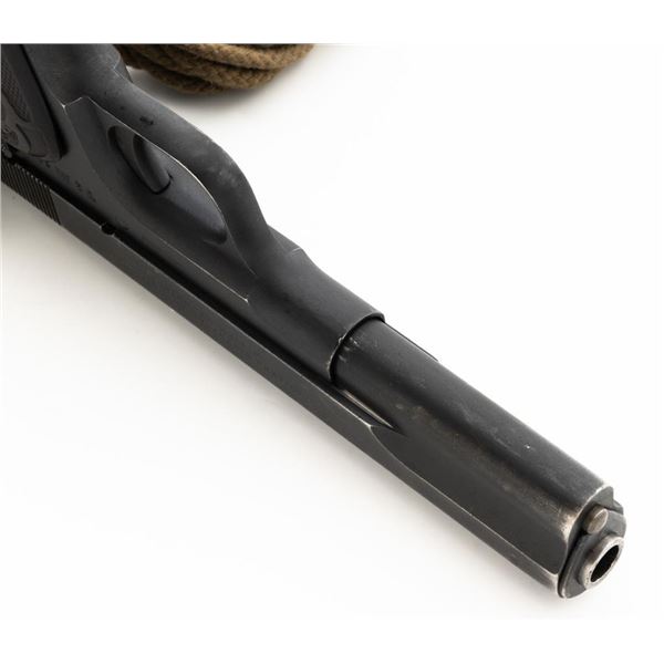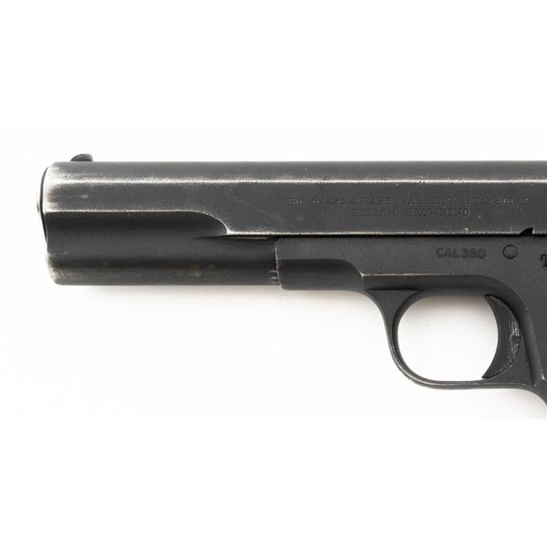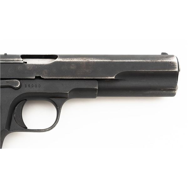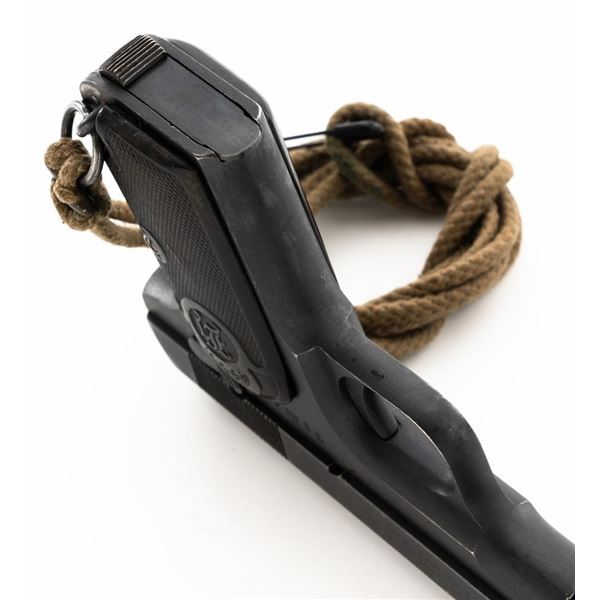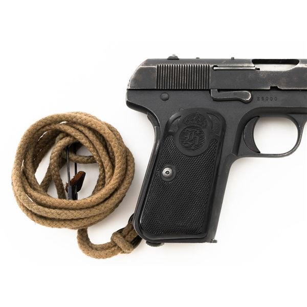 Unit Marked Swedish M1907 Semi-Automatic Pistol, #26000, .380 Auto cal., 5" barrel, blued finish, checkered black plastic grips embossed with Crowned Husqvarna logos on each side, blade front sight, fixed rear sight with "U"-notched groove, and lanyard ring at left side of the frame, with tan colored lanyard. Includes one unmarked blued steel magazine. Pistol is marked left side of the slide with second type logo "HUSQVARNA VAPENFABRIKS AKTIEBOLAG/SYSTEM BROWNING". Frame is stamped "T2 No.100", indicating issue to the Swedish army Service Regiment #2, weapon #100. Rear of the frame is stamped "(crown)TT./HK". Condition overall is very good+, retaining approx. 80% blue, showing wear to the slide and toning to the grip straps. Left grip is in fair condition with cracks and roughness along the rear edge. Right side grip may be a more modern reproduction, and is in near excellent condition. Action operates smoothly. Bore is bright with good, clear rifling. Est.:$350-$500. (C&R/PPT)
