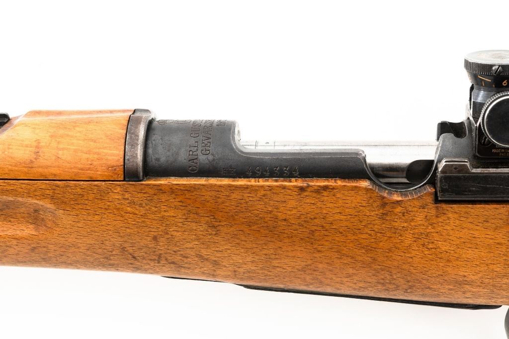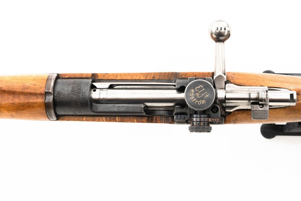 Swedish Model 1896 Mauser Bolt Action Rifle, #494334, 6.5x55mm cal., 29.5" barrel, blued finish with bright bolt assembly, hardwood stock and handguard. Issue sights removed now fitted with globe type front sight with insert and rear aperture sight, marked "Elit/m/Edstrom". Target sight is in good used condition and functions properly. With steel cleaning rod, cotton military sling, and three (3) excellent condition steel stripper clips. Sling is in good used condition. Top of the receiver ring is marked with Swedish crest over "CARL GUSTAFFS STADS/GEVARSFAKTORI/1921". Matching numbers. No visible import marks. Condition overall is very good, retaining approx. 85% blue, showing areas of thinning and toning, frosting across the barrel and receiver. Bolt assembly is in excellent condition. Wood has been sanded and stained, now in very good condition, with light handling marks. The rear sling swivel, buttstock brass disc, and range scale have been removed. Action operates smoothly. Bore is bright with very good, clearly defined rifling. Est.: $300-$500. (C&R)