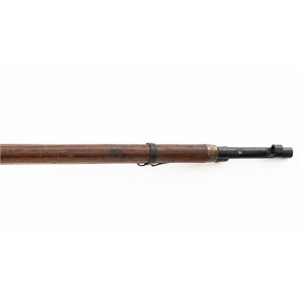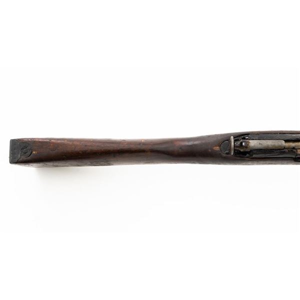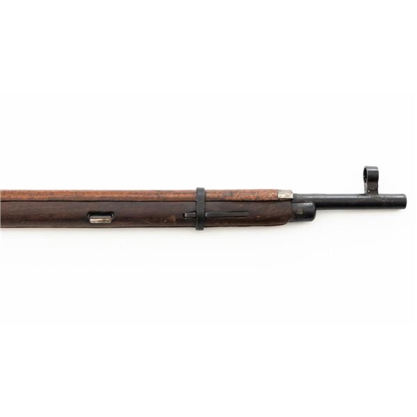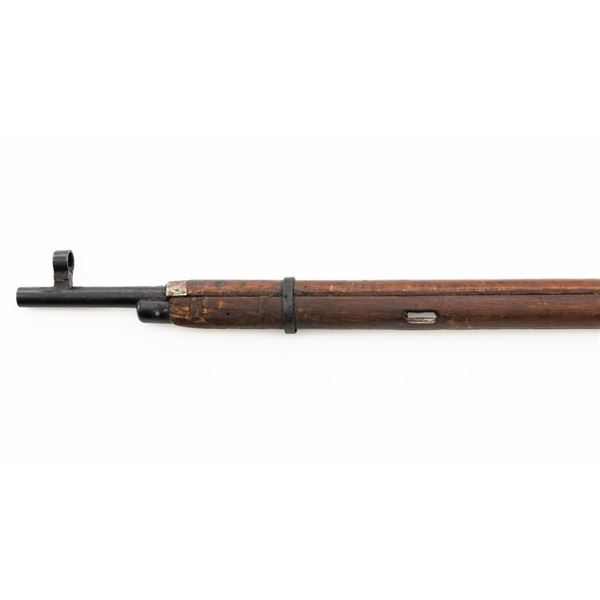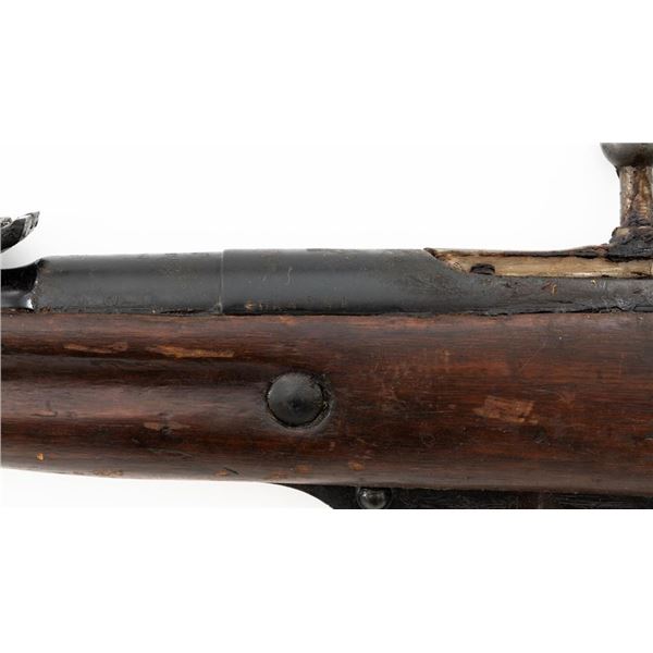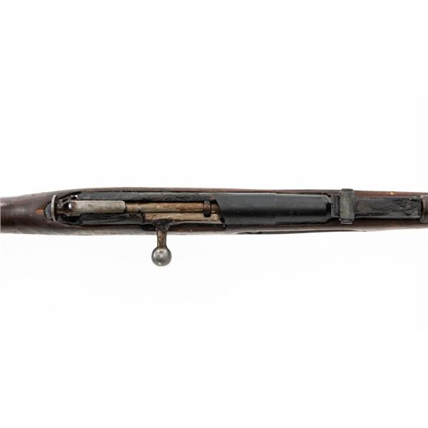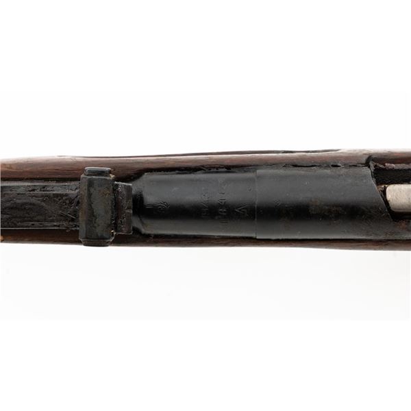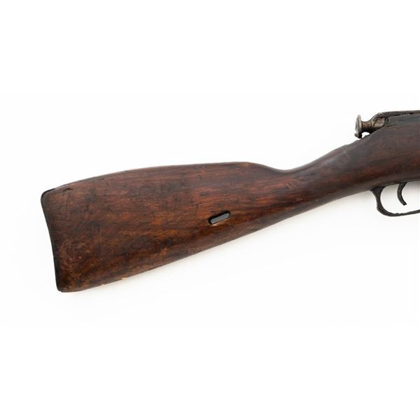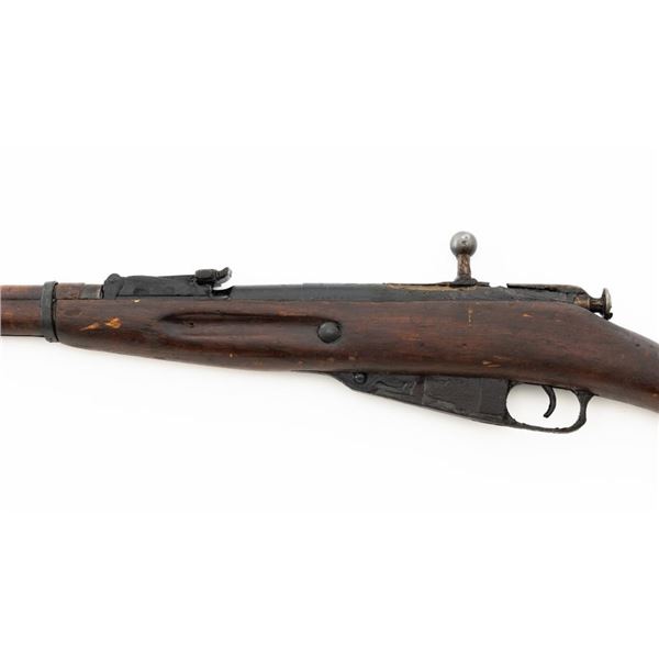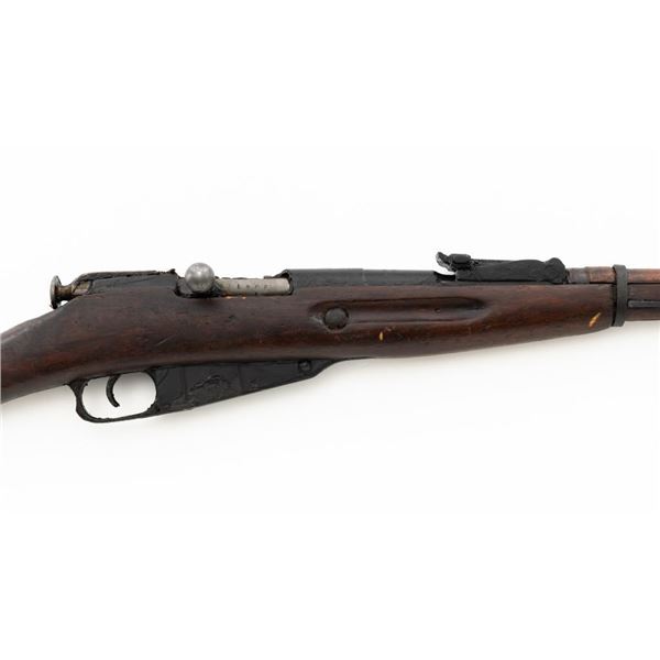 Soviet M91/30 Mosin Nagant Bolt Action Rifle, #SHA4641, 7.62x54Rmm cal., 29" barrel, blued finish with bright bolt assembly, hardwood stock and handguard, hooded post front sight, and adjustable tangent rear sight with "U"-notched groove, graduated to 2000 meters. Steel cleaning rod is missing. Top of the barrel shank marked with "(Soviet crest)" over "1943r/SHA4641/(Izhevsk Arsenal symbol)". A duplicate serial number is stamped on left side of the receiver. Matching visible numbers. Import marked on right side of the barrel. Rifle is covered in heavy arsenal grease and the metal appears to be in very good overall condition, retaining most of its finish, showing light wear to the barrel. Bolt assembly has toned to a gray color. Wood appears to be in good condition, showing scattered impressions and scratches to the dark finish. Action operates smoothly. Bore is greased but appears very good. Est.: $250-$450. (C&R)