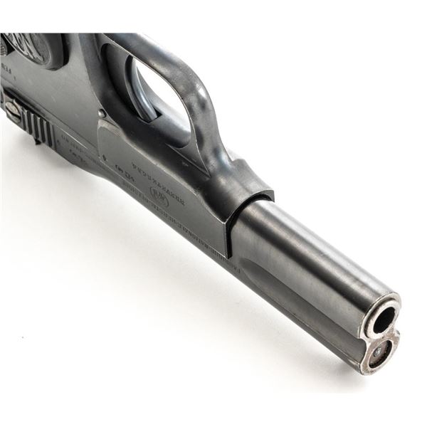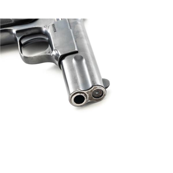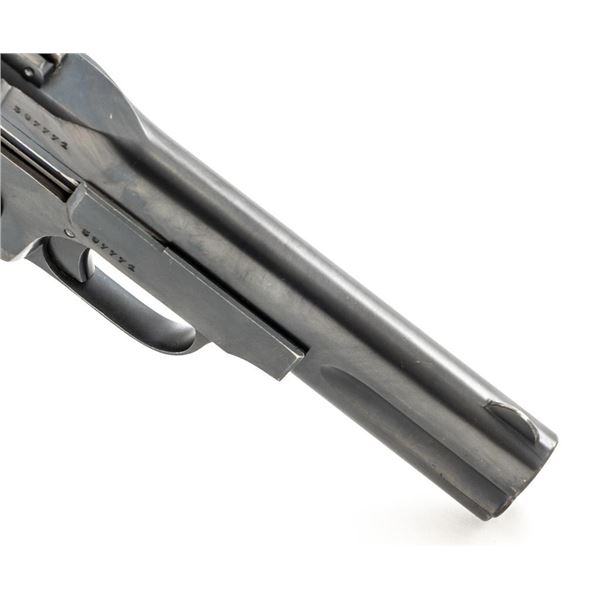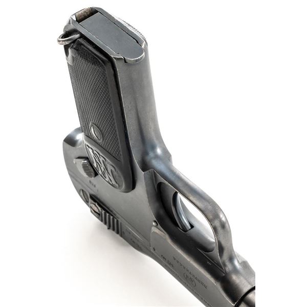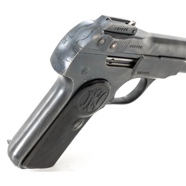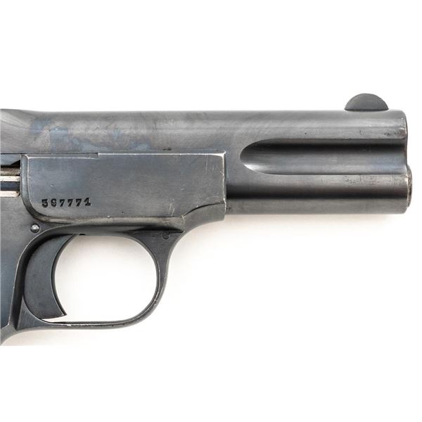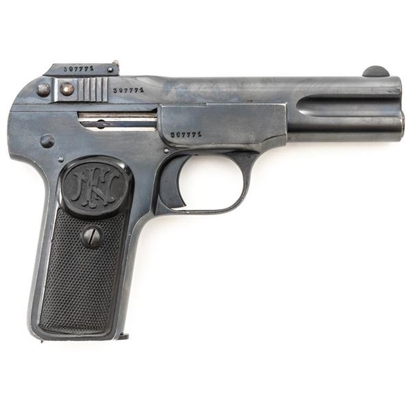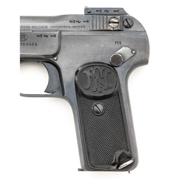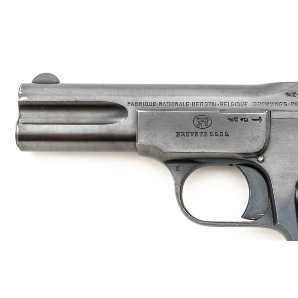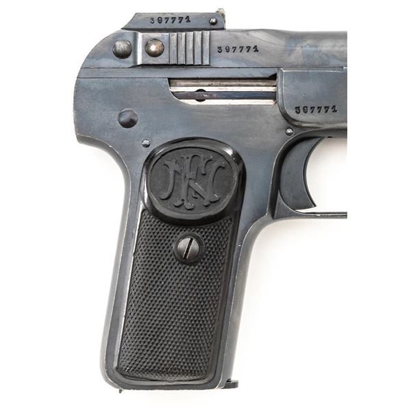 FN Browning M1900 Semi-Automatic Pistol, #397771, .32 ACP cal. 4"barrel, blued finish, checkered black plastic grips embossed with "FN" logos on each side, blade front sight, fixed rear sight with "V"-notched groove, and fixed steel lanyard loop is mounted to lower left side of the frame. Includes one unmarked blued steel magazine. Left side of the slide is marked "FABRIQUE-NATIONALE-HERSTAL-BELGIQUE(BROWNINGS PATENT)". Left side of the frame with "(Pistol logo)/FN/BREVETE-S.G.D.G.". There are Belgian proof and inspection stamps on left side of the frame and rear sight. Matching numbers on frame, slide, and rear sight. Condition overall is fine as reblued, retaining approx. 95% finish, with light wear around the muzzle, small impact marks and scratches to the rear of the slide. Grips are very good with light scratches and handling marks. Action operates smoothly. Bore is bright with very good rifling. Est.: $400-$600. (C&R/PPT)