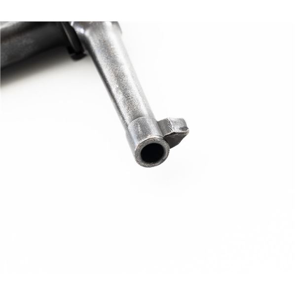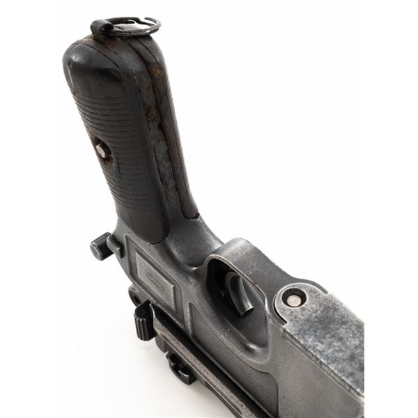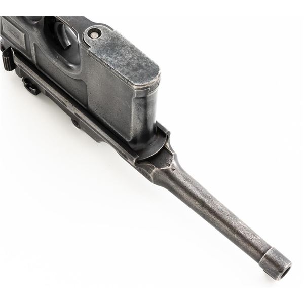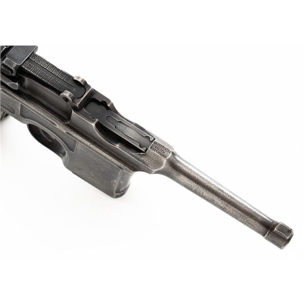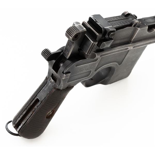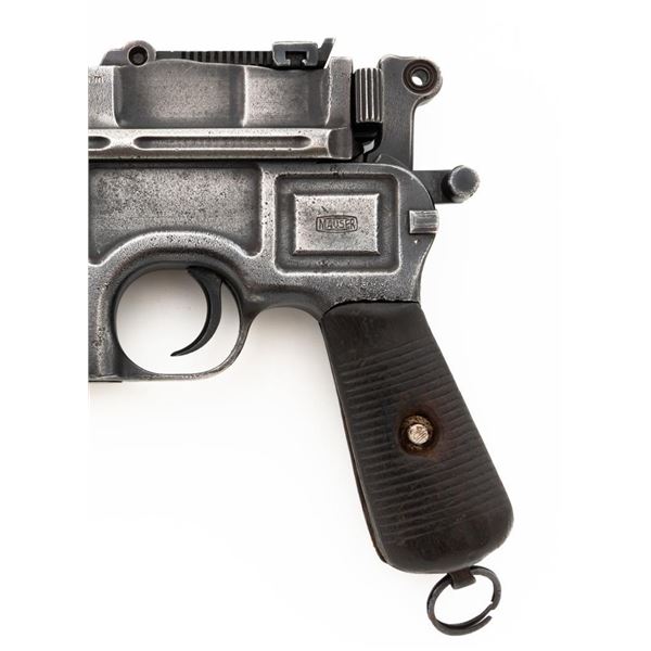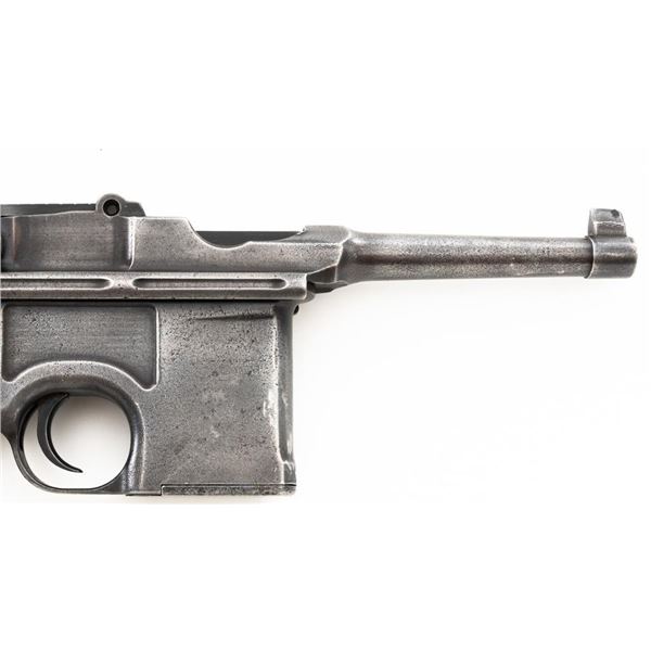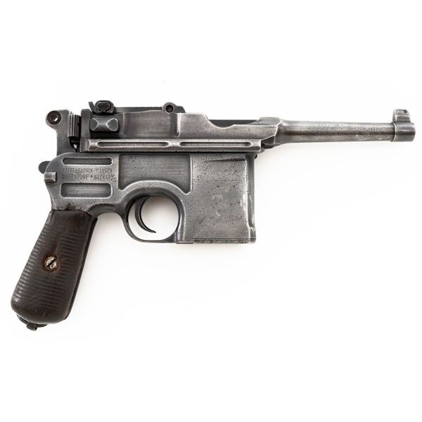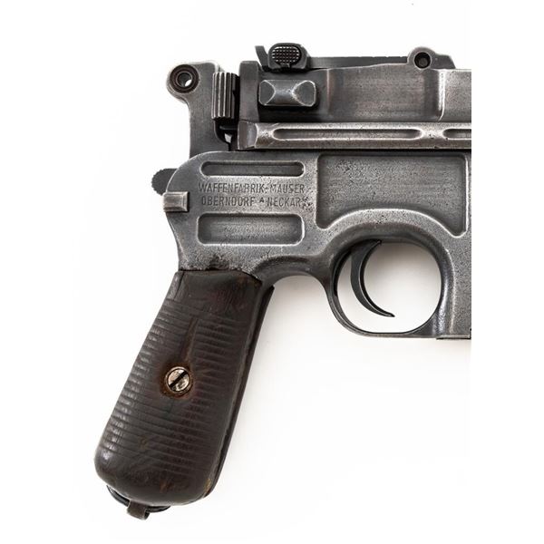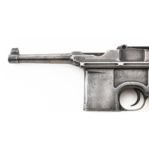 Mauser C96 Bolo Broomhandle Semi-Automatic Pistol, #613819,. 30 Mauser cal., 3.9"barrel, blued finish, grooved hardwood grips, inverted-"V" front sight, and adjustable tangent rear sight with "V"-notched groove, graduated to 1000 meters. Backstrap is slotted for a shoulder stock and a loose lanyard ring is mounted to the butt. Left side of the frame is marked with "MAUSER" logo. Top of the chamber and the right side of the frame are marked "WAFFENFABRIK MAUSER OBERNDORF A/N(A NECKAR". Matching numbered bolt. Import marked on the upper and lower left side of the frame. Condition overall is fair, retaining no finish. Metals shows signs of cleaning, general patina, and deep pitting around the grip. Grips with bruises, handling marks, and darkening. Grip screw is a non-standard replacement. Action operates smoothly. Bore rates poor, with pitting and worn rifling. Est.: $500-$700. (C&R/PPT)