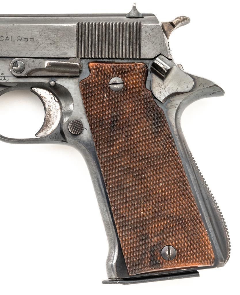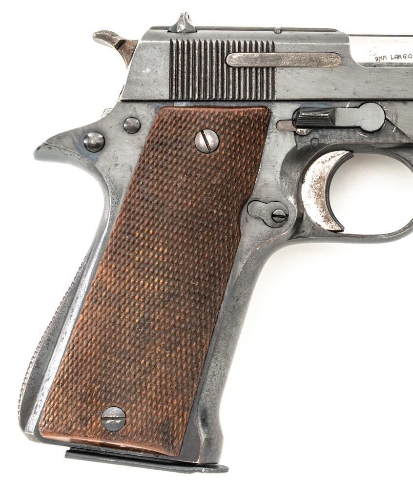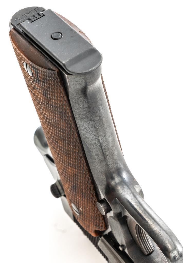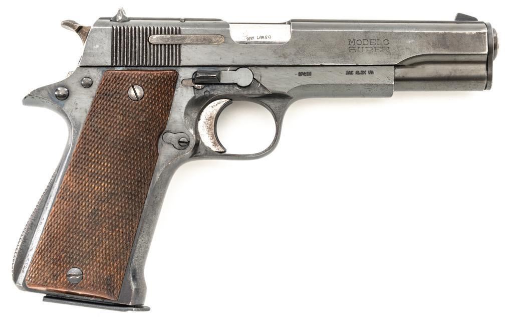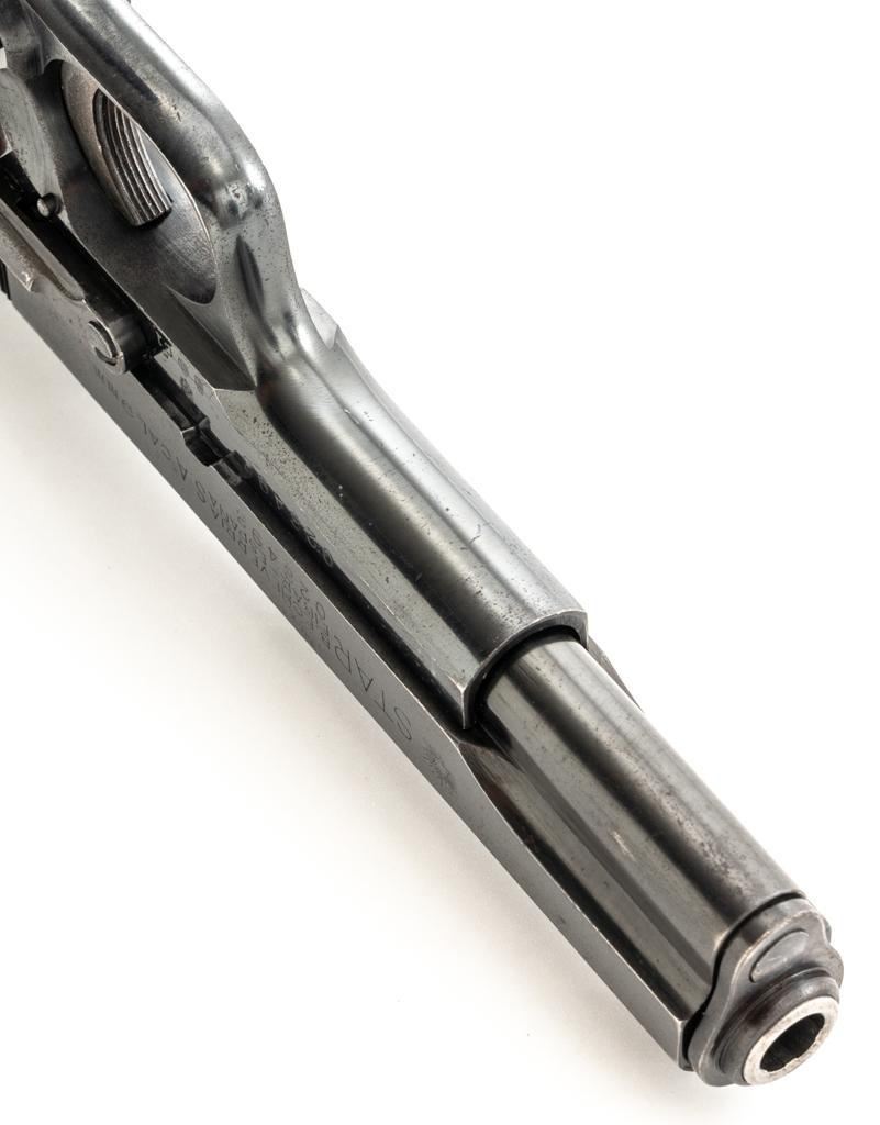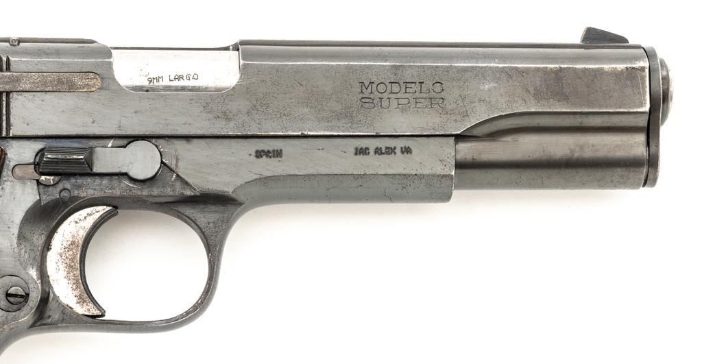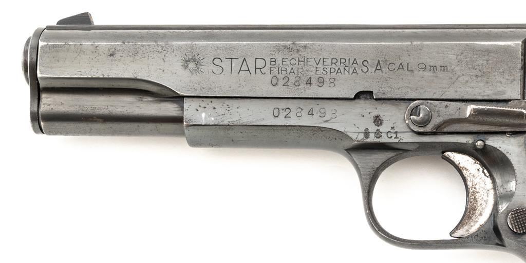 Star Modelo Super A Semi-Automatic Pistol, #530219, 9mm Largo cal., 5" barrel, blue finish, checkered walnut two-piece grips, white dot blade front sight, fixed square-notch rear sight, with one unmarked blue steel 9-round magazine. There are Spanish proofs on the left side of the frame, import marked "IAC" and "SPAIN" on the right side of the frame. Mfgd 1957. Pistol is in near fine overall condition, retaining approx. 92%-93% blue finish, with holster wear at the muzzle and along the slide. Additionally, there are light scratches and handling marks associated with use. Factory markings are clear. Grips are very good with some flattening of the checkering and light staining. Action functions well. Bore is very good with light frosting and defined rifling. Est.: $200-$350. (C&R/PPT)