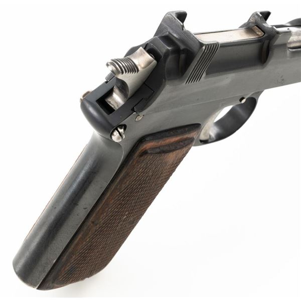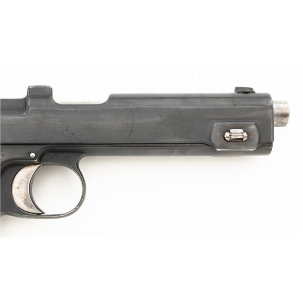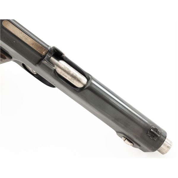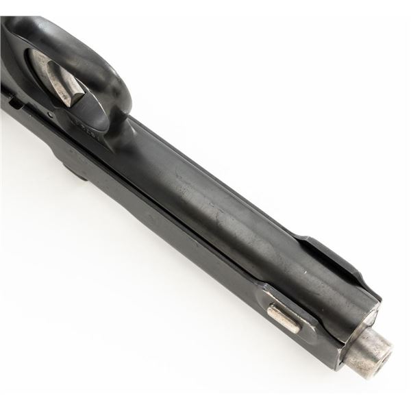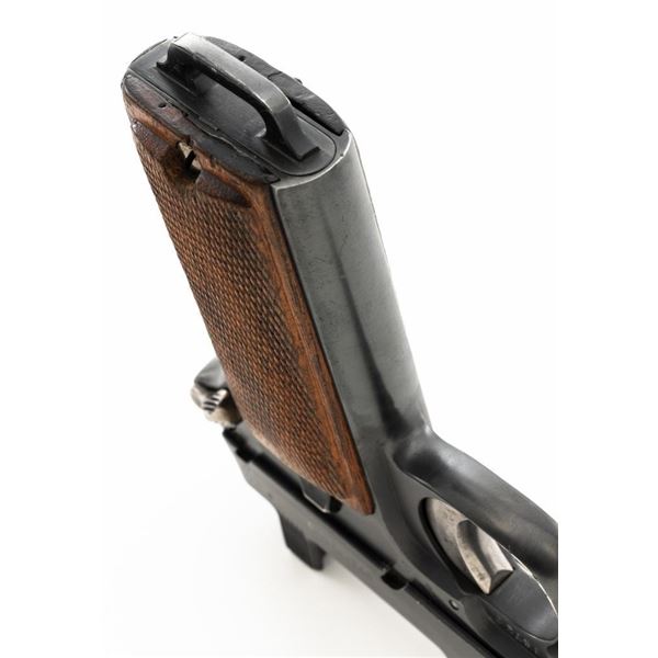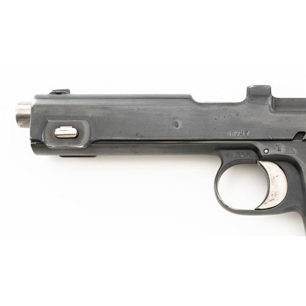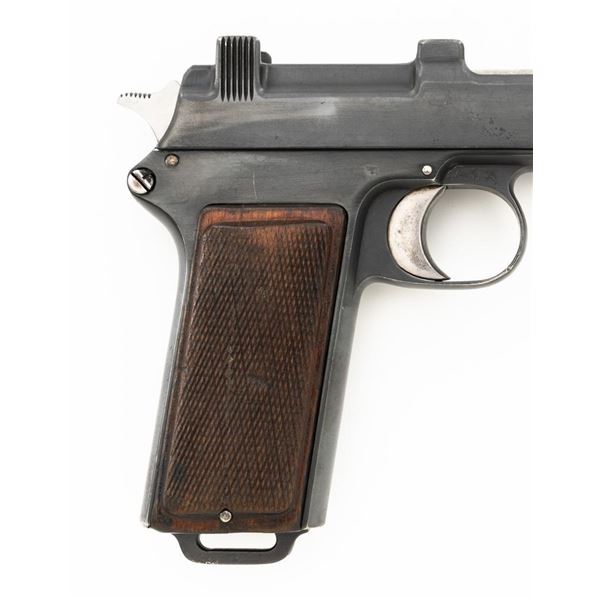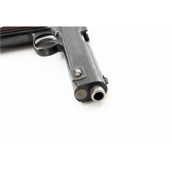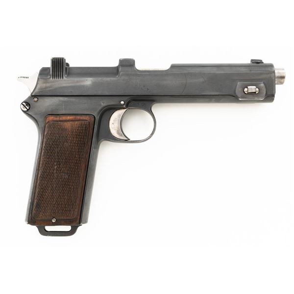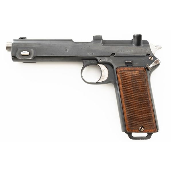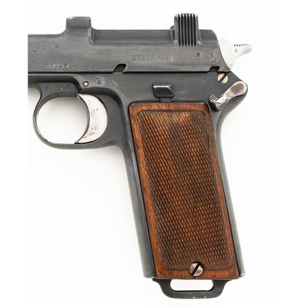 German WWII Police Issued Austrian M1912 Steyr Semi-Automatic Pistol with Holster, #8672f, 9x19mm cal., 5" barrel, blued finish with bright trigger and hammer, checkered varnished hardwood grips, dovetailed inverted-"V" front sight, fixed rear sight with "V"-notched groove, and fixed lanyard loop at bottom of the grip frame. Unmarked black leather holster is made for a different pistol with a detachable magazine. Holster is in very good condition, all stitching and fittings are present. Pistol is marked "STEYR 1914" on left side of the slide. Right side of the trigger guard with "W-n(Austro-Hungarian eagle)14". Right side of the frame is marked with a German WWII "(eagle)L" acceptance stamp and the left side "(eagle)N" proof mark. Matching numbers on frame and slide. No visible import marks. Condition overall is fine as refinished, retaining over 90% blue, which was applied over blemishes on the slide. Grips are good with wear to the checkering and general darkening, with a small crack to the top left grip. Action operates smoothly. Bore rates good with light frosting in the grooves, and defined rifling. Est:$700-$900. (C&R/PPT)