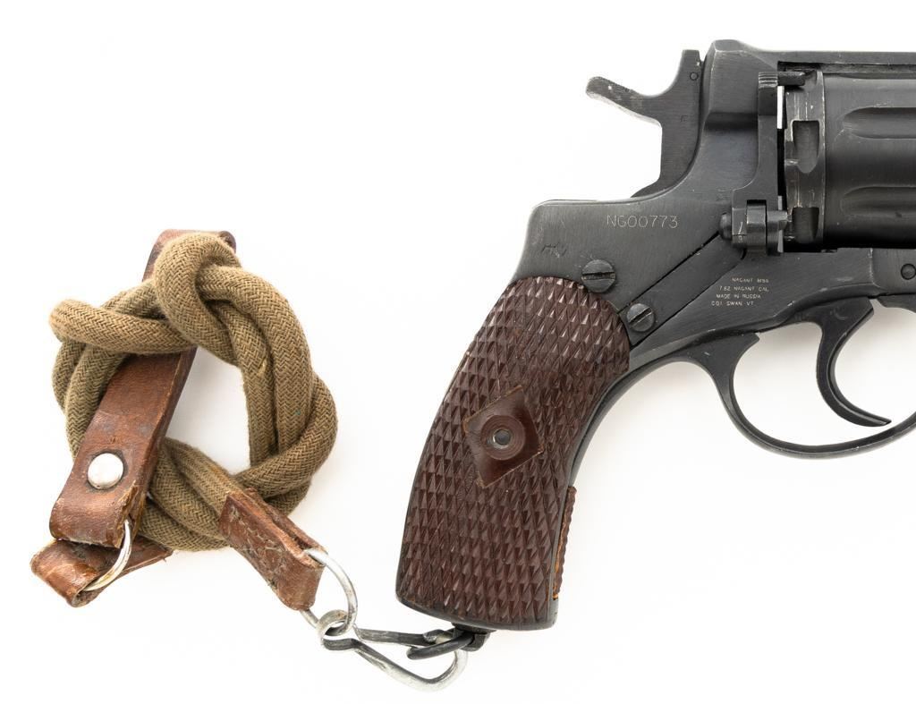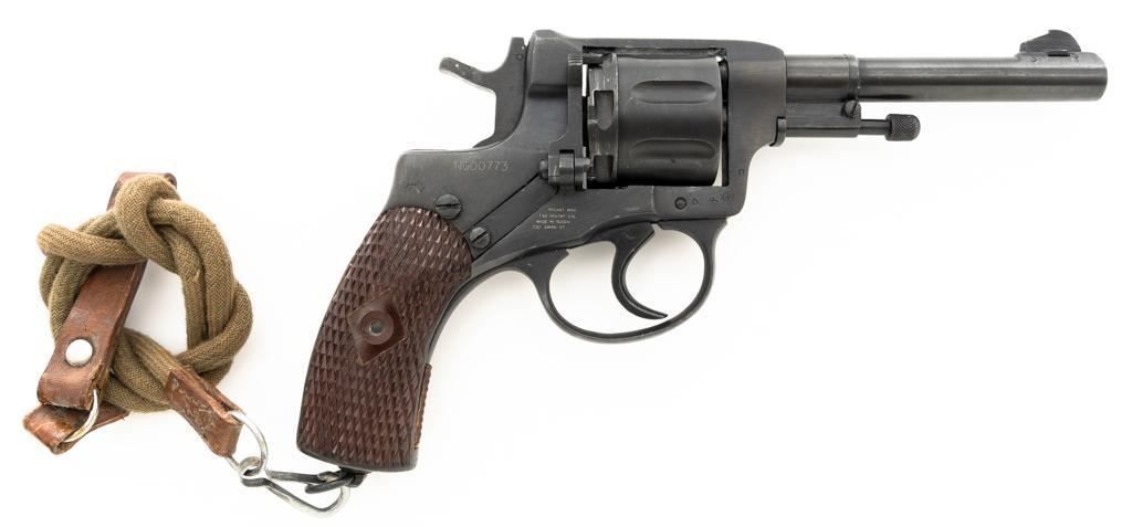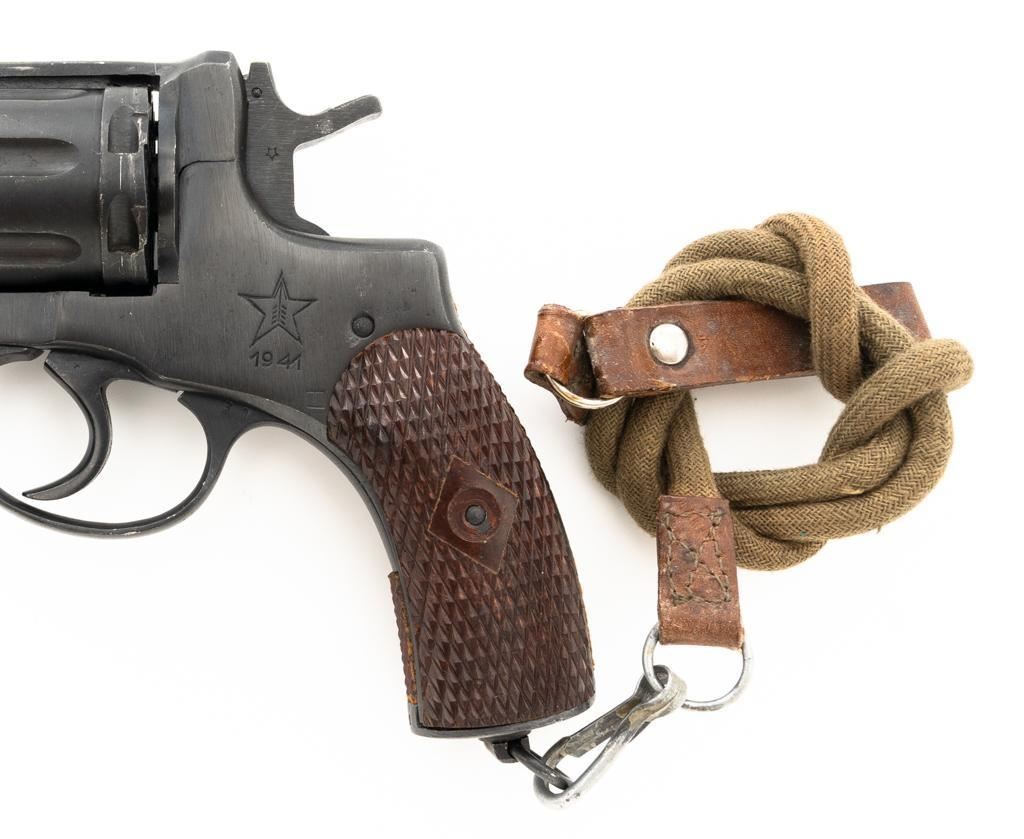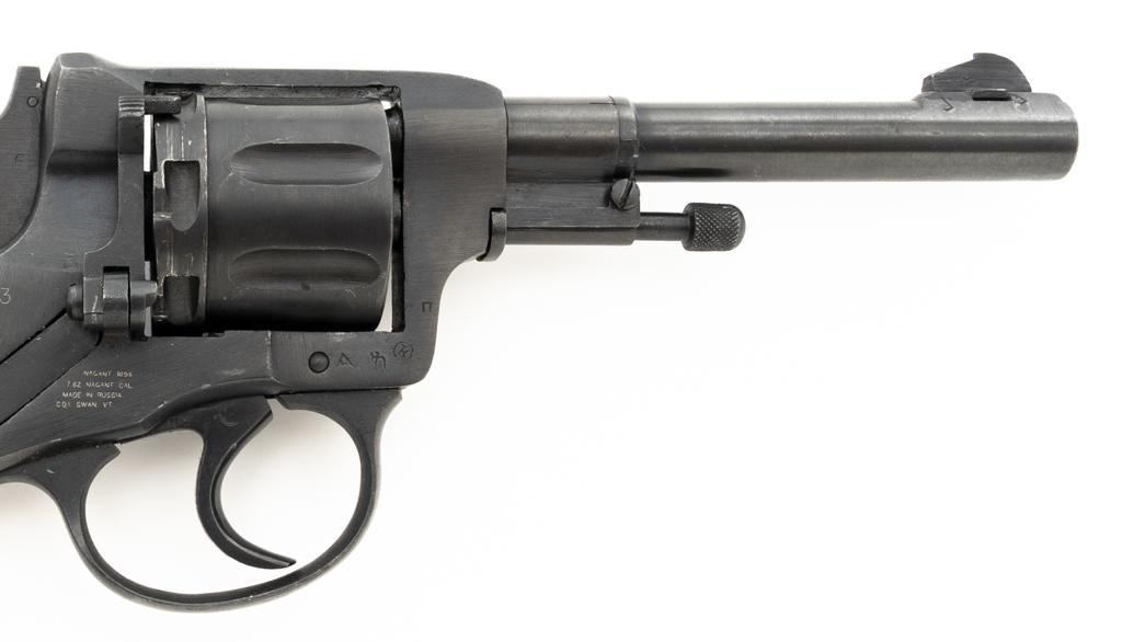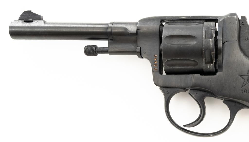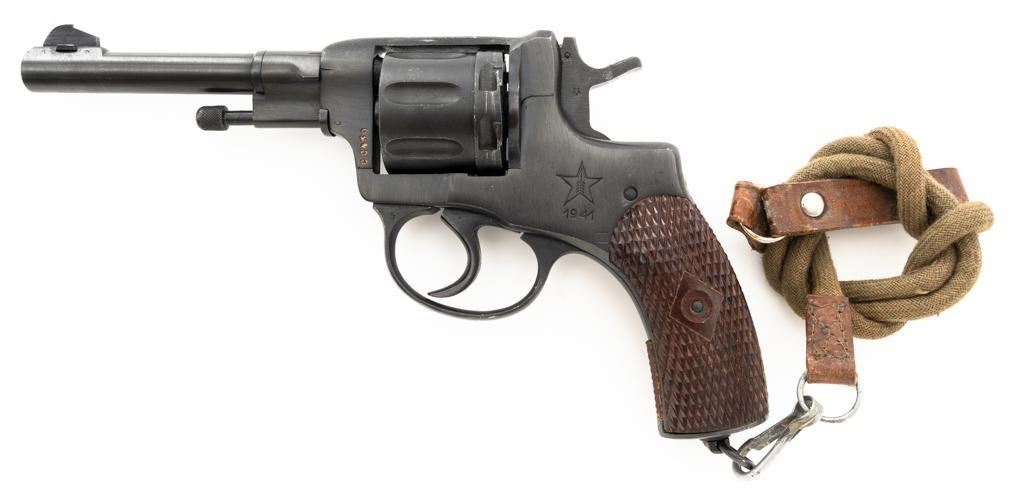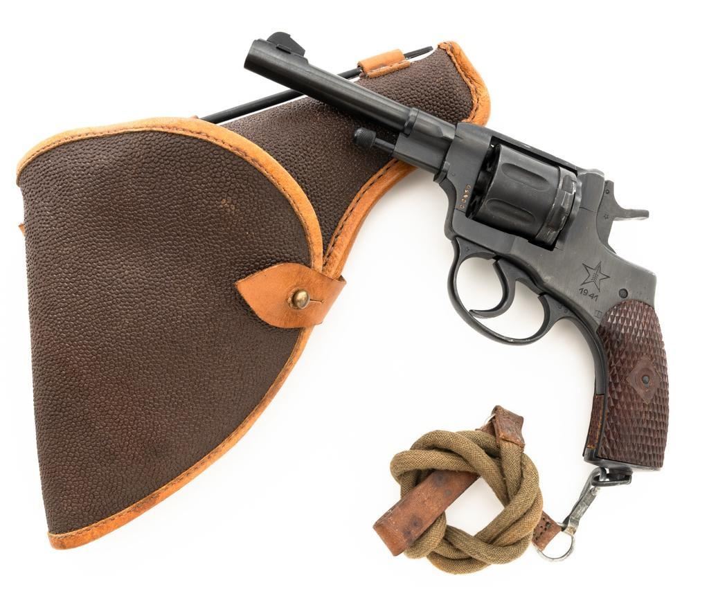 Soviet M1895 Nagant Double Action Revolver with Holster, #NGOO773, 7.62x38Rmm cal., 4.5" barrel, blued finish, checkered dark red plastic grips, dovetailed blade front sight, fixed rear sight with "U"-notched groove, and swiveling lanyard loop on bottom of the grip frame. Brown Soviet rubberized holster is ink marked "OTK 10 1955" under the flap. Holster is in very good condition, showing moderate wear, and a few spots of darkening. Includes a lanyard and steel cleaning rod. Revolver is marked with Tula Arsenal makers mark and "1941" on left side of the frame, with inspection stamps on the right side. Matching original numbers on cylinder and trigger. Importer applied serial number and information on right side of the frame. Condition overall is excellent as arsenal refinished, retaining approx. 97% blue, showing only light use and wear. Grips are also excellent. Action locks up, cycles, and extracts smoothly. Bright bore rates very good, with clearly defined rifling. Chambers are clean and bright. Est.: $300-$500. (C&R/PPT)
