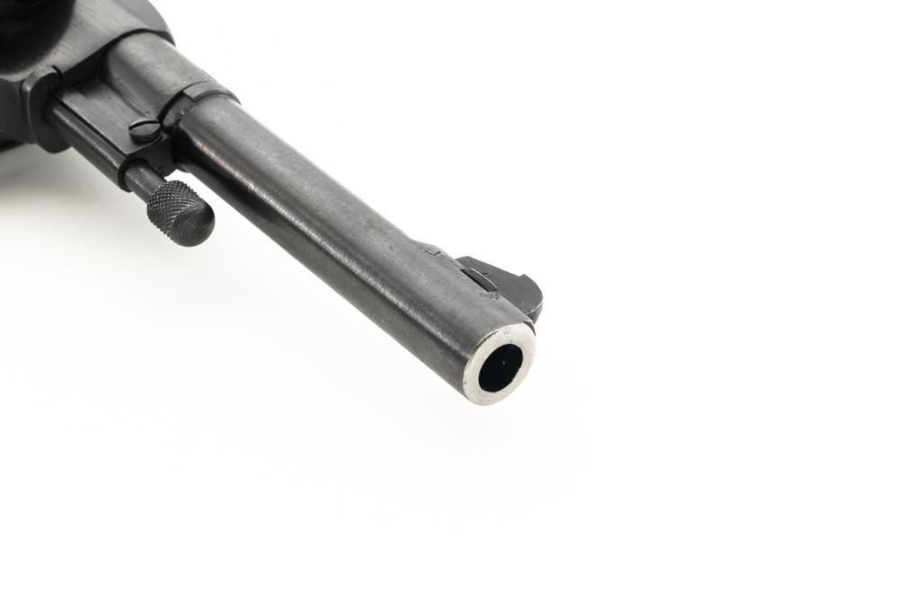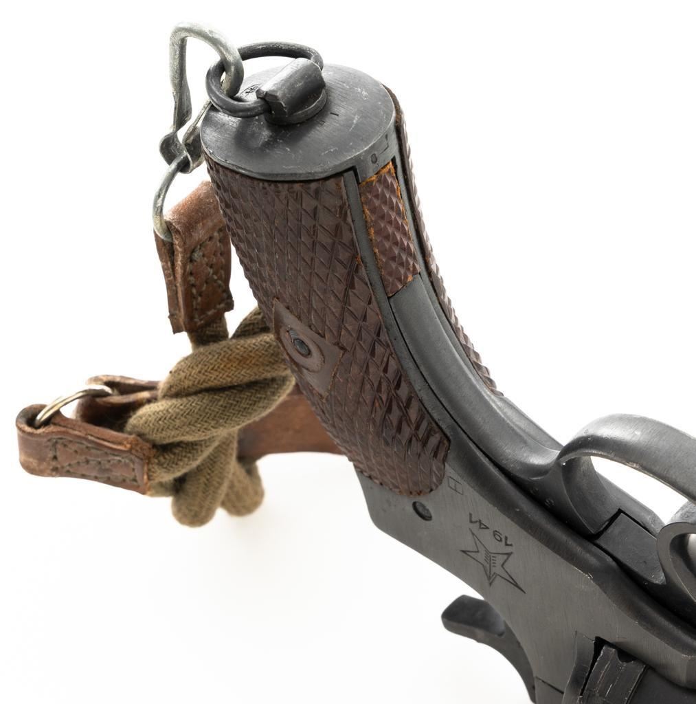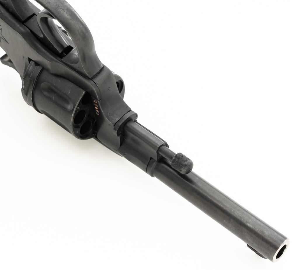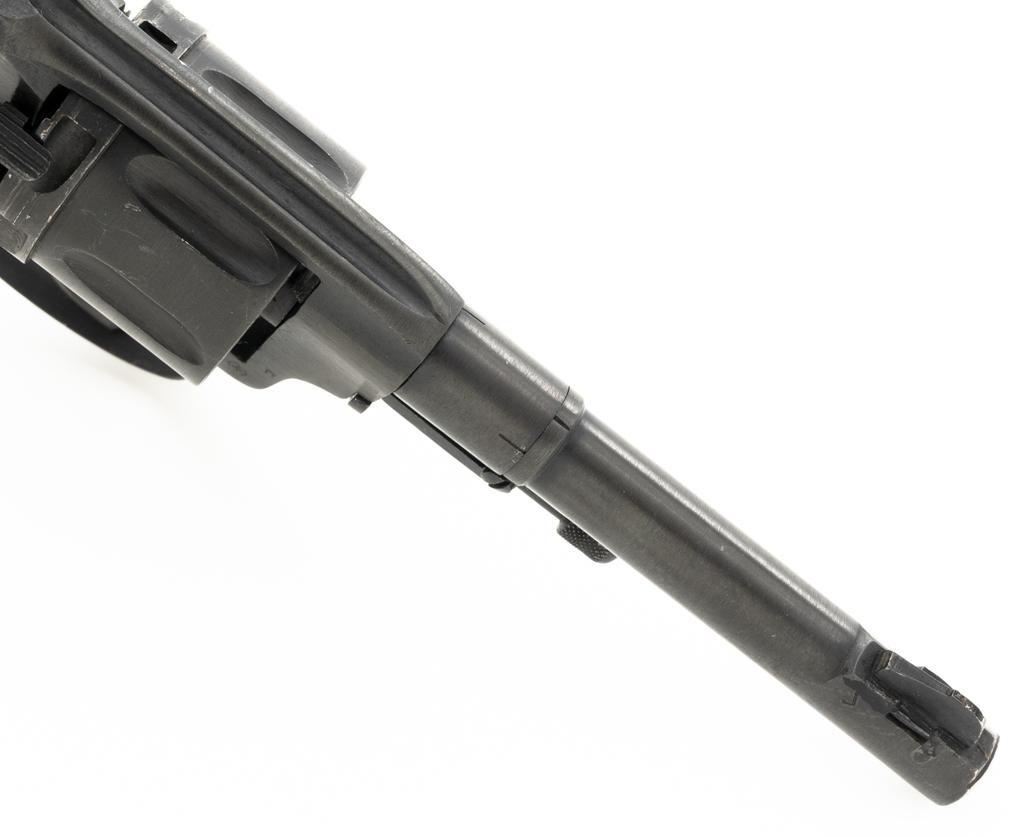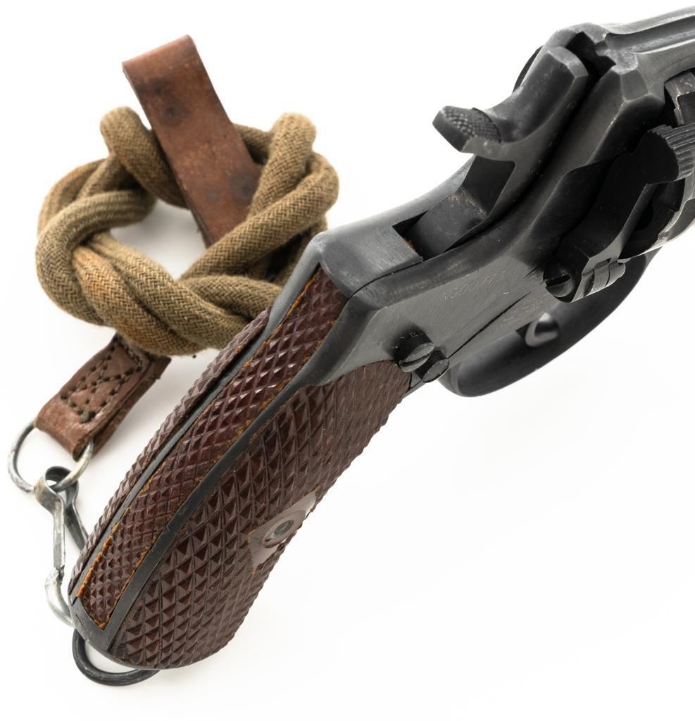 Soviet M1895 Nagant Double Action Revolver with Holster, #NGOO773, 7.62x38Rmm cal., 4.5" barrel, blued finish, checkered dark red plastic grips, dovetailed blade front sight, fixed rear sight with "U"-notched groove, and swiveling lanyard loop on bottom of the grip frame. Brown Soviet rubberized holster is ink marked "OTK 10 1955" under the flap. Holster is in very good condition, showing moderate wear, and a few spots of darkening. Includes a lanyard and steel cleaning rod. Revolver is marked with Tula Arsenal makers mark and "1941" on left side of the frame, with inspection stamps on the right side. Matching original numbers on cylinder and trigger. Importer applied serial number and information on right side of the frame. Condition overall is excellent as arsenal refinished, retaining approx. 97% blue, showing only light use and wear. Grips are also excellent. Action locks up, cycles, and extracts smoothly. Bright bore rates very good, with clearly defined rifling. Chambers are clean and bright. Est.: $300-$500. (C&R/PPT)