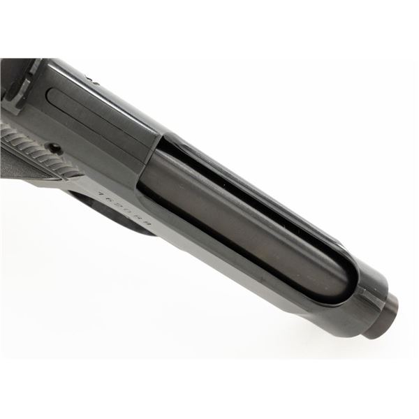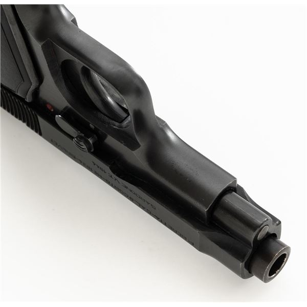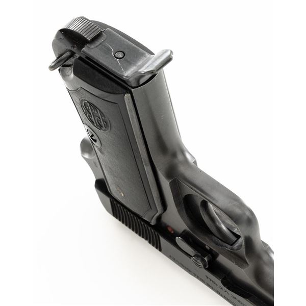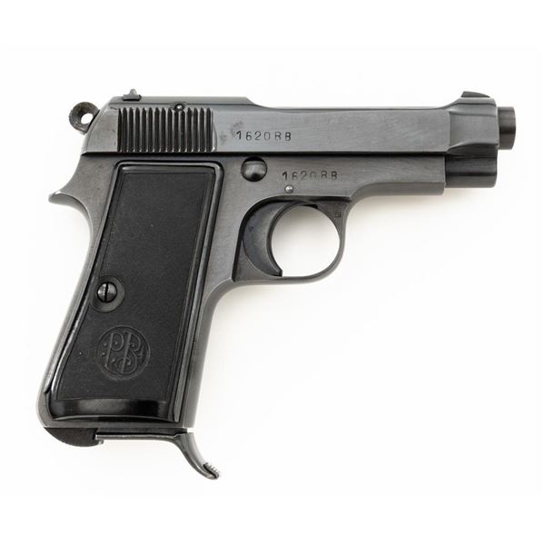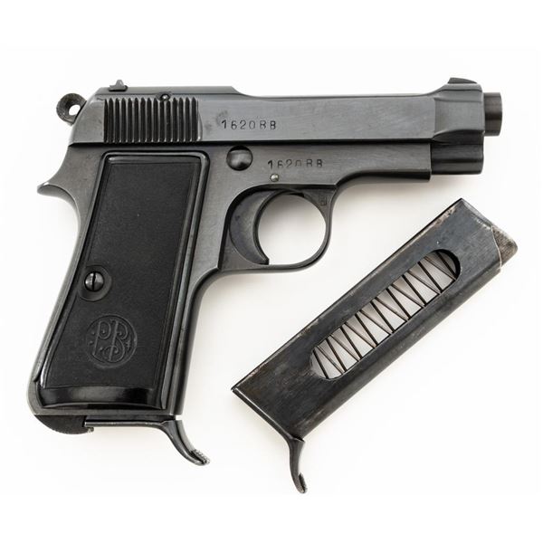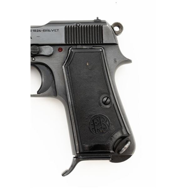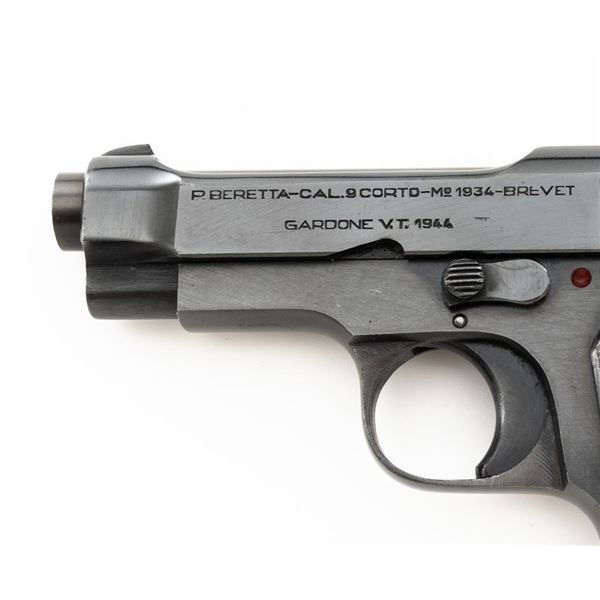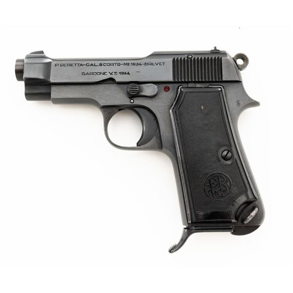 Beretta Model 1934 Semi-Automatic Pistol with Two (2) Magazines, #1620BB, .380 ACP cal., 3.5" barrel, blued finish, textured black plastic grips embossed with "PB" logos on both sides, blade front sight, fixed rear sight with square-notched groove, and fixed lanyard loop on left side of the frame. Both magazines are unmarked with blued finishes and finger extensions. Pistol is marked "P.BERETTA-CAL.9 CORTO-Mo 1934-BREVET/GARDONE V.T.1944" on left side of the slide. Matching numbers on frame and slide. No visible import marks. Condition overall near excellent, with the metal retaining almost all of its reblued finish. Grips with scattered light handling marks, mainly to the left side. Action operates smoothly. Bright bore rates excellent, with well-defined rifling. Est.: $250-$350. (C&R/PPT)