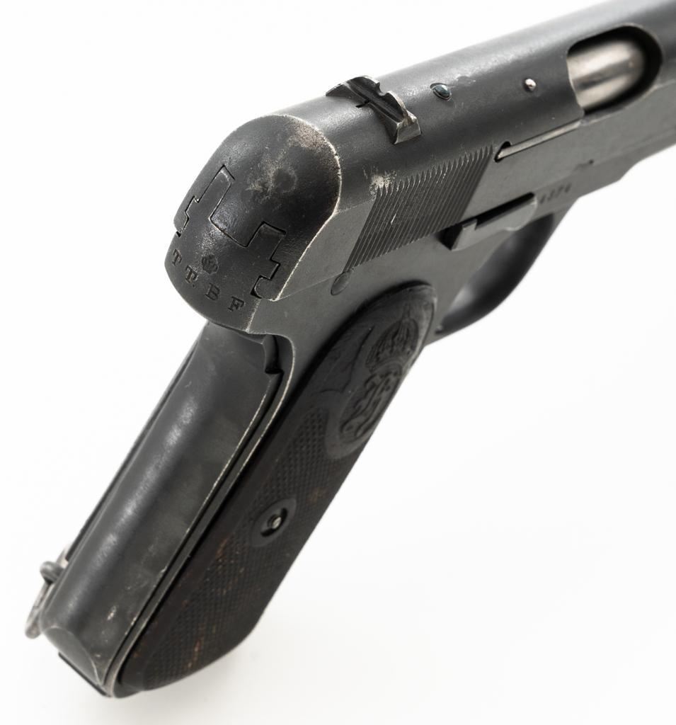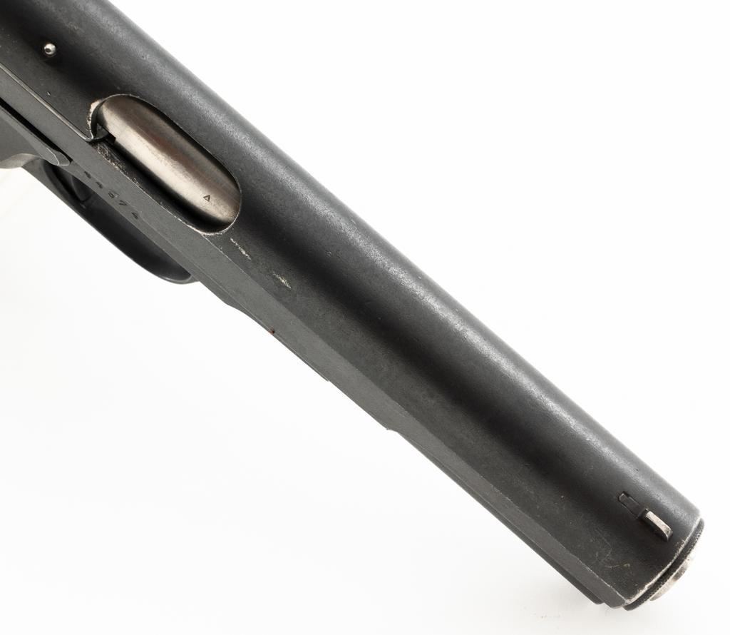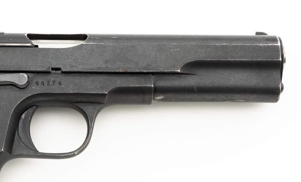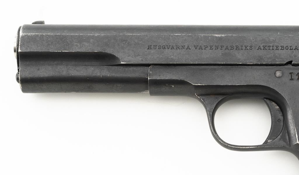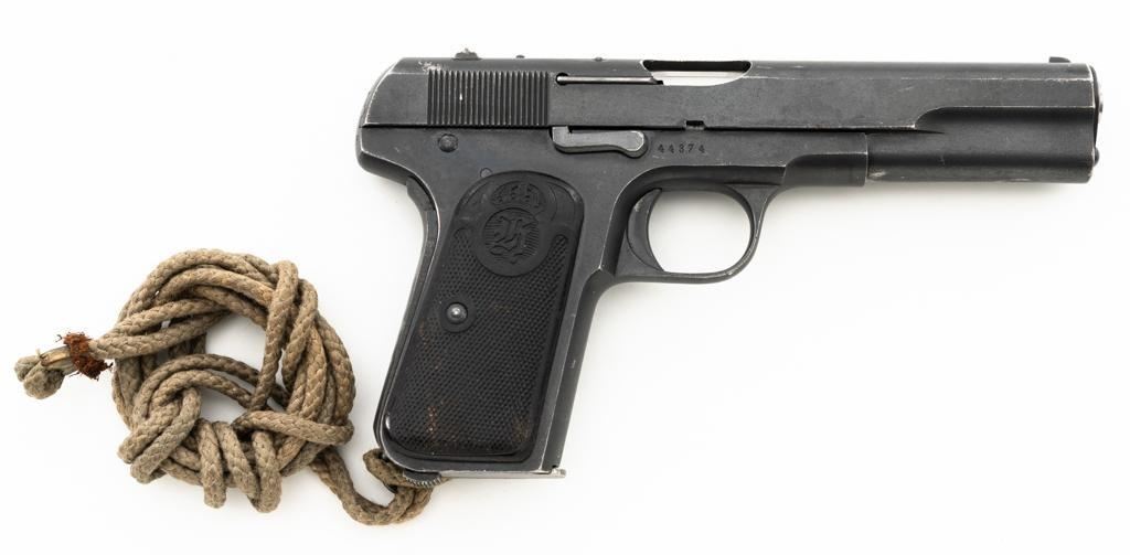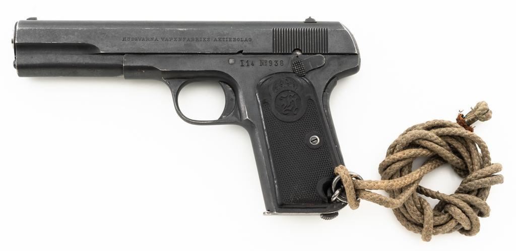Unit Marked Swedish M1907 Semi-Automatic Pistol, #44374, .380 Auto cal., 5" barrel, blued finish, checkered black plastic grips embossed with Crowned Husqvarna logos on each side, blade front sight, fixed rear sight with "U"-notched groove, and steel lanyard ring at left side of the frame, with tan colored lanyard. Includes one non-matching blued steel magazine, numbered "36688" on the right side. Pistol is marked "HUSQVARNA VAPENSFABRIKS AKTIEBOLAG" on left side of the slide. Stamped "I14 No.938" on the frame, indicating issue to Swedish army, Infantry Regiment #14, weapon #938. Rear of the frame is stamped "(crown)TT./BF." Condition overall is fine, retaining approx. 90% finish, showing light edgewear, handling marks, and a few areas of dark toning. Grips with light wear and handling marks to the logos and checkering. Action operates smoothly. Bore is bright, with very good, clearly defined rifling. Est.: $400-$600. (C&R/PPT)