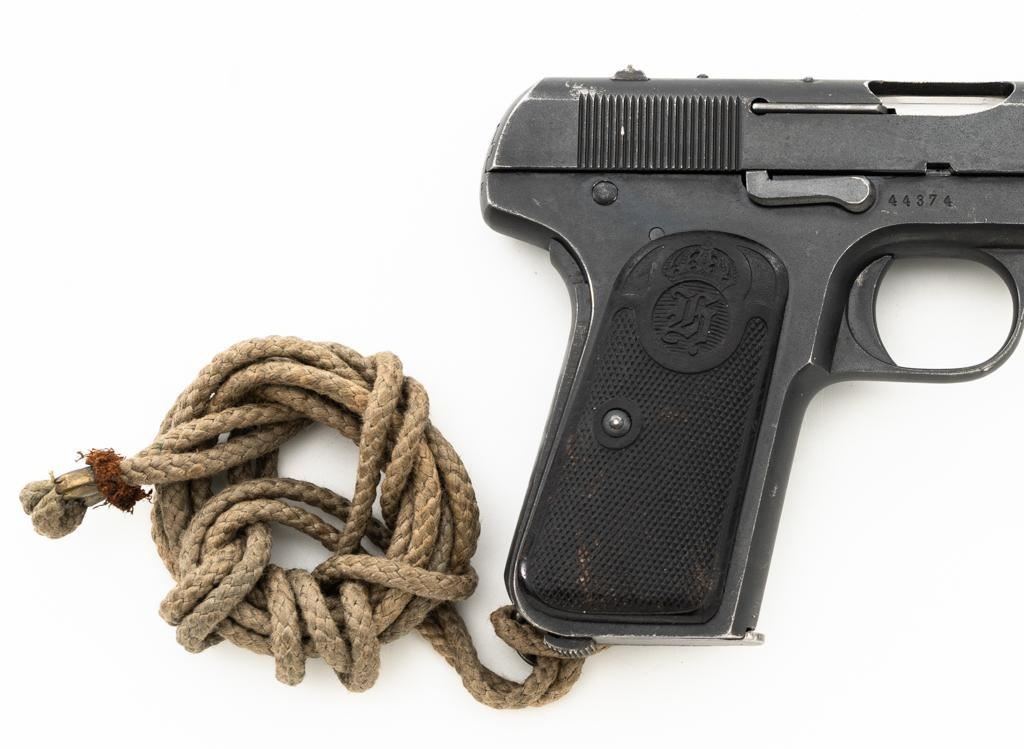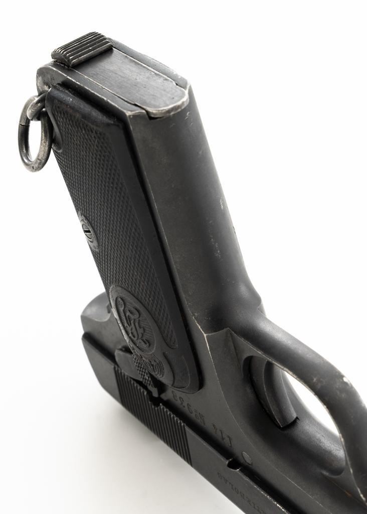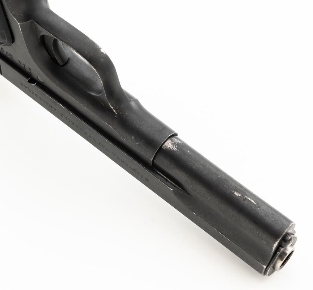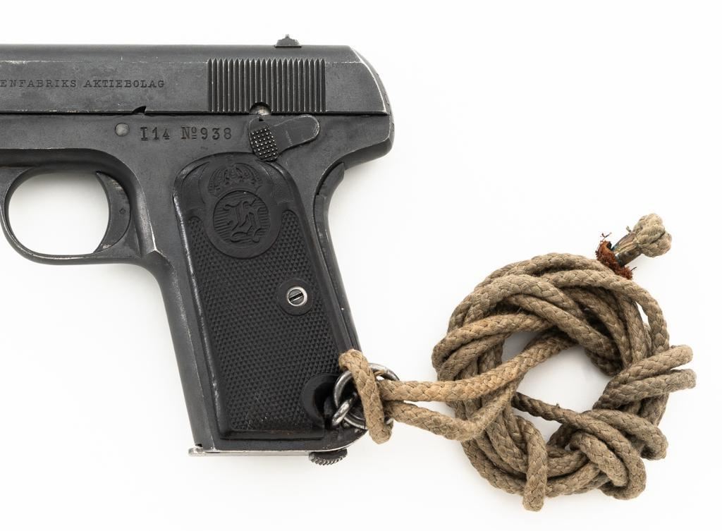 Unit Marked Swedish M1907 Semi-Automatic Pistol, #44374, .380 Auto cal., 5" barrel, blued finish, checkered black plastic grips embossed with Crowned Husqvarna logos on each side, blade front sight, fixed rear sight with "U"-notched groove, and steel lanyard ring at left side of the frame, with tan colored lanyard. Includes one non-matching blued steel magazine, numbered "36688" on the right side. Pistol is marked "HUSQVARNA VAPENSFABRIKS AKTIEBOLAG" on left side of the slide. Stamped "I14 No.938" on the frame, indicating issue to Swedish army, Infantry Regiment #14, weapon #938. Rear of the frame is stamped "(crown)TT./BF." Condition overall is fine, retaining approx. 90% finish, showing light edgewear, handling marks, and a few areas of dark toning. Grips with light wear and handling marks to the logos and checkering. Action operates smoothly. Bore is bright, with very good, clearly defined rifling. Est.: $400-$600. (C&R/PPT)