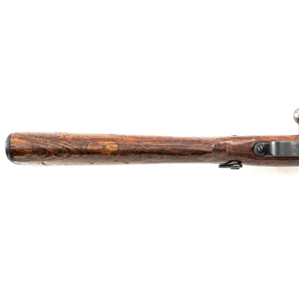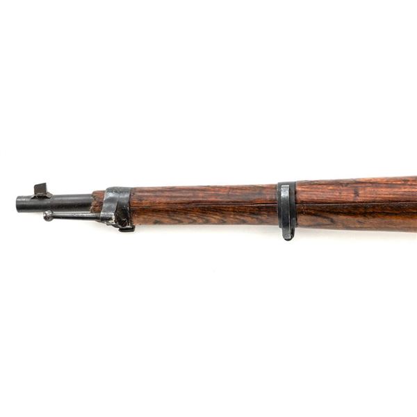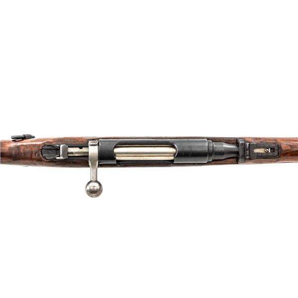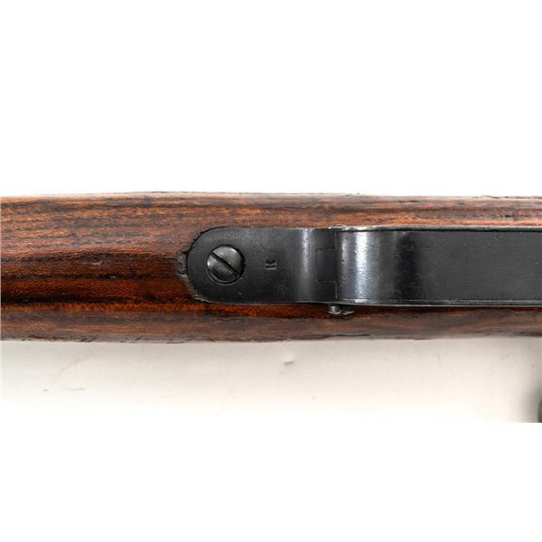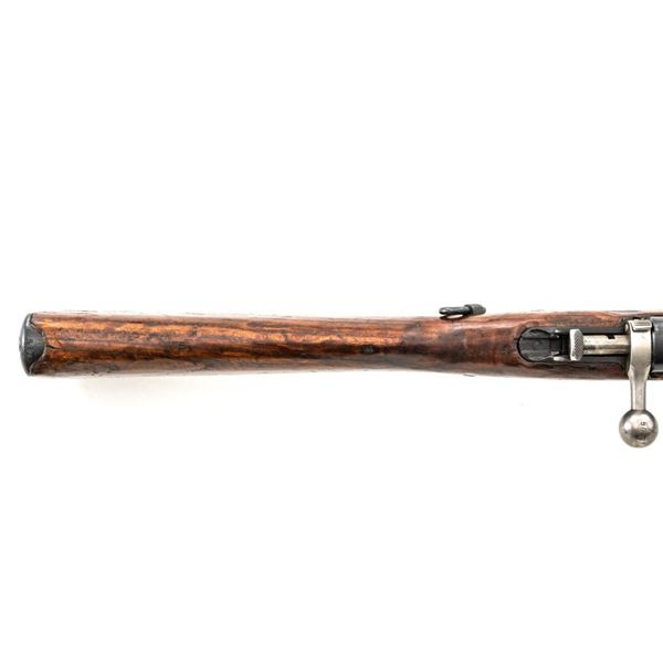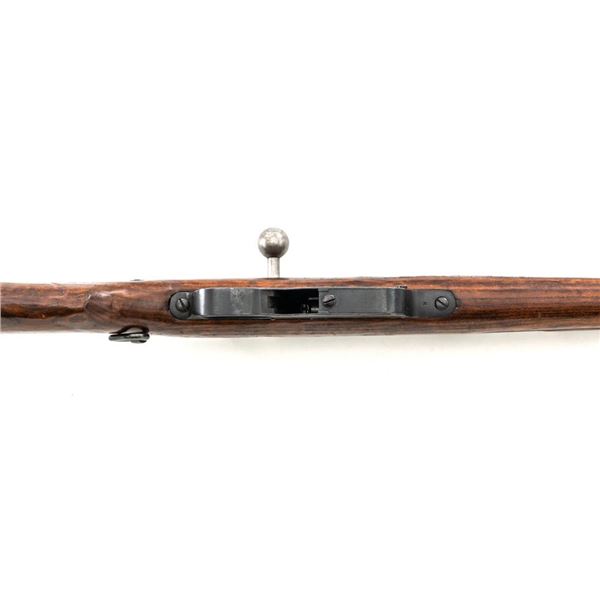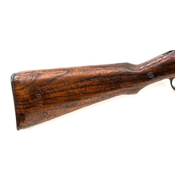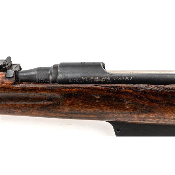 Austrian M95 Mannlicher Straight-Pull Rifle, #M9504909, 8x56Rmm, 19.8" barrel, blued finish, hardwood stock set, inverted-"V" front sight, and adjustable folding leaf rear sight with "V"-notched groove. Marked on top of receiver ring "STEYR/M.95". Top of barrel shank stamped with large "S" indicating conversion to 8x56Rmm. Matching number on bolt handle and on renumbered buttstock. Import markds and importer applied serial number on left side of the receiver. Condition overall is very good as arsenal reconditioned and shortened in the post-WWI era, retaining approx. 90% finish, with frosting to the magazine case and battering to the stacking hook. Wood has been sanded and varnished over old handling marks and gouges, now darkened with a couple of recent scratches. Action operates smoothly. Bore has darkening in the grooves, otherwise good with light frosting. Est.: $250-$350. (C&R)