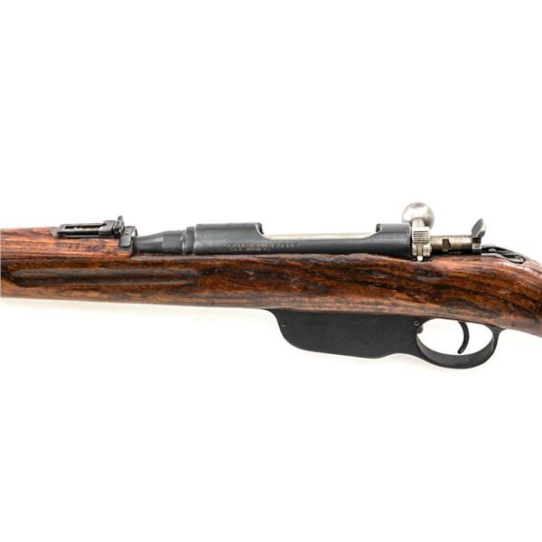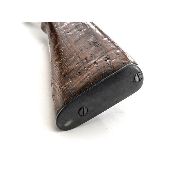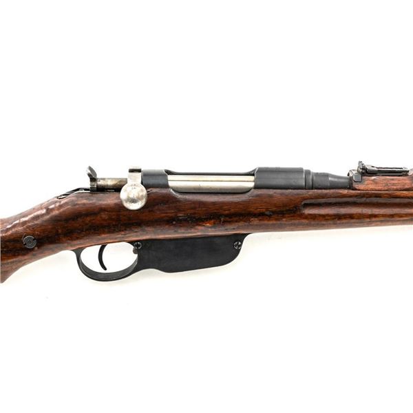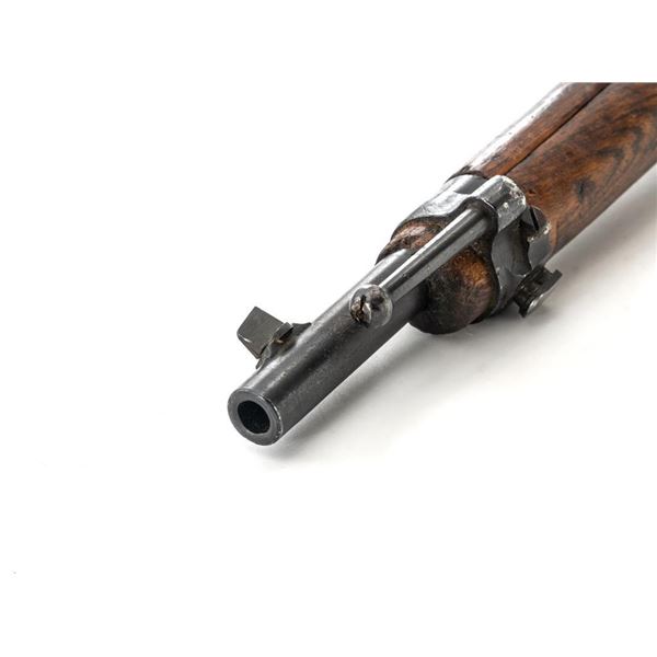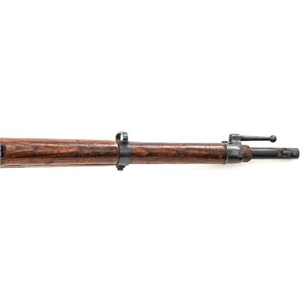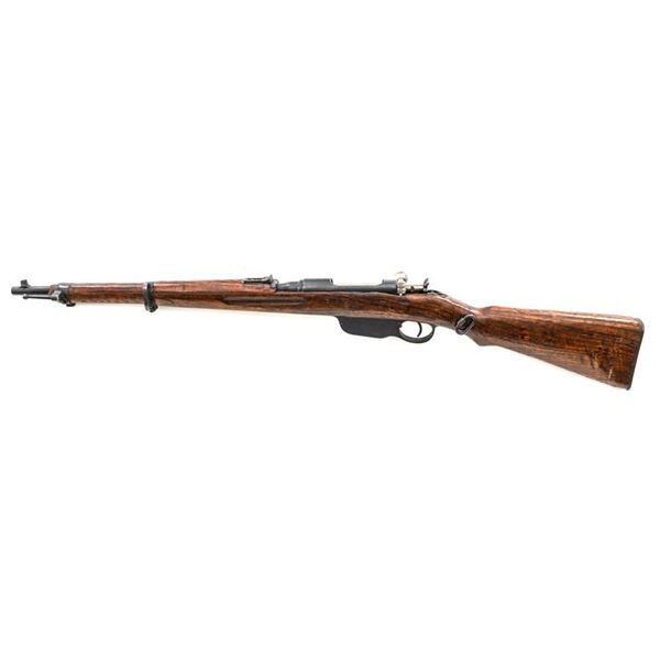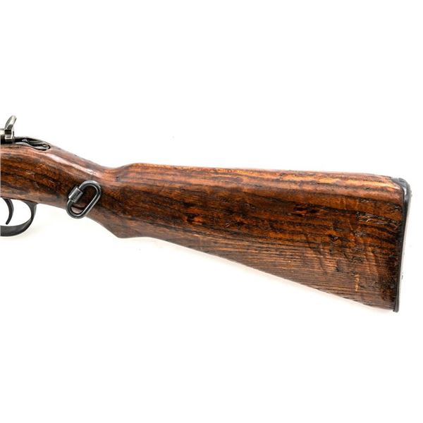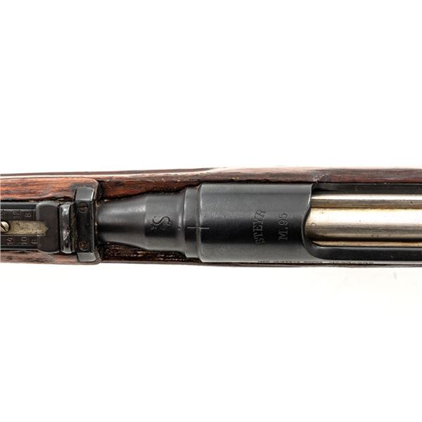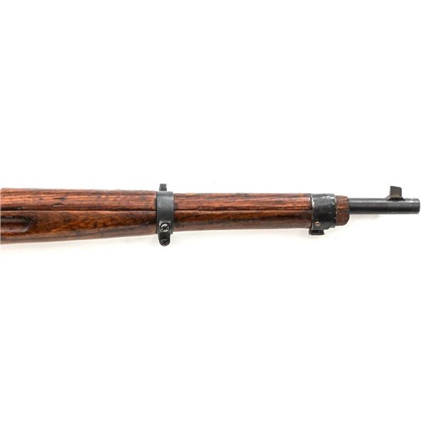 Austrian M95 Mannlicher Straight-Pull Rifle, #M9504909, 8x56Rmm, 19.8" barrel, blued finish, hardwood stock set, inverted-"V" front sight, and adjustable folding leaf rear sight with "V"-notched groove. Marked on top of receiver ring "STEYR/M.95". Top of barrel shank stamped with large "S" indicating conversion to 8x56Rmm. Matching number on bolt handle and on renumbered buttstock. Import markds and importer applied serial number on left side of the receiver. Condition overall is very good as arsenal reconditioned and shortened in the post-WWI era, retaining approx. 90% finish, with frosting to the magazine case and battering to the stacking hook. Wood has been sanded and varnished over old handling marks and gouges, now darkened with a couple of recent scratches. Action operates smoothly. Bore has darkening in the grooves, otherwise good with light frosting. Est.: $250-$350. (C&R)