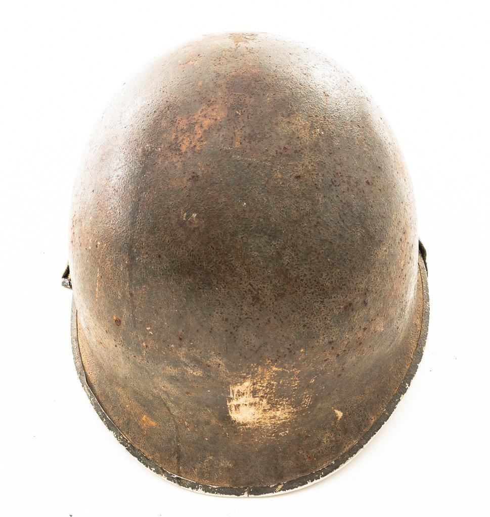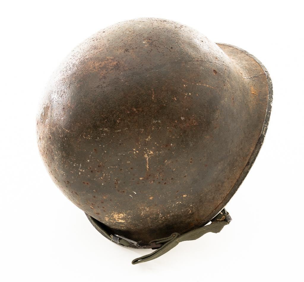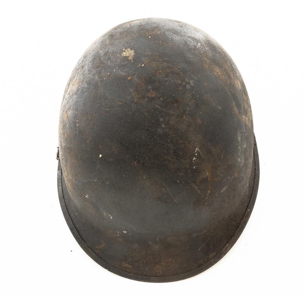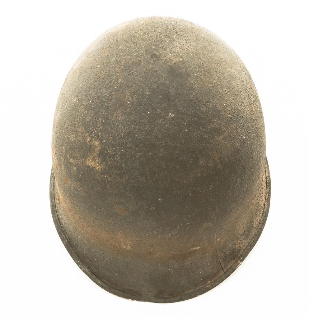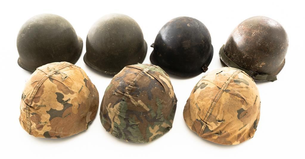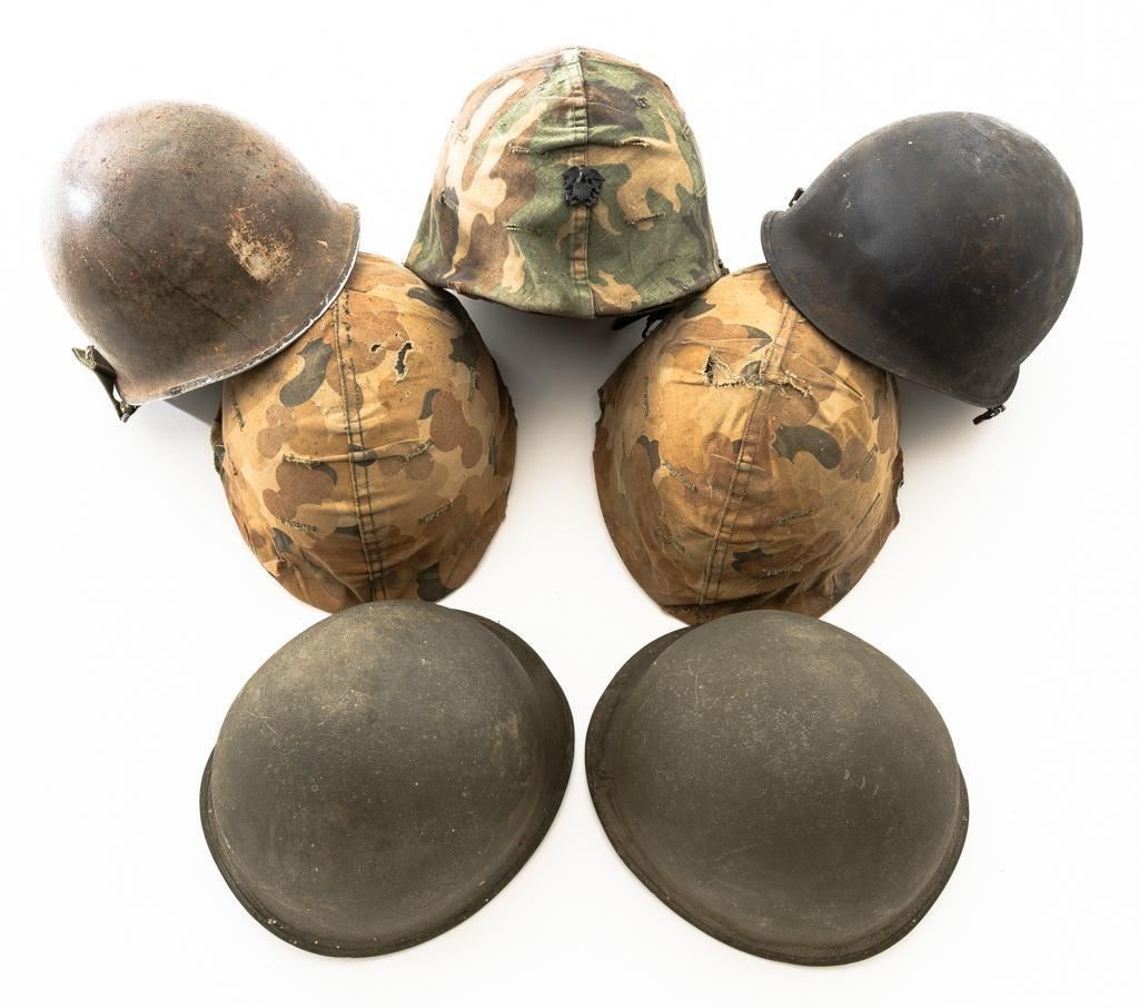 Lot of Seven (7) U. S. M1 Helmets: 1.) WWII steel helmet with cloth cover, sewn chin straps, and WWII liner with all straps. In very good condition, the leather chin strap is crazed and head band shows use. Subdued U.S. Navy badge is attached. 2.) Steel helmet, no liner, joined at the front, with a 2" crack at right of center, and very good paint. 3.) Steel helmet, no liner, joined at the front, with a 3" crack at right of center, paint is very good. 4.) Steel helmet, joined at the front, with circa 1960s chin strap, and circa 1950s liner with torn webbing at the back. Steel shows heavy use and rust. 5.) Steel helmet, circa 1960s, with torn cloth cover, liner is very good but missing the head band and nape strap. 6.) Steel helmet, missing chin straps, and circa 1950s liner with worn headband. Painted black and has scattered moderate surface rust. 7.) Steel helmet circa 1960s-1970s, with torn cloth cover, liner is missing the head band and nape strap. In good condition. Est.: $350-$550/lot.