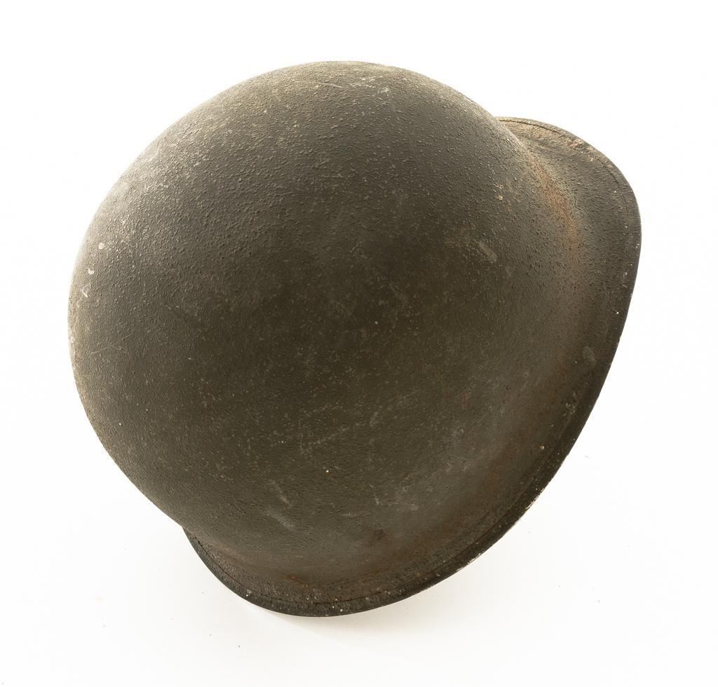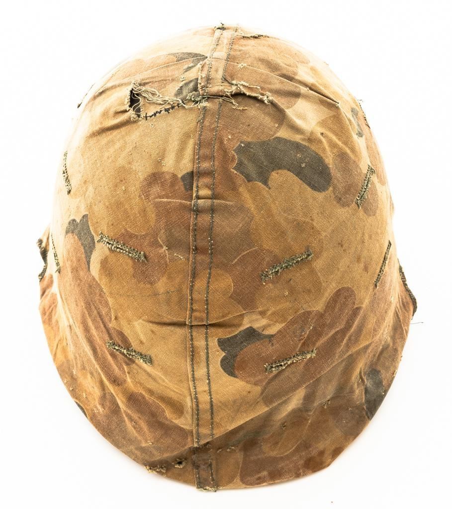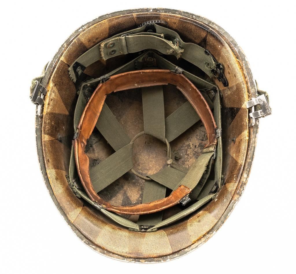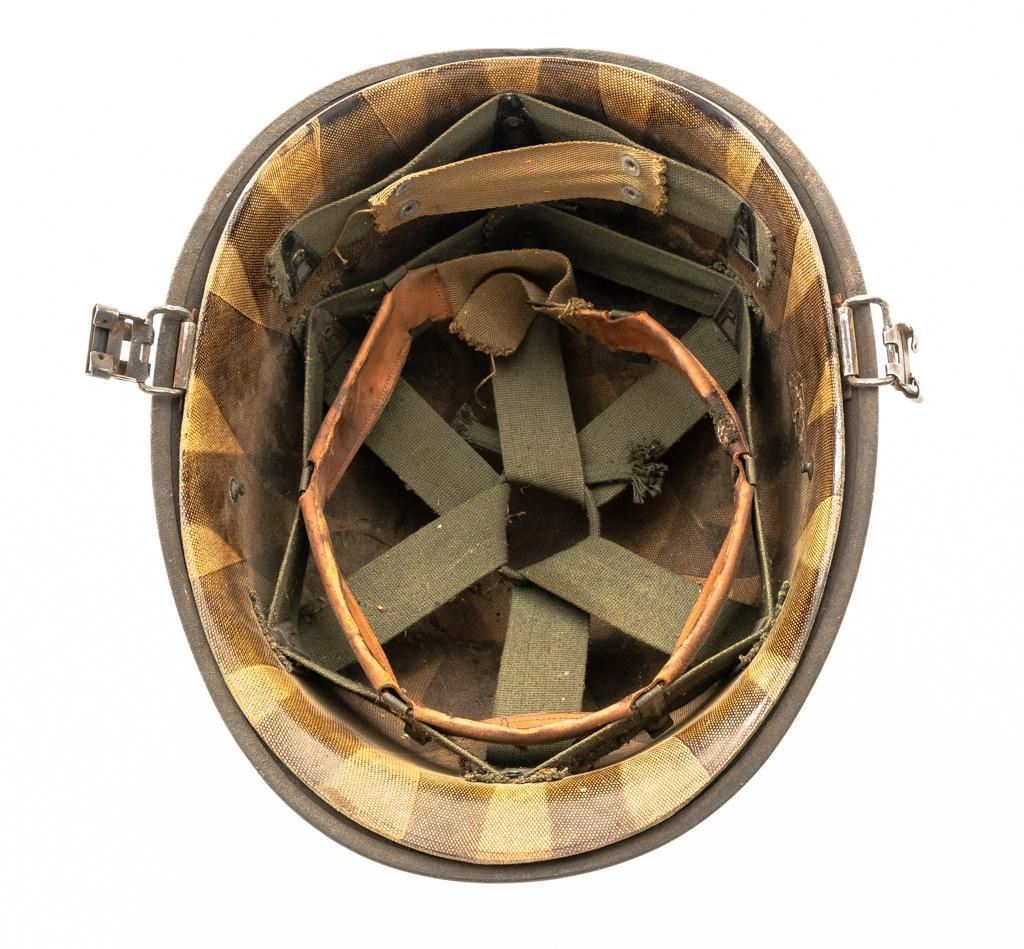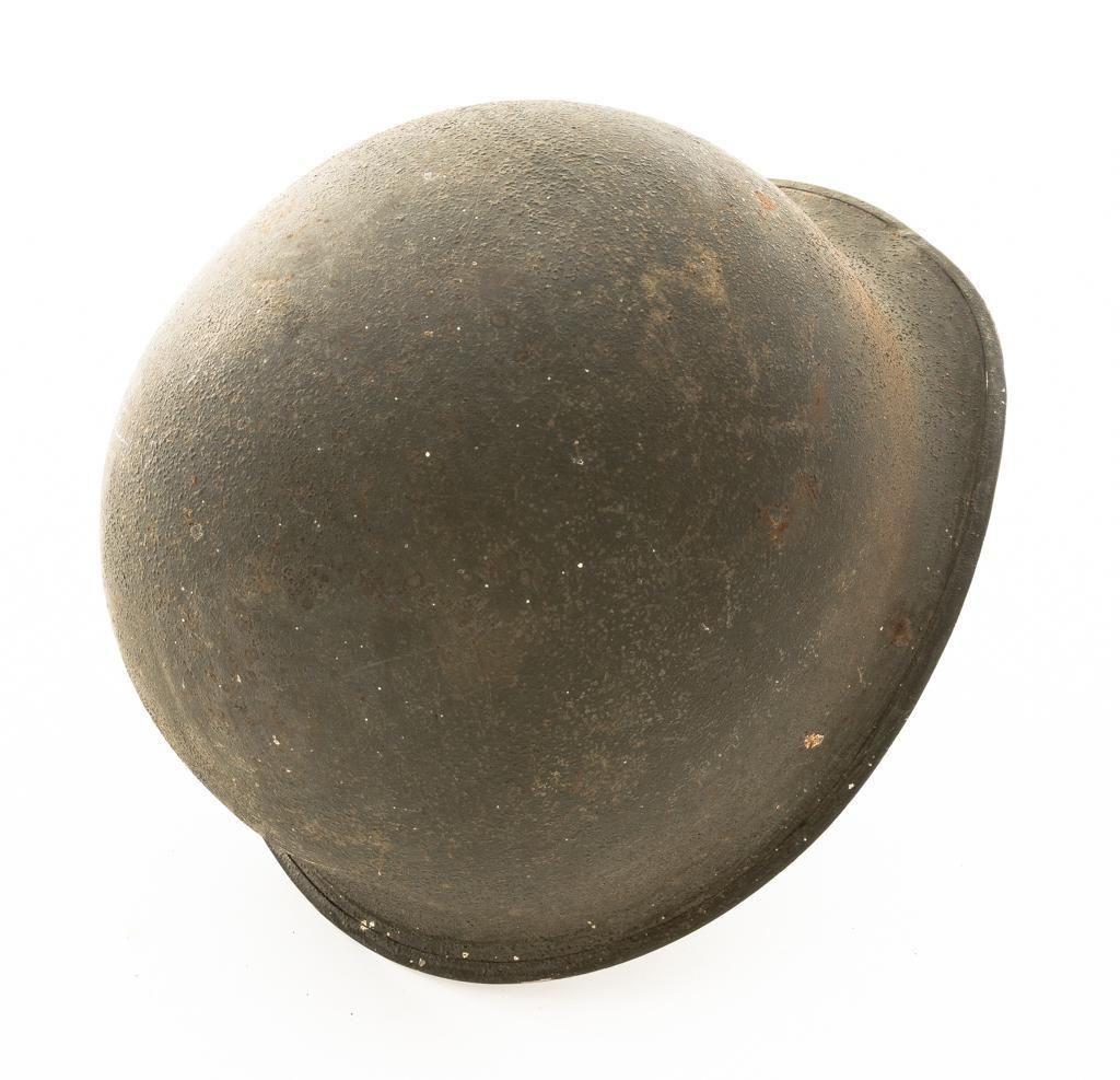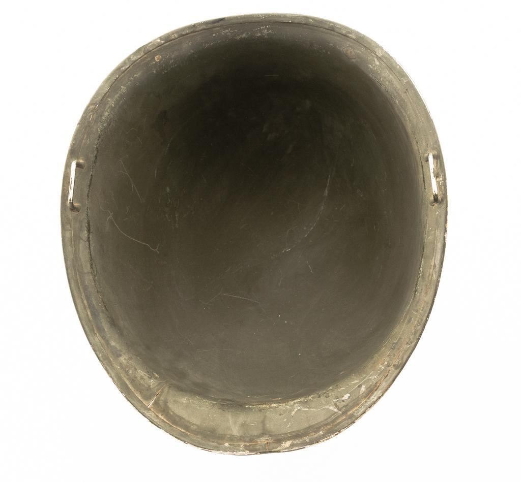 Lot of Seven (7) U. S. M1 Helmets: 1.) WWII steel helmet with cloth cover, sewn chin straps, and WWII liner with all straps. In very good condition, the leather chin strap is crazed and head band shows use. Subdued U.S. Navy badge is attached. 2.) Steel helmet, no liner, joined at the front, with a 2" crack at right of center, and very good paint. 3.) Steel helmet, no liner, joined at the front, with a 3" crack at right of center, paint is very good. 4.) Steel helmet, joined at the front, with circa 1960s chin strap, and circa 1950s liner with torn webbing at the back. Steel shows heavy use and rust. 5.) Steel helmet, circa 1960s, with torn cloth cover, liner is very good but missing the head band and nape strap. 6.) Steel helmet, missing chin straps, and circa 1950s liner with worn headband. Painted black and has scattered moderate surface rust. 7.) Steel helmet circa 1960s-1970s, with torn cloth cover, liner is missing the head band and nape strap. In good condition. Est.: $350-$550/lot.