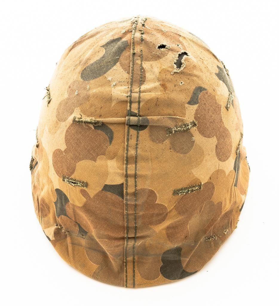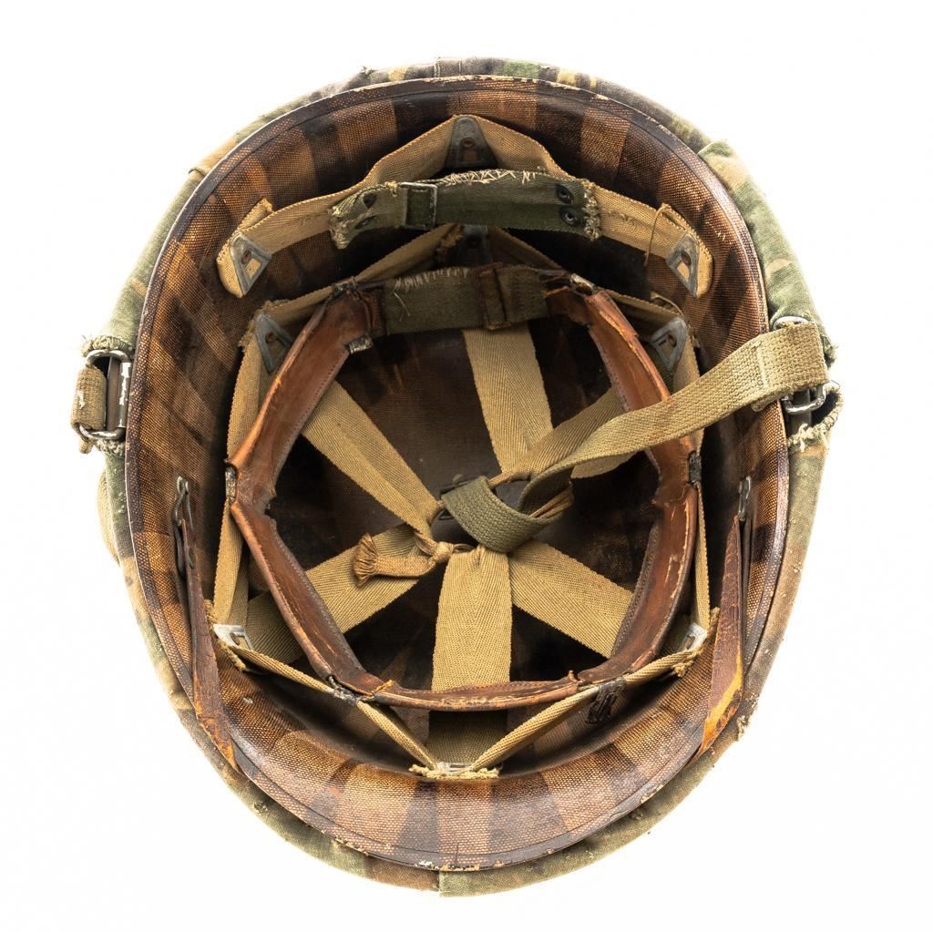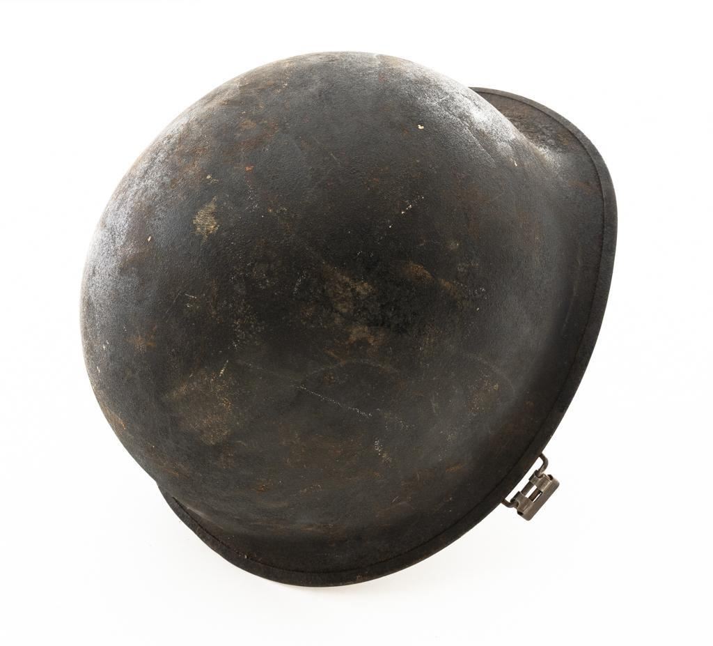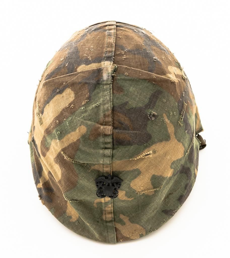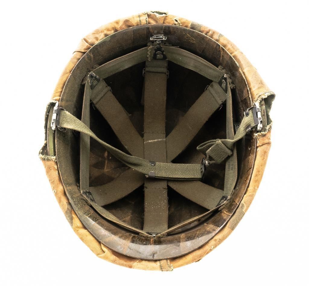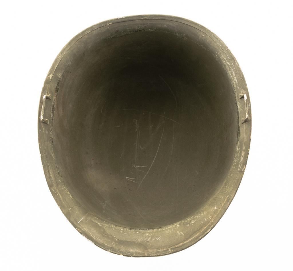 Lot of Seven (7) U. S. M1 Helmets: 1.) WWII steel helmet with cloth cover, sewn chin straps, and WWII liner with all straps. In very good condition, the leather chin strap is crazed and head band shows use. Subdued U.S. Navy badge is attached. 2.) Steel helmet, no liner, joined at the front, with a 2" crack at right of center, and very good paint. 3.) Steel helmet, no liner, joined at the front, with a 3" crack at right of center, paint is very good. 4.) Steel helmet, joined at the front, with circa 1960s chin strap, and circa 1950s liner with torn webbing at the back. Steel shows heavy use and rust. 5.) Steel helmet, circa 1960s, with torn cloth cover, liner is very good but missing the head band and nape strap. 6.) Steel helmet, missing chin straps, and circa 1950s liner with worn headband. Painted black and has scattered moderate surface rust. 7.) Steel helmet circa 1960s-1970s, with torn cloth cover, liner is missing the head band and nape strap. In good condition. Est.: $350-$550/lot.