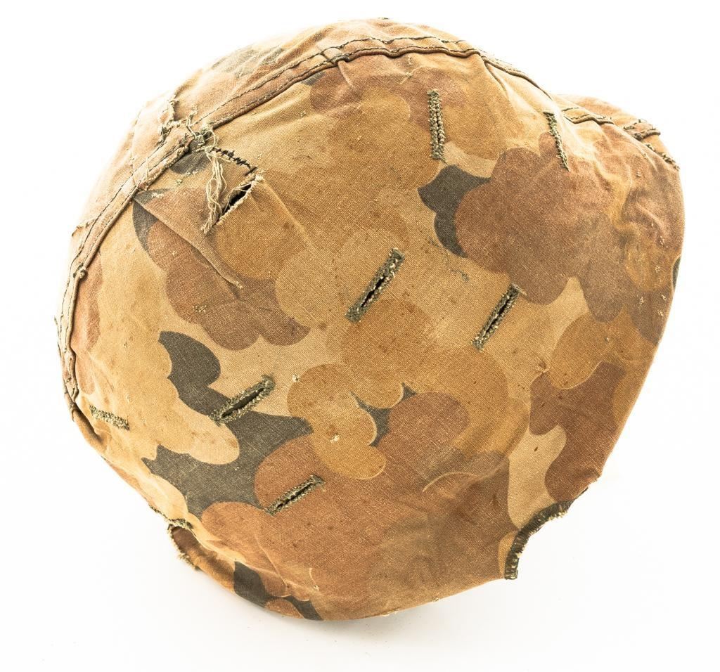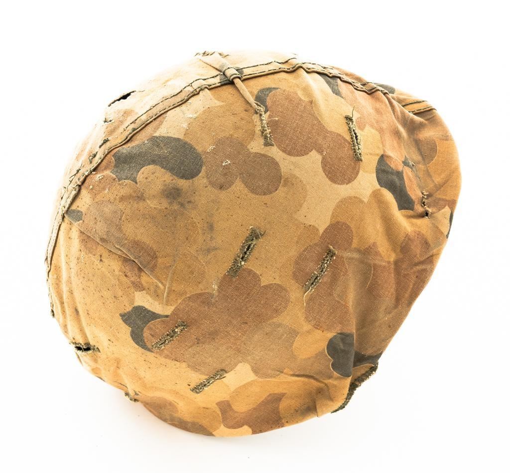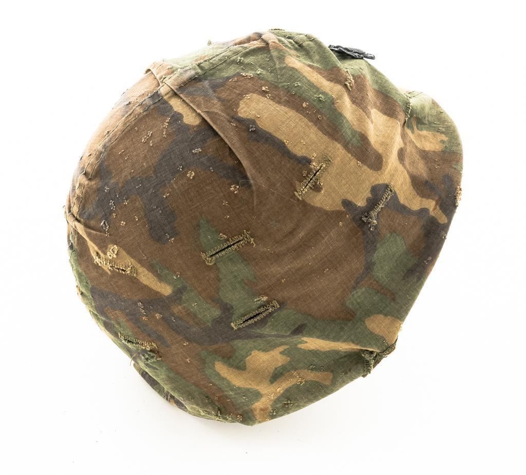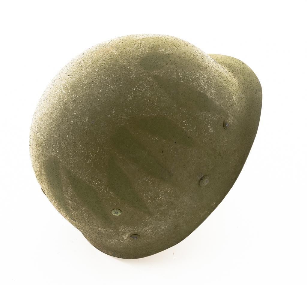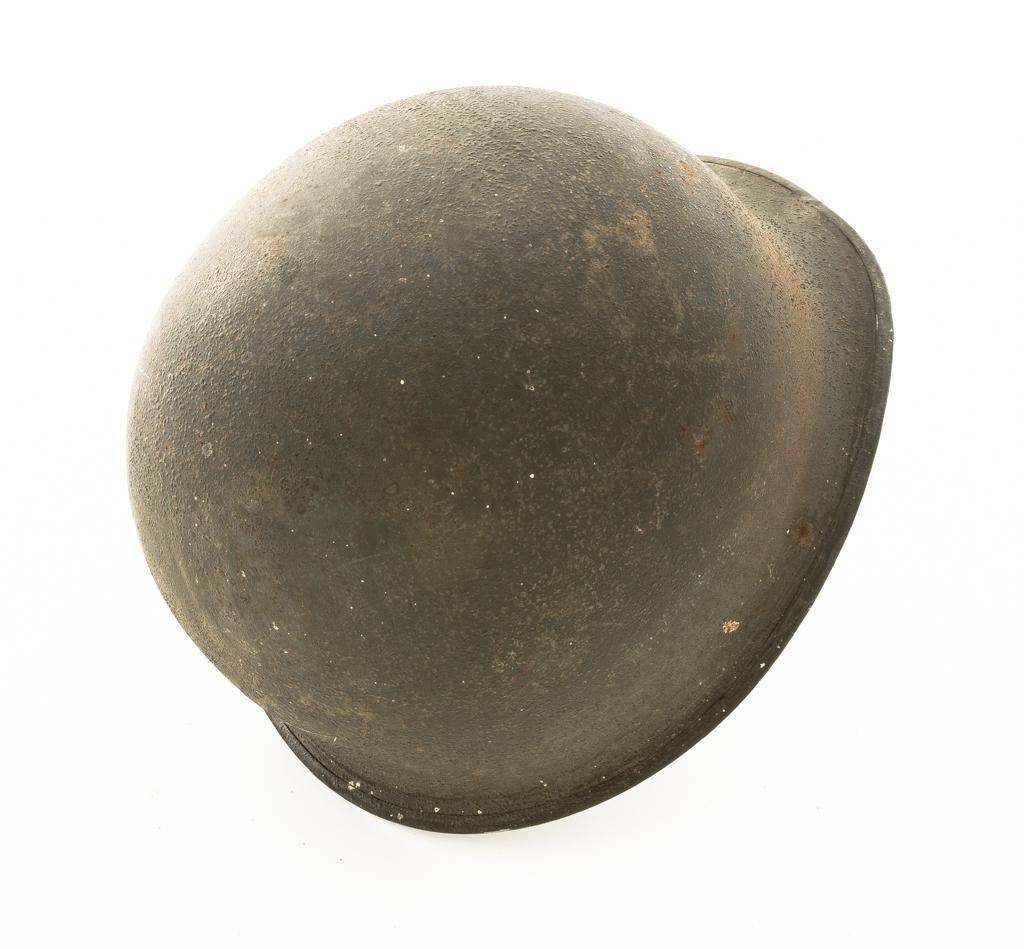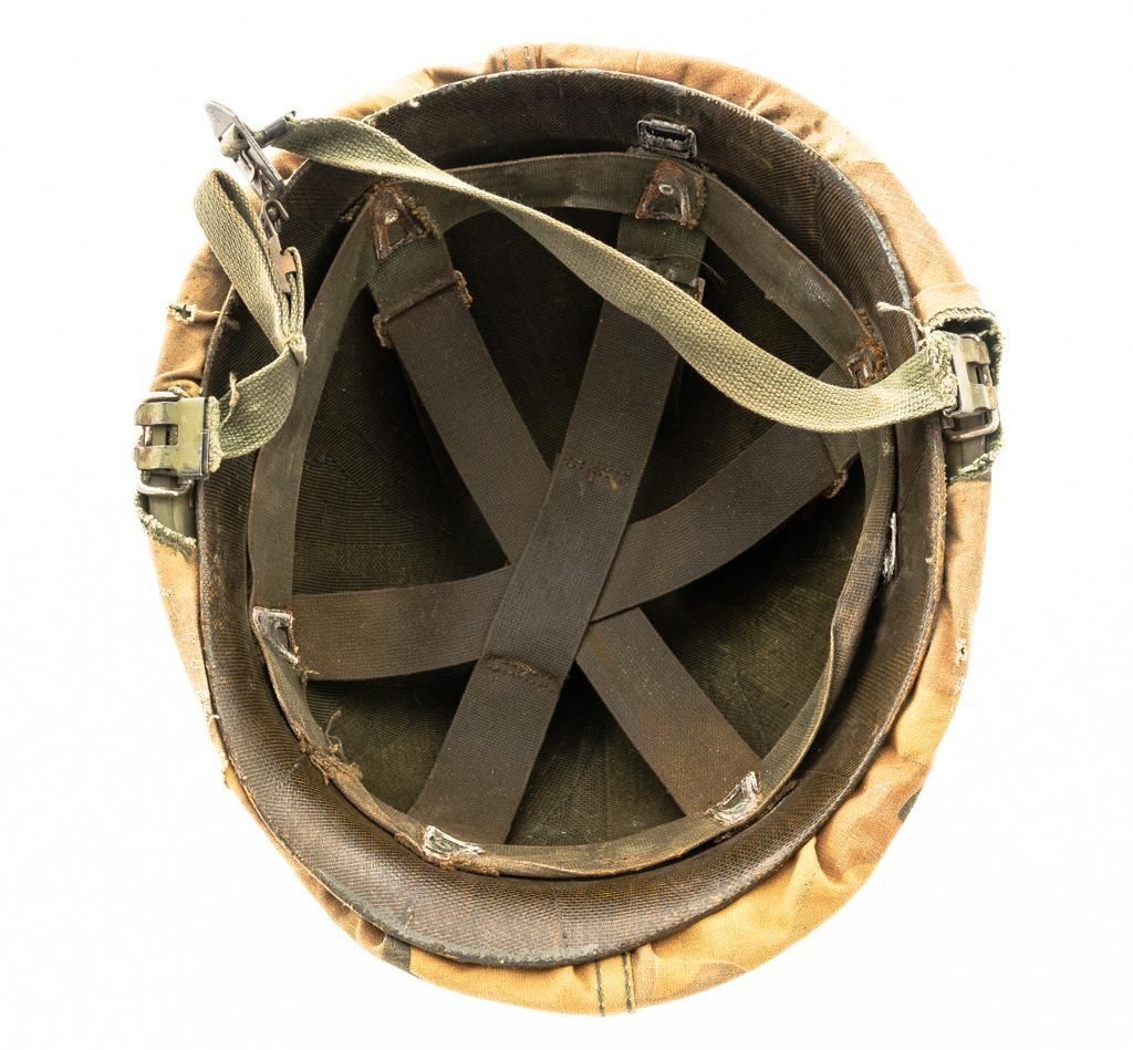 Lot of Seven (7) U. S. M1 Helmets: 1.) WWII steel helmet with cloth cover, sewn chin straps, and WWII liner with all straps. In very good condition, the leather chin strap is crazed and head band shows use. Subdued U.S. Navy badge is attached. 2.) Steel helmet, no liner, joined at the front, with a 2" crack at right of center, and very good paint. 3.) Steel helmet, no liner, joined at the front, with a 3" crack at right of center, paint is very good. 4.) Steel helmet, joined at the front, with circa 1960s chin strap, and circa 1950s liner with torn webbing at the back. Steel shows heavy use and rust. 5.) Steel helmet, circa 1960s, with torn cloth cover, liner is very good but missing the head band and nape strap. 6.) Steel helmet, missing chin straps, and circa 1950s liner with worn headband. Painted black and has scattered moderate surface rust. 7.) Steel helmet circa 1960s-1970s, with torn cloth cover, liner is missing the head band and nape strap. In good condition. Est.: $350-$550/lot.