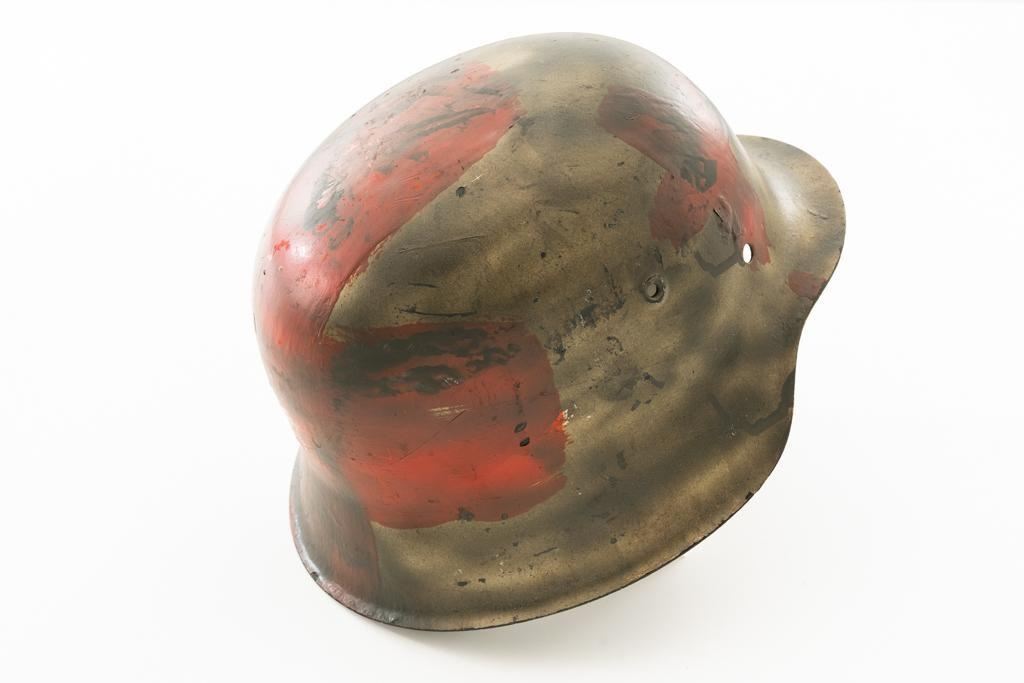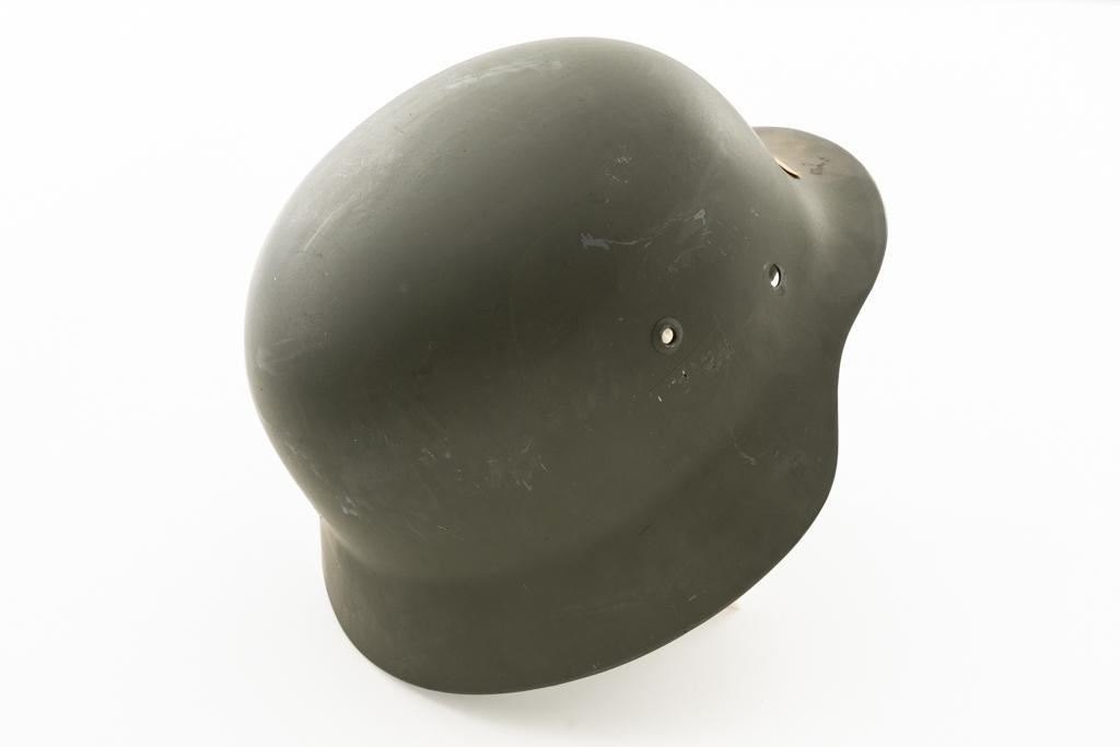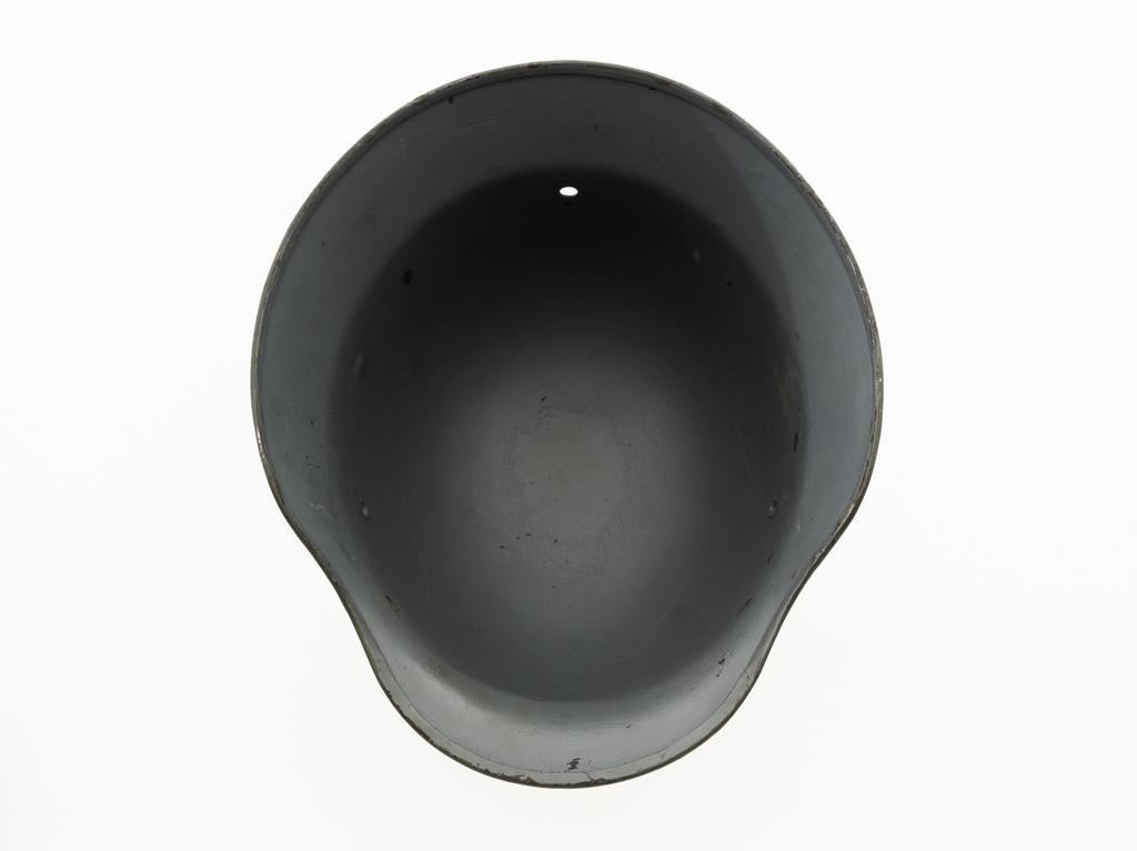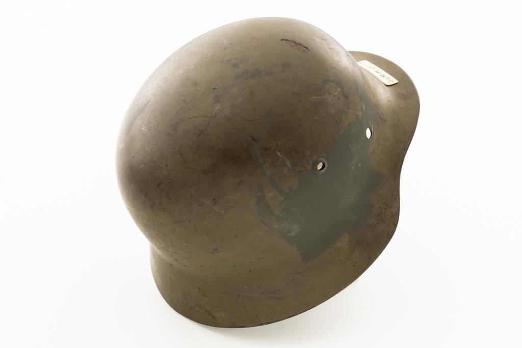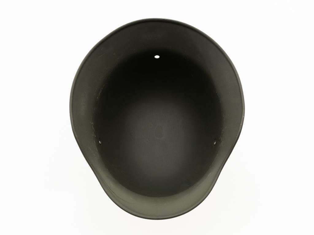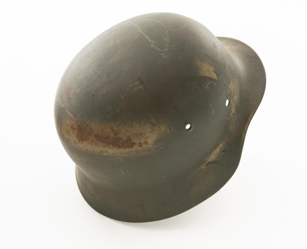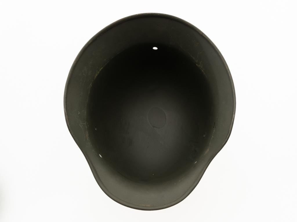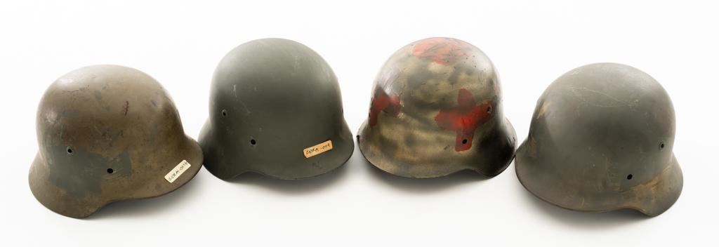 Lot of Four (4) WWII German Steel Helmet Shells, No Liners: 1.) M35, stamped "ET64" on left side and "3783"on rear skirt, painted olive drab green with remnants of decal on left side. In very good condition. 2.) M35, stamped "ET62" on left side and "4160" on rear skirt, old green color over painted with gray. In good condition, with scratches and patina. 3.) M40, "NS64" on left side and "8646" on rear skirt, painted olive drab green. In good condition. 4.) M42, markings not visible, painted green/yellow/red with two red medic crosses to front. In good condition. Est.:$300-$500/lot.
