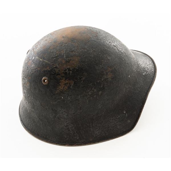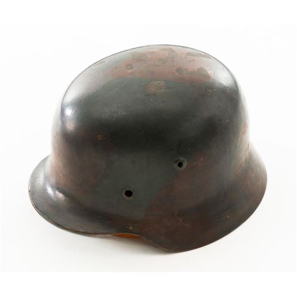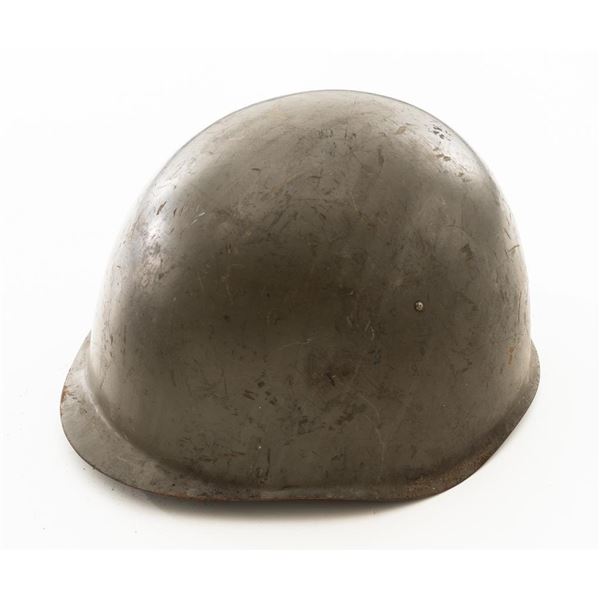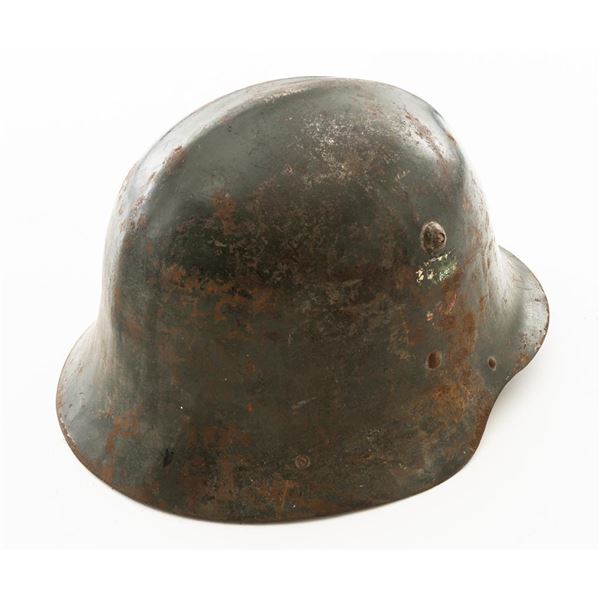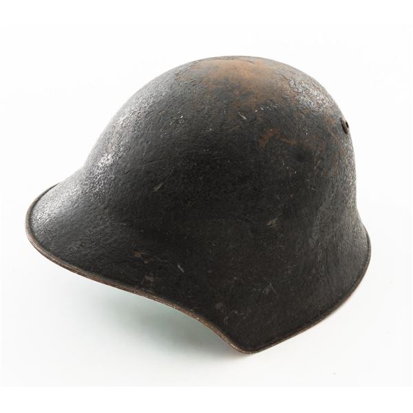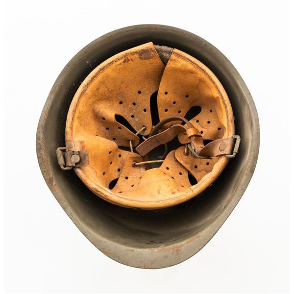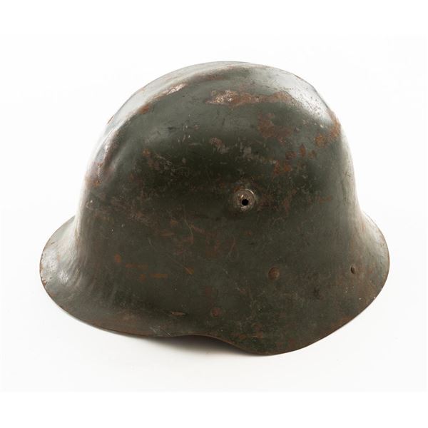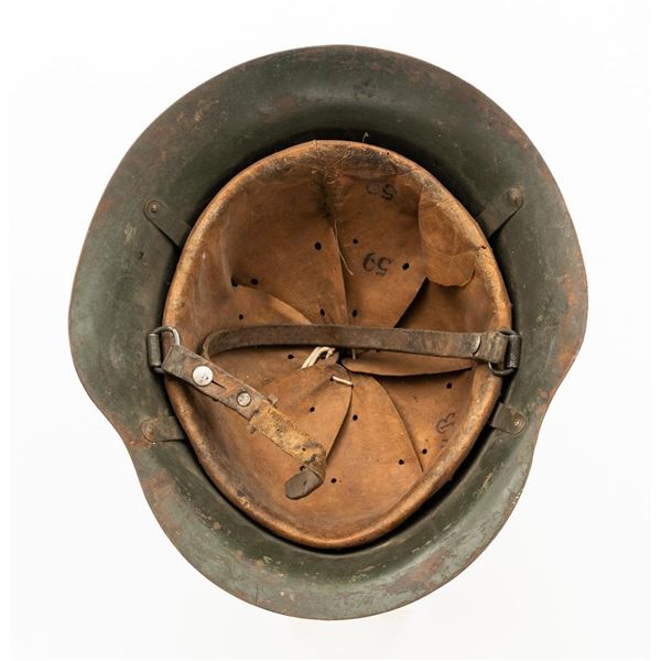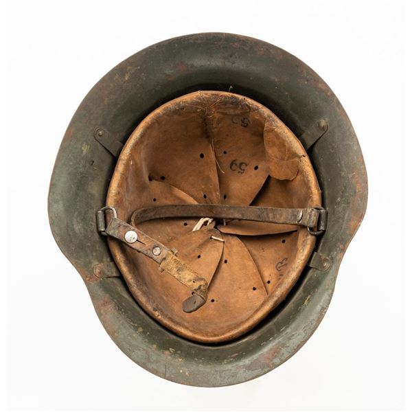 Lot of Five (5) Steel Military Helmets: 1.) Czech M53 with liner and broken leather chin strap. Marked "(crossed swords)56". In good condition, with scratches to shell, and dryness to the liner. 2.) German M40, no visible makers marks, named "Winkler", green/red painted, detached liner marked "57-61", with brown chin strap. In very good condition. 3.) Swiss M1918 with liner and chin strap, "A BLATTY" scratched into inside rear. In good condition with wear, patina, and darkening to leather. 4.) French Adrian with crowned badge, liner, and chin strap, painted black. In good condition with a few dents and patina. Liner is good. 5.) Bulgarian M36 with size 59 liner, marked with national emblem. Condition is fair with wear and surface rust. Liner and chin strap are good. Est.: $200-$400/lot.