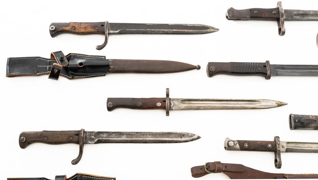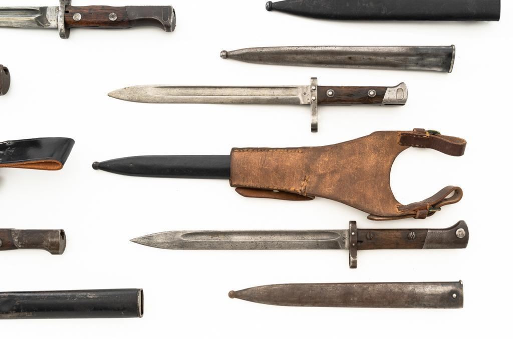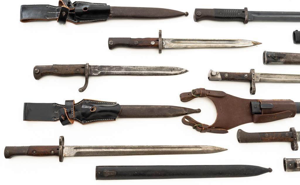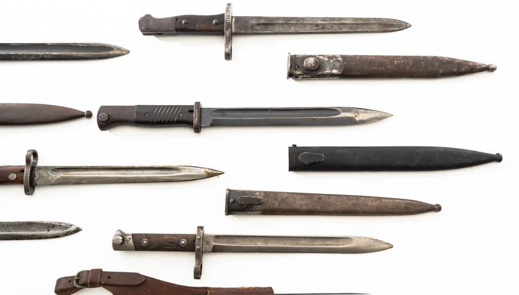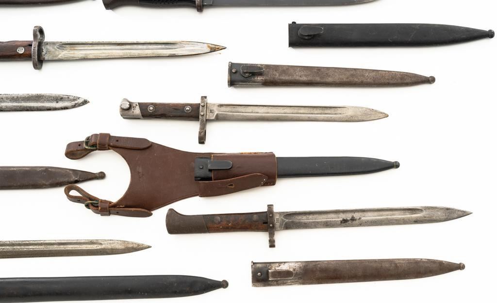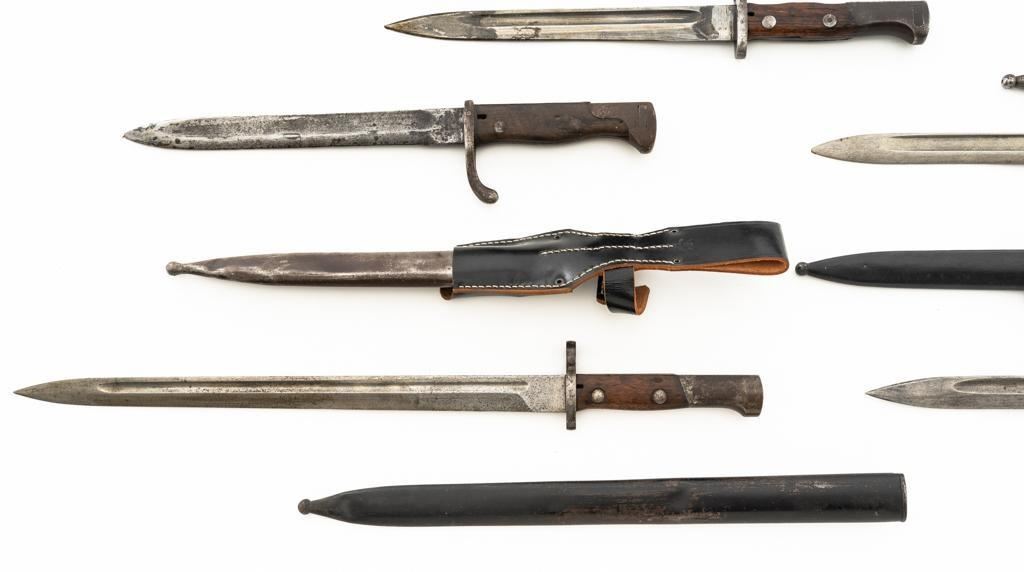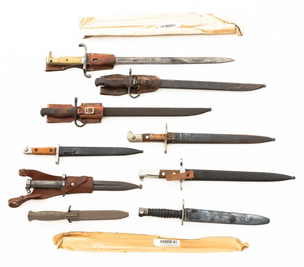 Lot Of Eleven (11) Bayonets and One Leather Frog: 1.) Japanese Type 30 with scabbard and frog, made at the Kokura Arsenal, . Condition is good, blade has been sharpened, grips show age and wear. Frog is heavily worn. 2.) Soviet M91/30 Mosin Nagant, sealed in importer packaging. 3.) Soviet M91/30 Mosin Nagant, sealed in importer packaging. 4.) Austrian M1895 with scabbard, marked "MO" and engraved "589". Condition is very good as arsenal reconditioned, with a few small nicks to the blade. Scabbard has a few moderate dents. 5.) Japanese Type 30 with scabbard and reproduction frog, made by Toyoda Automatic Loom Works and the Nagoya Arsenal. Condition is fair with noticeable impact marks to blade edge, with scattered rust spots on the bayonet and scabbard. Frog is in very good condition. 6.) Swiss M1957 with scabbard, marked "V" (Victorinox) and "F+W" inside a circle. Condition is very good with bright blade and sharp point. Scabbard with light frosted oxidation. 7.) Swiss M1899 with Scabbard, marked "WAFFENFABRIK NEUHAUSEN". Condition is good overall, scabbard with rust patina. 8.) Swiss M1918 double edged bayonet with scabbard, marked "ELSENER/SCHWYZ". Condition is near excellent. Scabbard is very good, with a few light dents. Blade will not seat fully in the scabbard. 9.) Brass handled sword bayonet, 18.25" blade, marked "RE". The release spring latch assembly is missing. Condition is fair, showing moderate+ age and wear. No scabbard. 10.) Swedish M1896 with scabbard and frog, marked "EJ(crowned anchor)AB". Number on scabbard does not match. Condition is good with sharpening and patina to blade. Scabbard with a few dents. Frog shows age and wear. 11.) Glock 81 knife with scabbard, marked "GLOCK" and "MADE IN AUSTRIA(GLOCK)78". Condition is very good, showing some light finish wear. Scabbard is marked "GLOCK" and is in excellent condition. 12.) Brown leather Mauser frog is marked with hand written name "Wirnhofer "on the rear. Condition is good. Est.: $400-$700/lot.