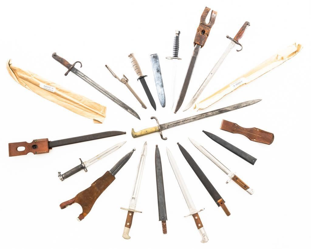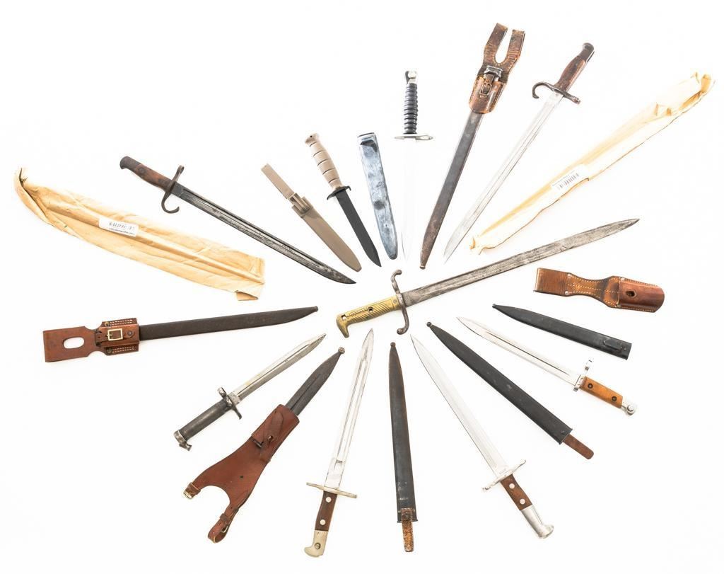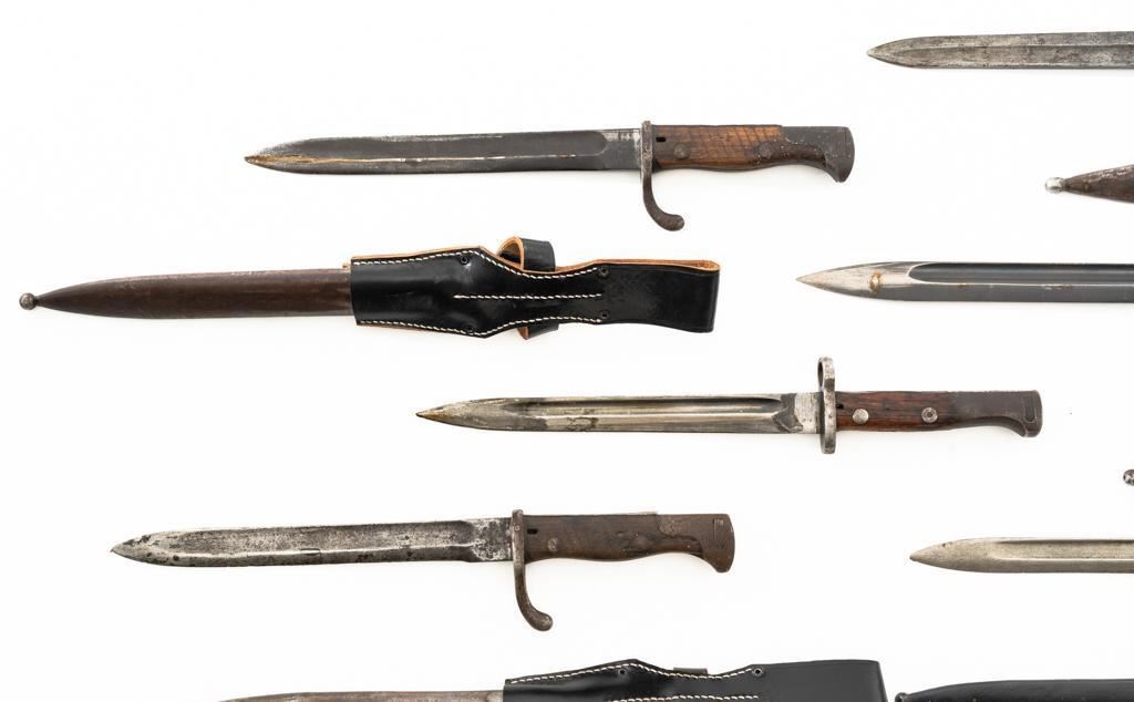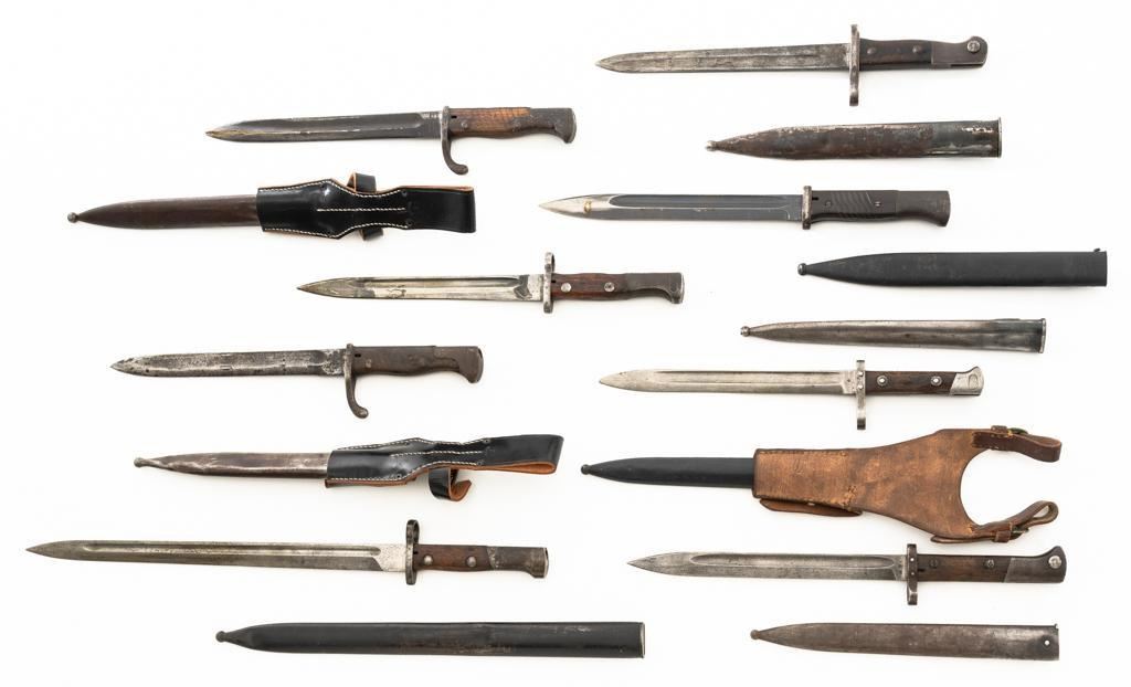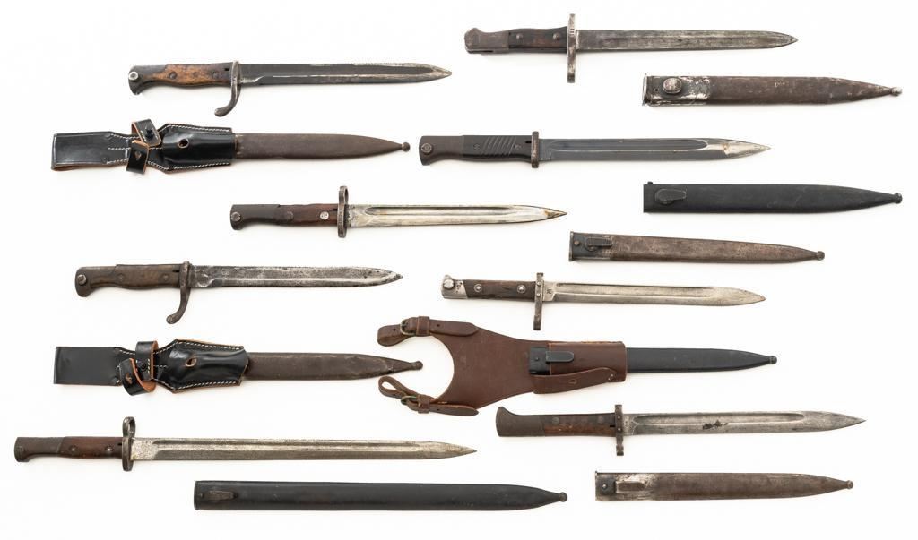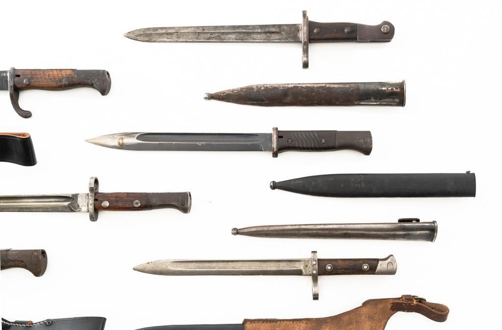 Lot Of Eleven (11) Bayonets and One Leather Frog: 1.) Japanese Type 30 with scabbard and frog, made at the Kokura Arsenal, . Condition is good, blade has been sharpened, grips show age and wear. Frog is heavily worn. 2.) Soviet M91/30 Mosin Nagant, sealed in importer packaging. 3.) Soviet M91/30 Mosin Nagant, sealed in importer packaging. 4.) Austrian M1895 with scabbard, marked "MO" and engraved "589". Condition is very good as arsenal reconditioned, with a few small nicks to the blade. Scabbard has a few moderate dents. 5.) Japanese Type 30 with scabbard and reproduction frog, made by Toyoda Automatic Loom Works and the Nagoya Arsenal. Condition is fair with noticeable impact marks to blade edge, with scattered rust spots on the bayonet and scabbard. Frog is in very good condition. 6.) Swiss M1957 with scabbard, marked "V" (Victorinox) and "F+W" inside a circle. Condition is very good with bright blade and sharp point. Scabbard with light frosted oxidation. 7.) Swiss M1899 with Scabbard, marked "WAFFENFABRIK NEUHAUSEN". Condition is good overall, scabbard with rust patina. 8.) Swiss M1918 double edged bayonet with scabbard, marked "ELSENER/SCHWYZ". Condition is near excellent. Scabbard is very good, with a few light dents. Blade will not seat fully in the scabbard. 9.) Brass handled sword bayonet, 18.25" blade, marked "RE". The release spring latch assembly is missing. Condition is fair, showing moderate+ age and wear. No scabbard. 10.) Swedish M1896 with scabbard and frog, marked "EJ(crowned anchor)AB". Number on scabbard does not match. Condition is good with sharpening and patina to blade. Scabbard with a few dents. Frog shows age and wear. 11.) Glock 81 knife with scabbard, marked "GLOCK" and "MADE IN AUSTRIA(GLOCK)78". Condition is very good, showing some light finish wear. Scabbard is marked "GLOCK" and is in excellent condition. 12.) Brown leather Mauser frog is marked with hand written name "Wirnhofer "on the rear. Condition is good. Est.: $400-$700/lot.