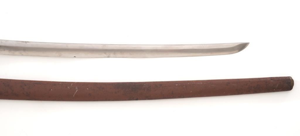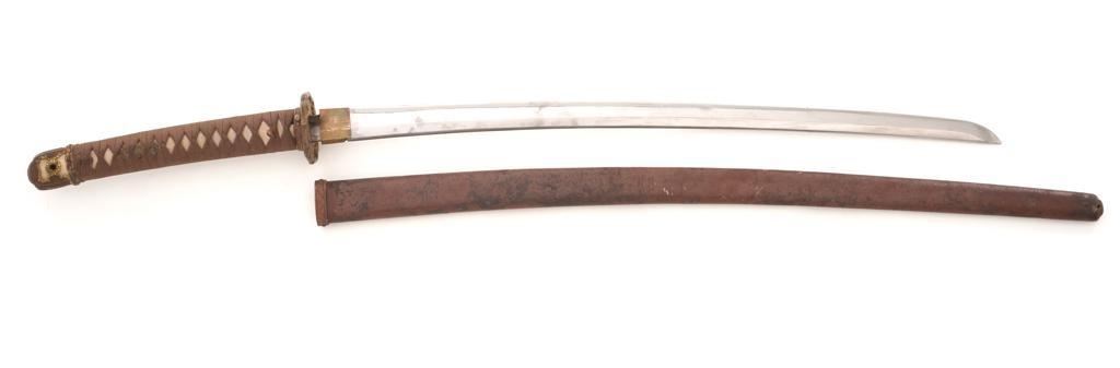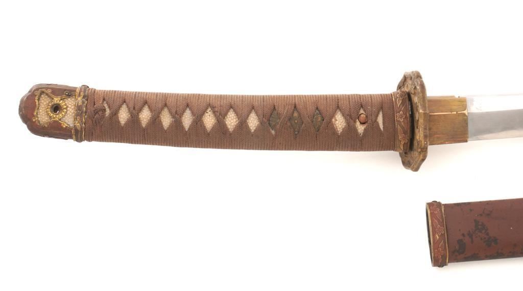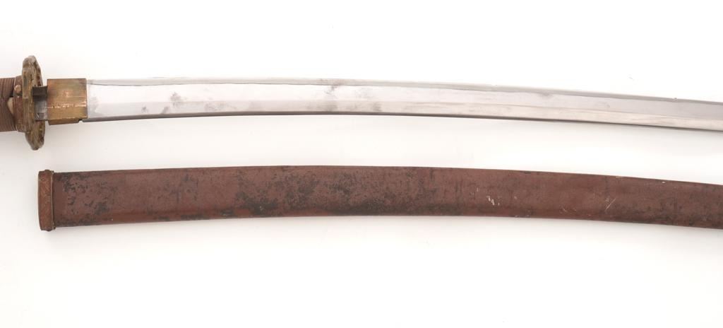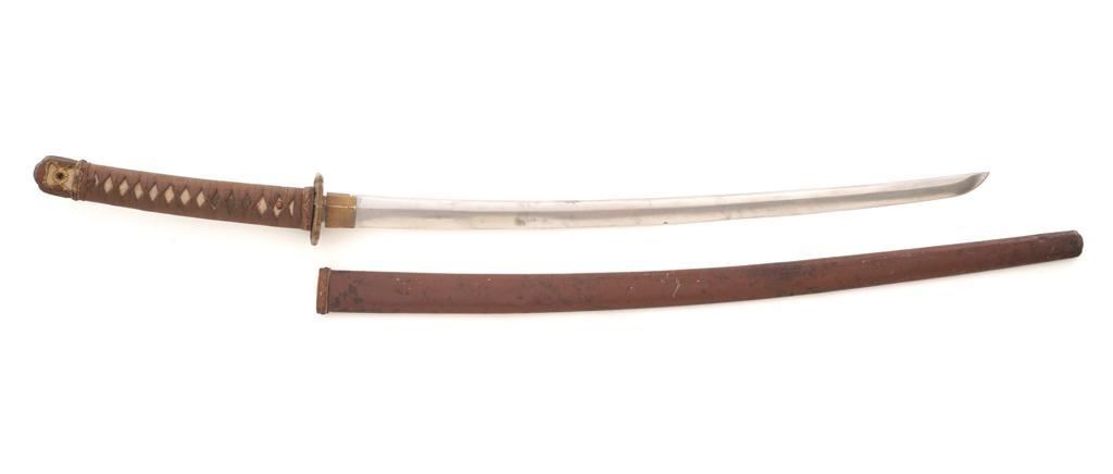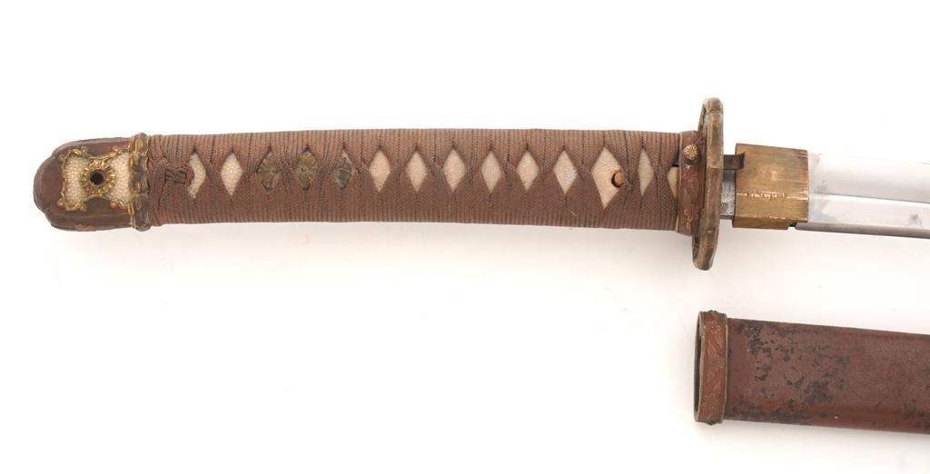 WWII Japanese Officer's Shin-Gunto Sword, with a 24.75 machine made blade, with one mounting hole, Seki Arsenal stamp, and is signed by the arsenal factory worker. Sword features a brass habaki, tsuba decorated with five-petal flowers; standard floral decorated menuki, pommel, and ferrule with spring clip (damaged), missing the seppa spacers. Handle is wood, covered in ray skin, and wrapped in silk ito cord. Scabbard is brown painted steel with floral decorated throat fitting; chape and all the other scabbard fittings are missing. Condition is good, blade has been cleaned and has a few mild rust stains, and a few small nicks to the edge, tip is rounded and dull. Tang with an uncleaned rust patina, markings are clear. Fittings show normal age patina. Handle wrapping shows soiling and light wear. Scabbard shows wear to the painted finish, age, scattered moderate dents, and scratches. Est.: $300-$400.