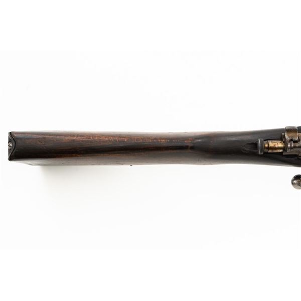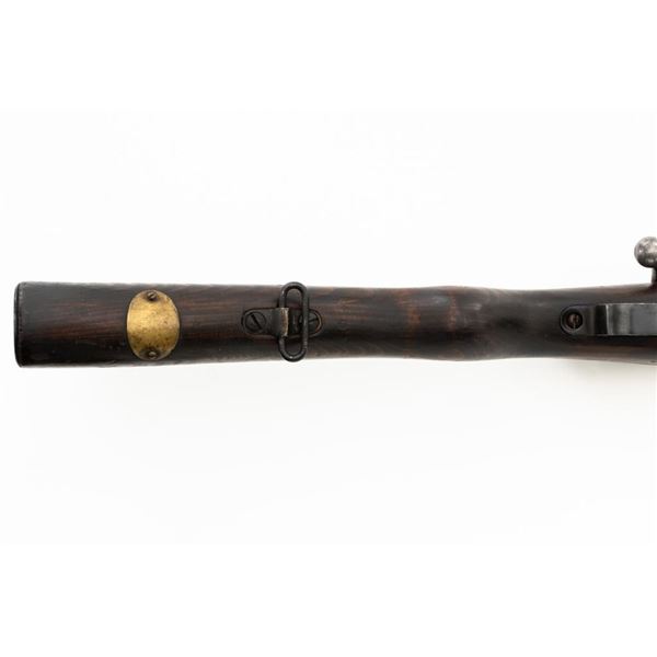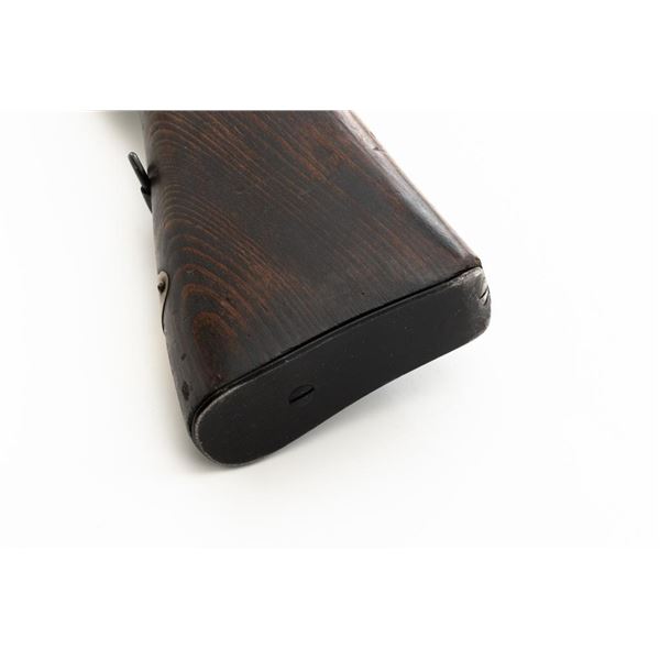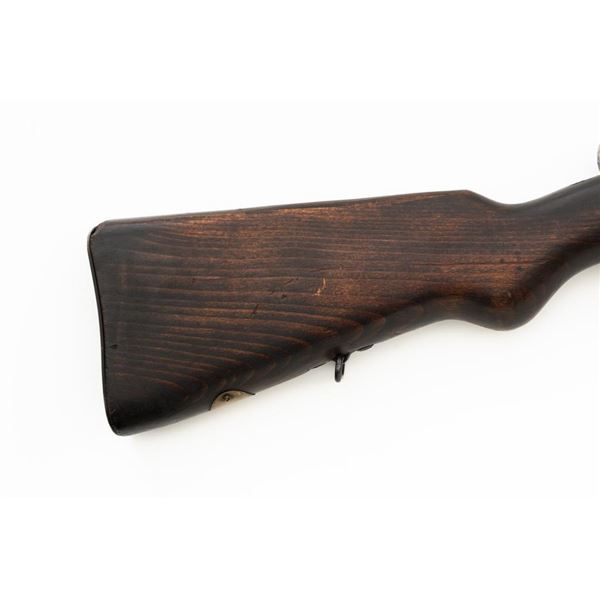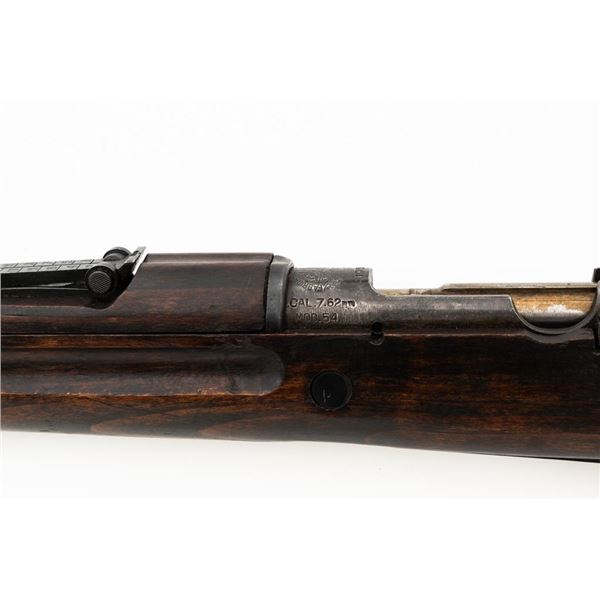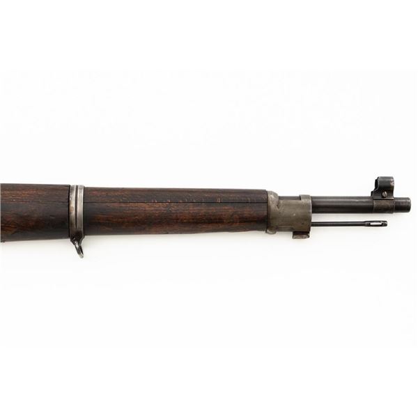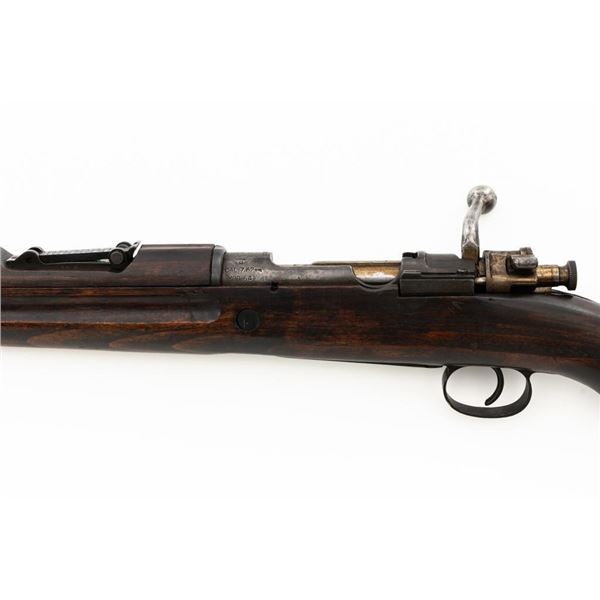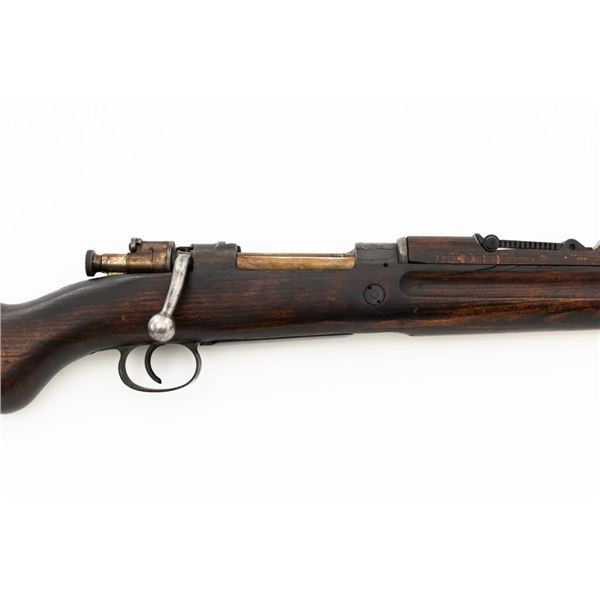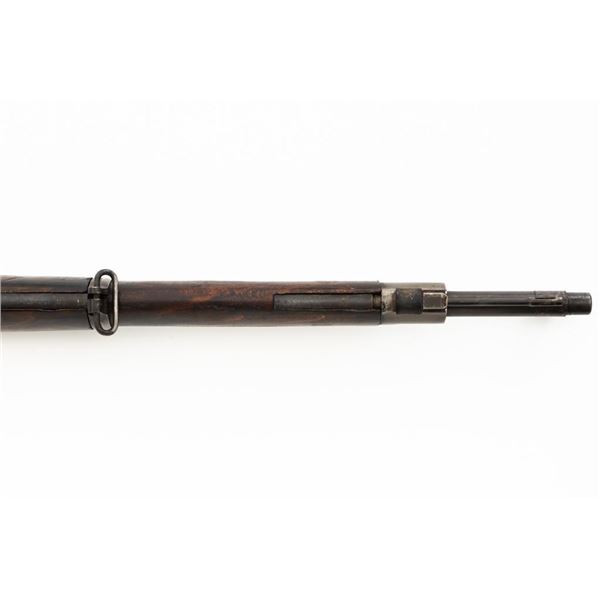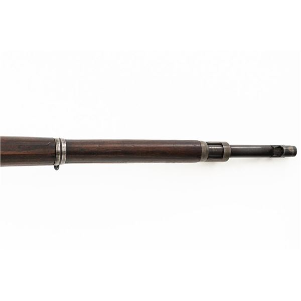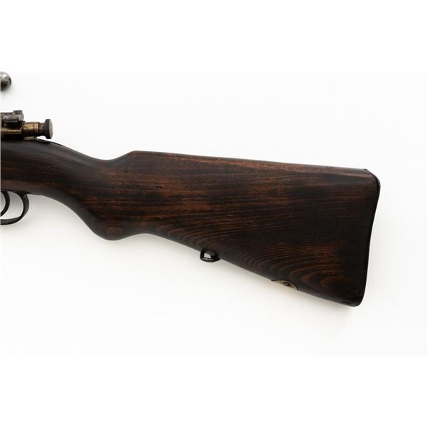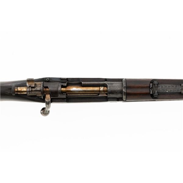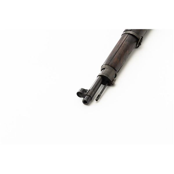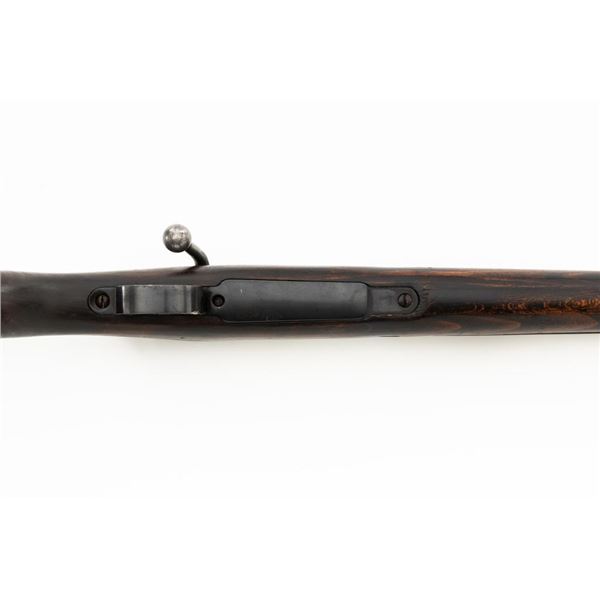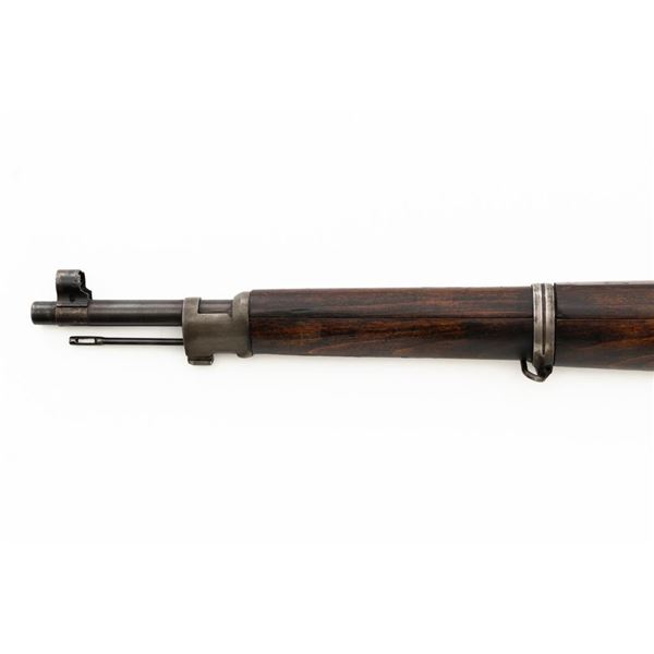 Mexican Model 1954 Mauser Bolt Action Rifle, #NVSN, .30-06 cal., 24"barrel, blued finish, hardwood stock and handguard, inverted-"V" front sight with attached hood, adjustable leaf rear sight with "V"-notched groove, graduated to 1500 meters. With steel cleaning rod and unmarked brass disc at the toe of the buttstock. Top of the receiver ring is marked "FABRICA DE ARMAS MEXICO/(Mexican crest)/1962", and left side with "CAL.7.62mm/MOD.54". No parts are numbered. No visible import marks. Condition overall is very good, retaining approx. 80% blue, with silver speckling across the receiver, wear to the muzzle area and barrel bands. Rear sight bed screw is missing. There is a crack to right side of the forend, below the rear sight. Wood is otherwise very good, showing scattered scratches and handling marks to the dark finish. Action operates smoothly. Bore with very good rifling. Est.: $400-$600. (C&R)
