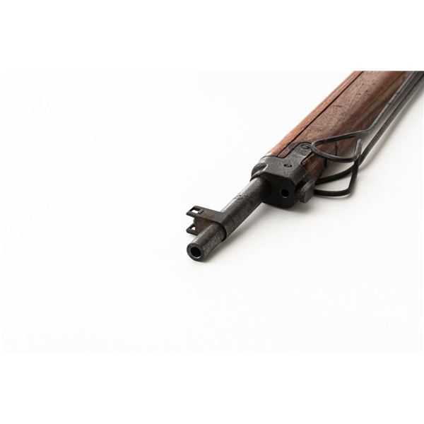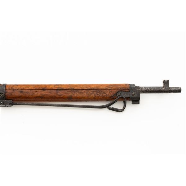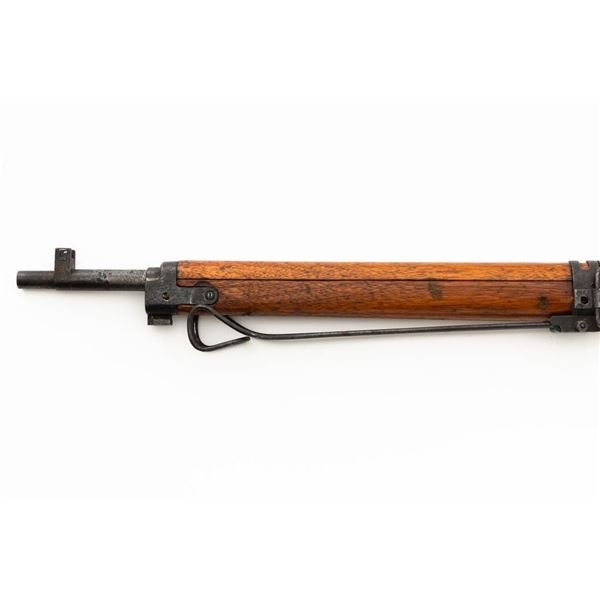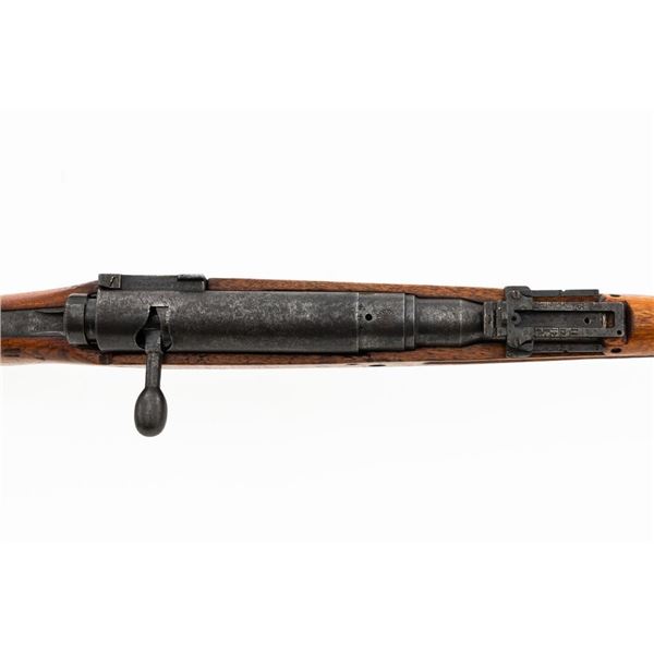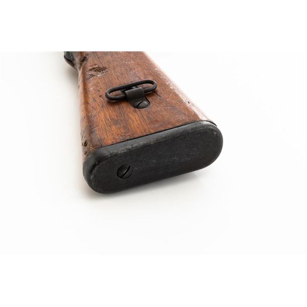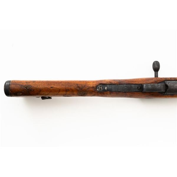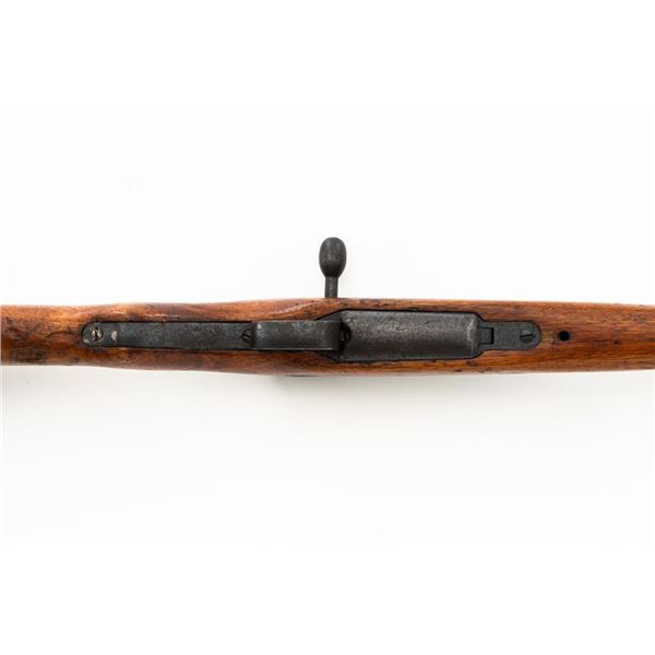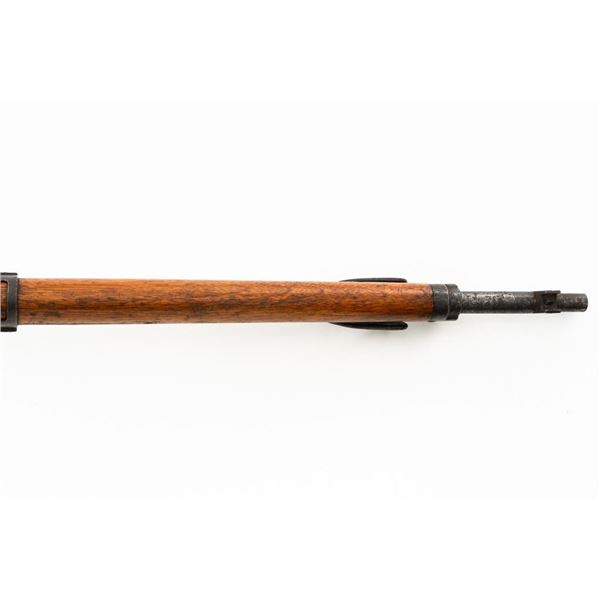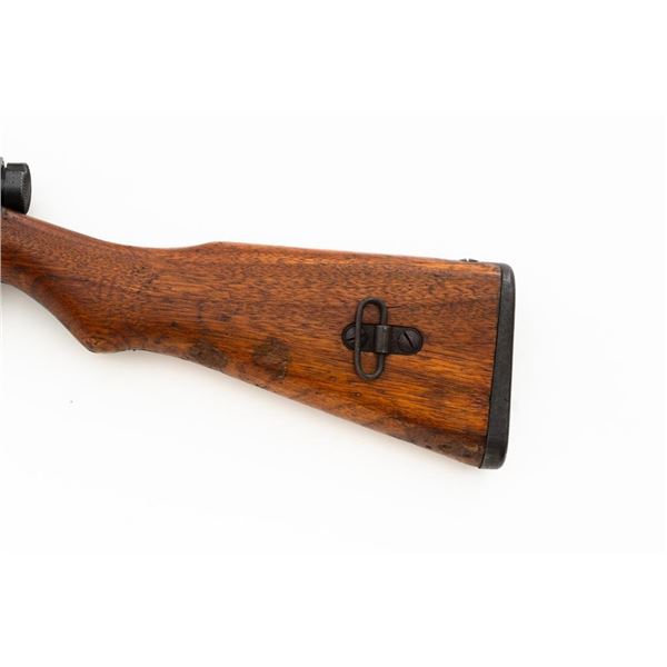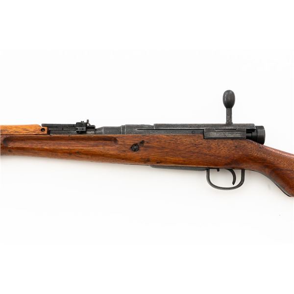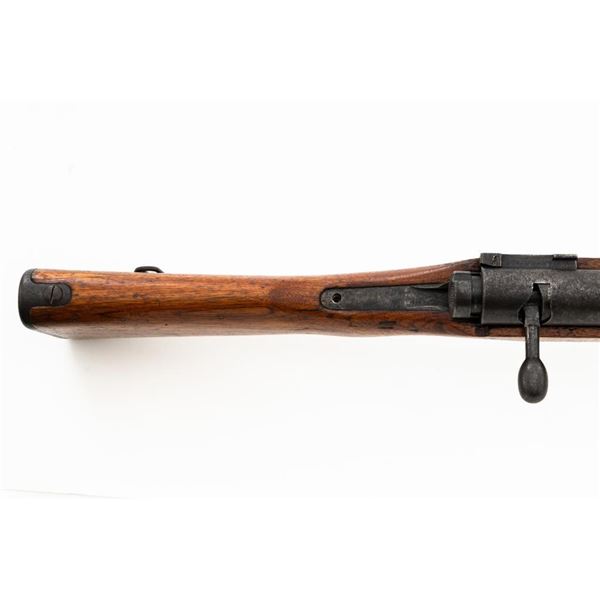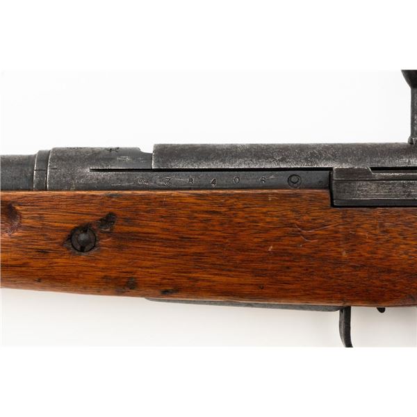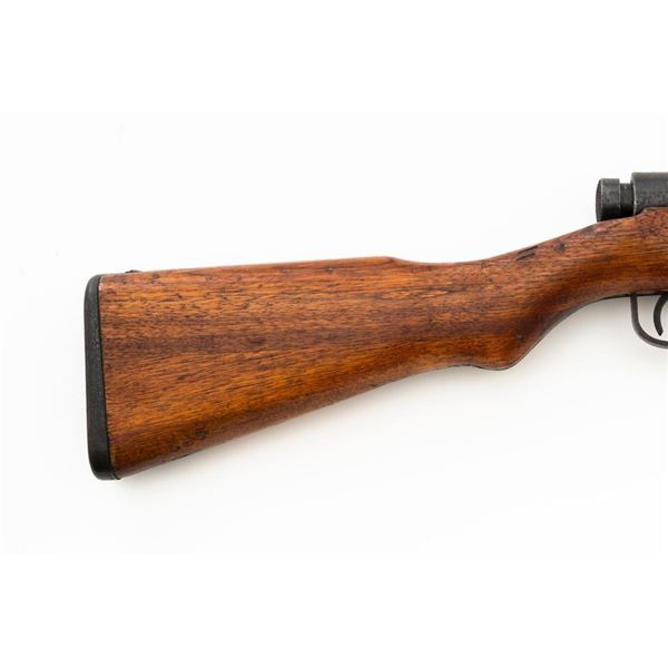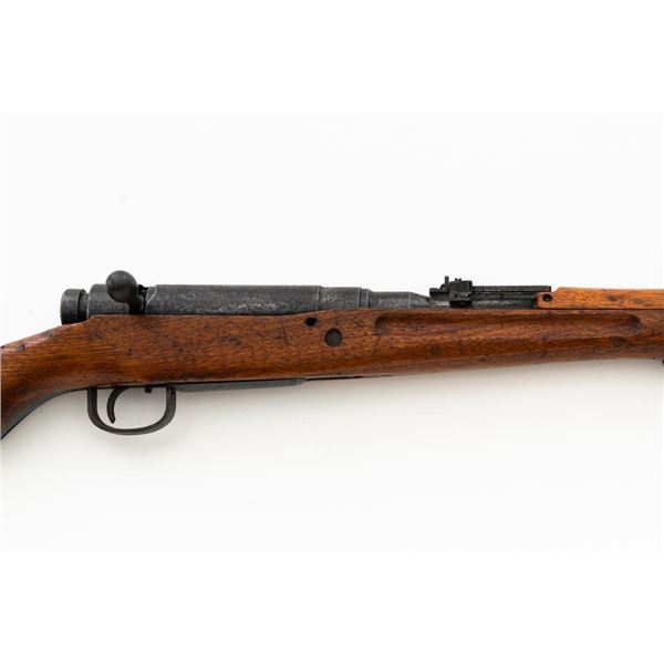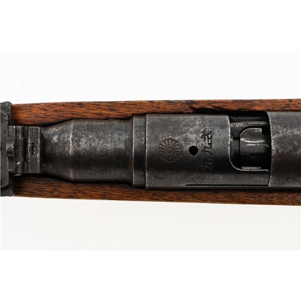 Japanese Type 99 Arisaka Bolt Action Rifle, #38406, 7.7x58mm cal., 25.5" barrel, blued finish, hardwood stock with handguard, two-piece buttstock, inverted-"V" front sight with protectors, and adjustable folding leaf rear sight with aperture, battle sight, and folding anti-aircraft wings. Includes steel cleaning rod. Left side rear barrel band screw, rear sight bed screw, and receiver tang screw are missing. Rifle is fitted with folding bipod and sheet steel dust cover. Top of receiver ring with Mum crest over characters for "99 Type". Left side receiver rail is stamped with 3rd series mark and the symbol for the Nagoya Arsenal. Matching numbers on bolt handle and bayonet mount. No visible import marks. Condition overall is good, retaining approx. 35%-40% finish, with most parts showing wear and now toned to a silver color. Wood is good with handling marks to the even colored finish, there are two spots of possible battle damage to left side of the buttstock. Est.: $400-$600. (C&R)