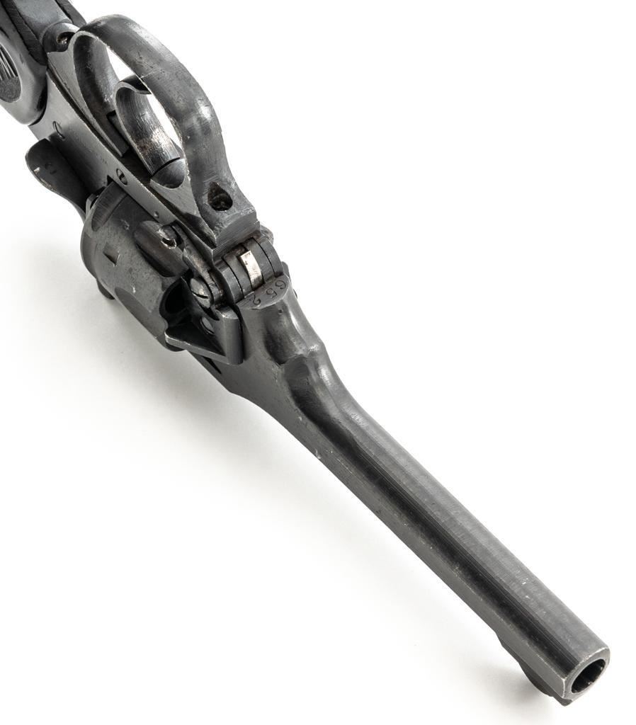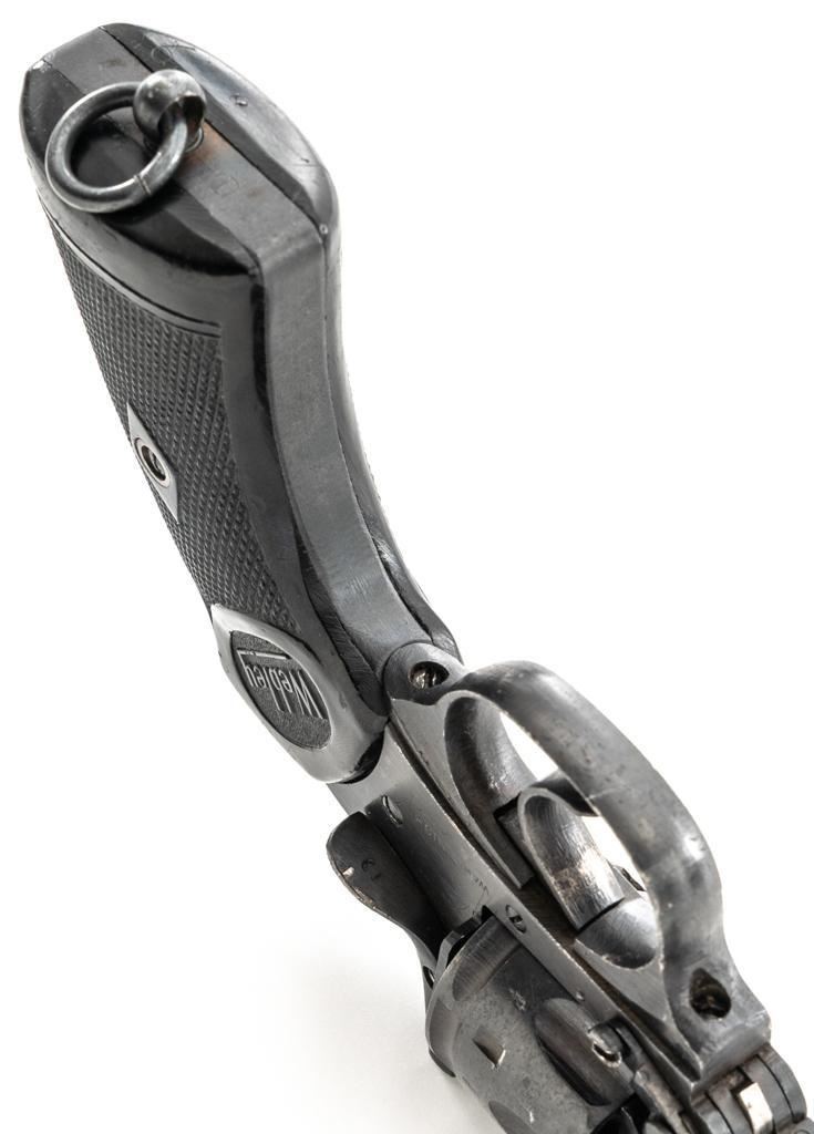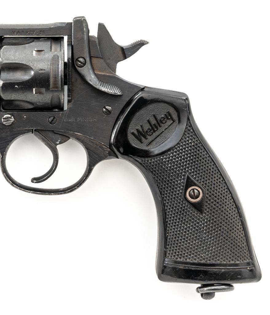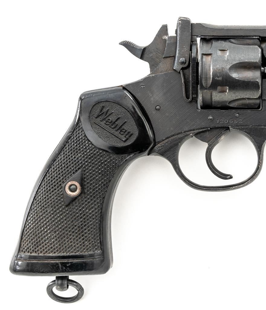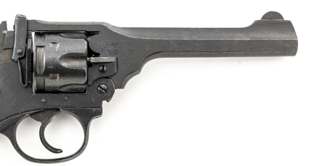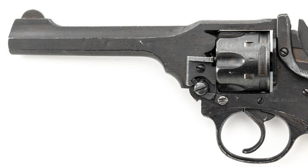 British Webley Mark IV Double Action Revolver, #120652, .38 S&W cal., 5" flat sided barrel, blued finish, checkered black plastic grips embossed with "Webley" logo on each side, blade front sight, fixed rear sight with "U"-notched groove, and a swiveling steel lanyard ring at the bottom of the grip frame. Top of barrel strap is marked "WEBLEY & SCOTT LTD" and "MARK IV .38" on the left side. Left side of the frame is stamped "WAR FINISH" and there is a crowned "inspection stamp" on the right side. "WD" has been stamped into the butt of the grip. Matching numbers. London export proof marks on right side barrel. No recent import marks. Condition overall is very good, retaining approx. 90% black finish, with light patina spots to the cylinder and left side of the barrel. Grips are good, showing age and handling wear. Action locks up, cycles, and ejects smoothly. Top of the chamber is stamped with "*"symbol, and the bore rates fair with an area of rust at the lead, otherwise bright with very good, defined rifling. Chambers are clean and bright. Est.: $400-$600. (C&R/PPT)