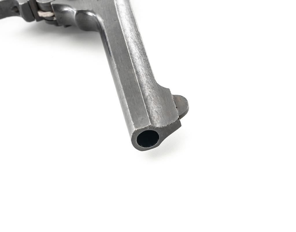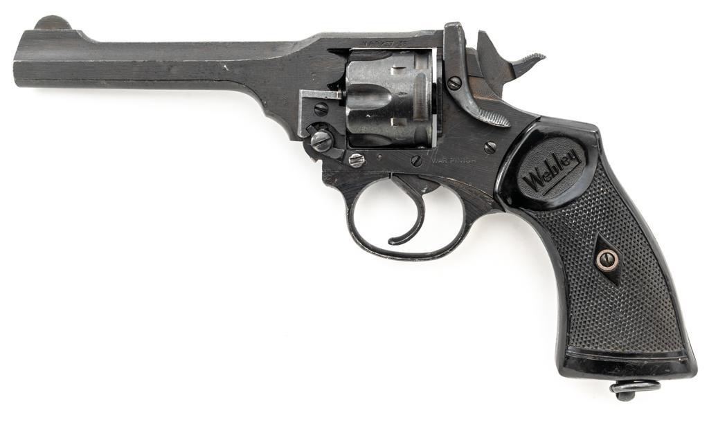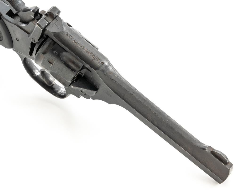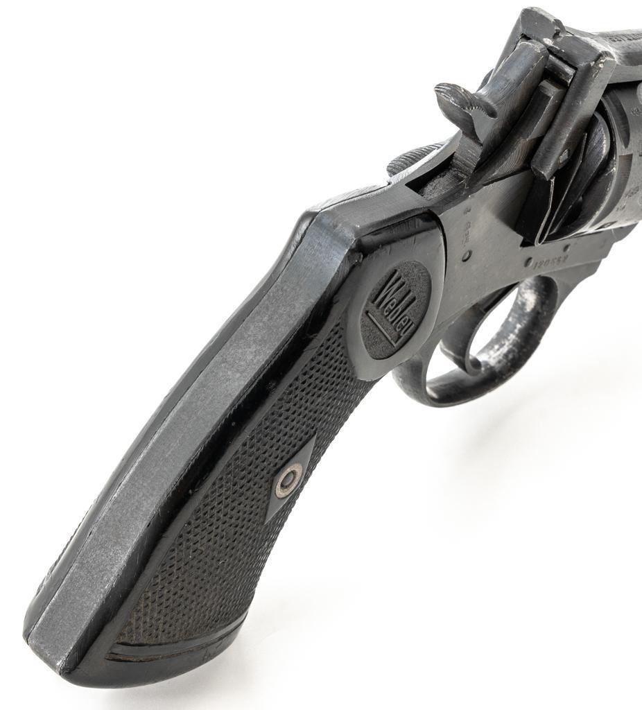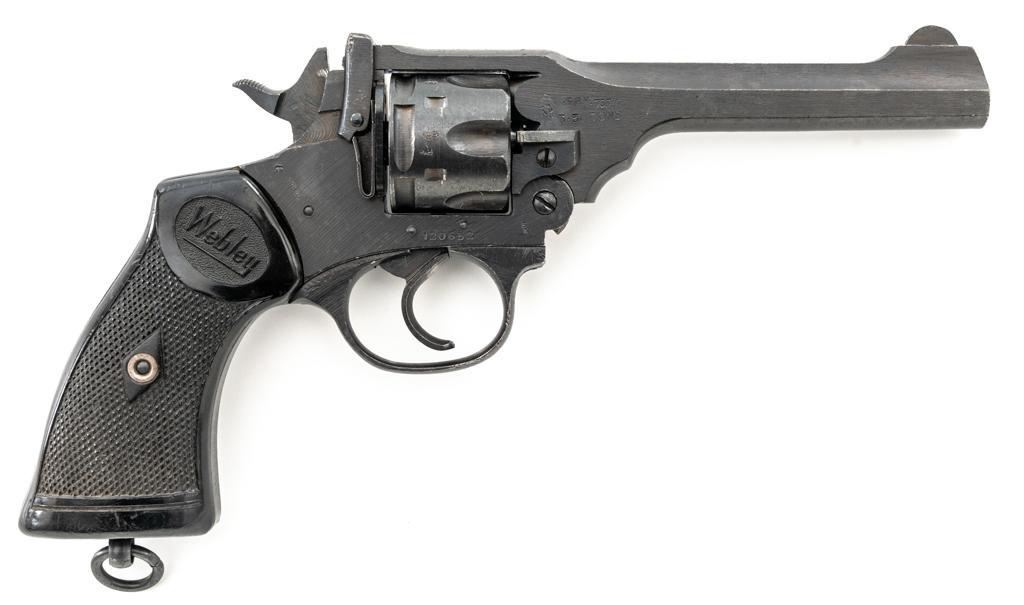 British Webley Mark IV Double Action Revolver, #120652, .38 S&W cal., 5" flat sided barrel, blued finish, checkered black plastic grips embossed with "Webley" logo on each side, blade front sight, fixed rear sight with "U"-notched groove, and a swiveling steel lanyard ring at the bottom of the grip frame. Top of barrel strap is marked "WEBLEY & SCOTT LTD" and "MARK IV .38" on the left side. Left side of the frame is stamped "WAR FINISH" and there is a crowned "inspection stamp" on the right side. "WD" has been stamped into the butt of the grip. Matching numbers. London export proof marks on right side barrel. No recent import marks. Condition overall is very good, retaining approx. 90% black finish, with light patina spots to the cylinder and left side of the barrel. Grips are good, showing age and handling wear. Action locks up, cycles, and ejects smoothly. Top of the chamber is stamped with "*"symbol, and the bore rates fair with an area of rust at the lead, otherwise bright with very good, defined rifling. Chambers are clean and bright. Est.: $400-$600. (C&R/PPT)