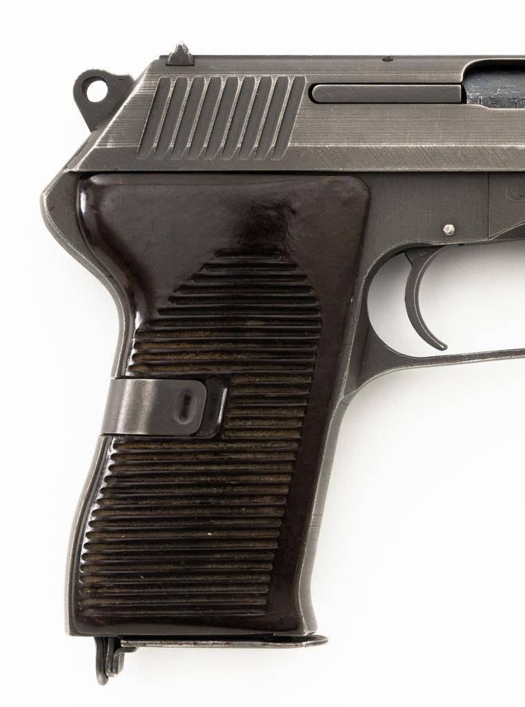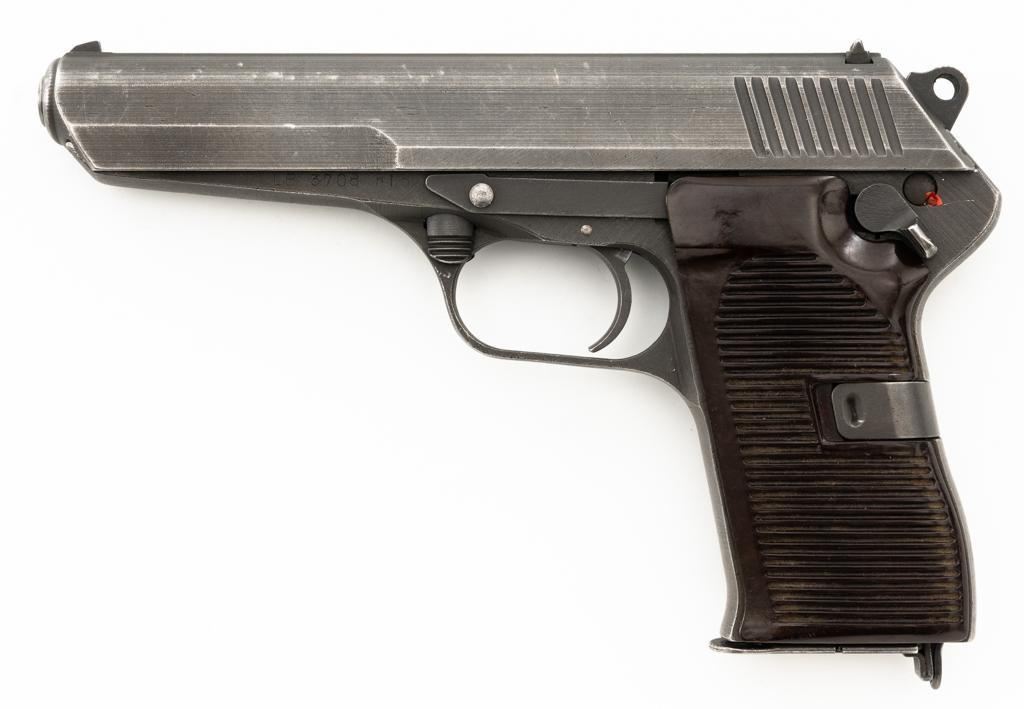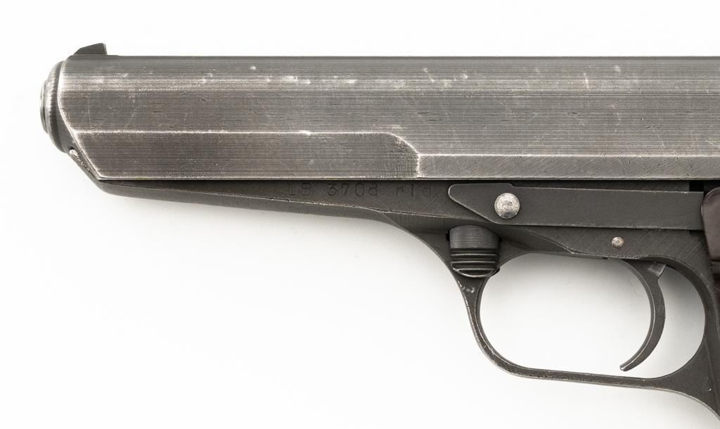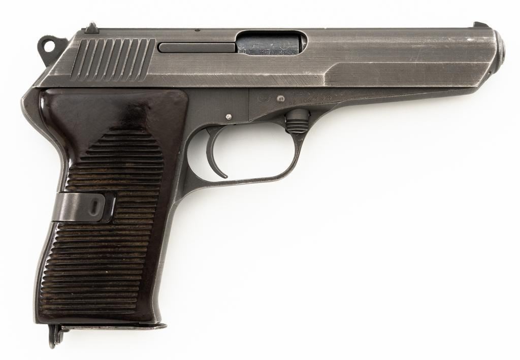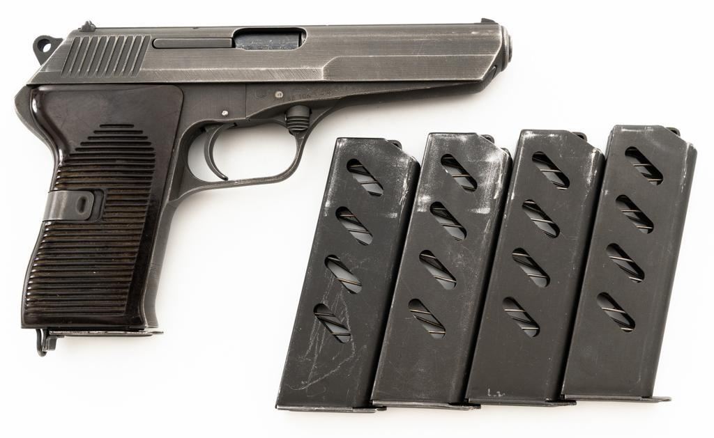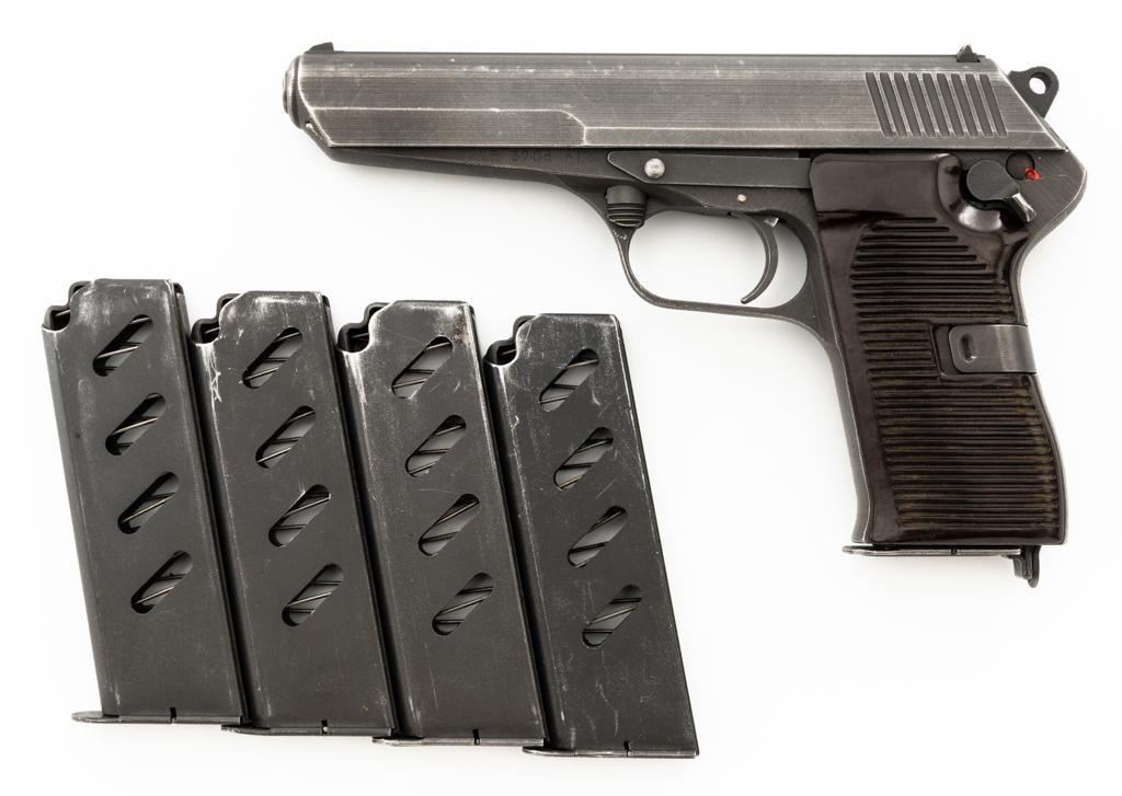 Czech CZ 52 Semi-Automatic Pistol with Five (5) Magazines, #LB3708, 7.62x25mm cal., 4.7" barrel, gray parkerized finish, grooved dark red plastic grips, blade front sight, fixed rear sight with "U"-notched groove, and swiveling lanyard loop at rear of the frame. All five (5) parkerized magazines are unmarked and in good to very good overall condition. Pistol is marked "rid" on left side of the frame with "(crossed swords)/54" on the right side. Matching numbers on frame and slide. Import marked on right side of the frame. Condition overall is very good, retaining approx. 85% finish, showing areas of edgewear and thinning. Grips with scattered light handling marks and scratches. Action operates smoothly. Bore rates fair and is dark, rifling shows moderate+ wear. Est.: $300-$500. (C&R/PPT)