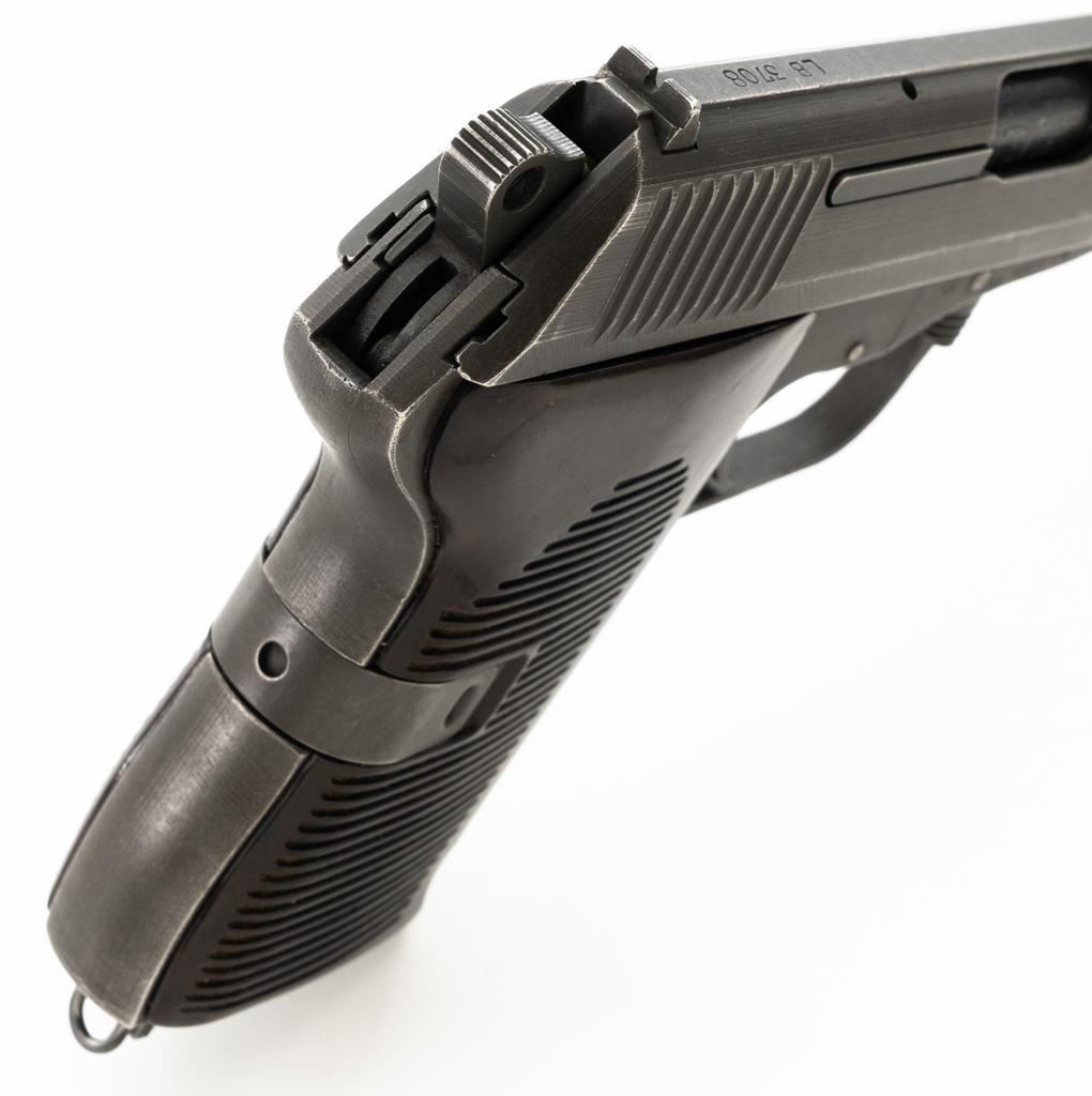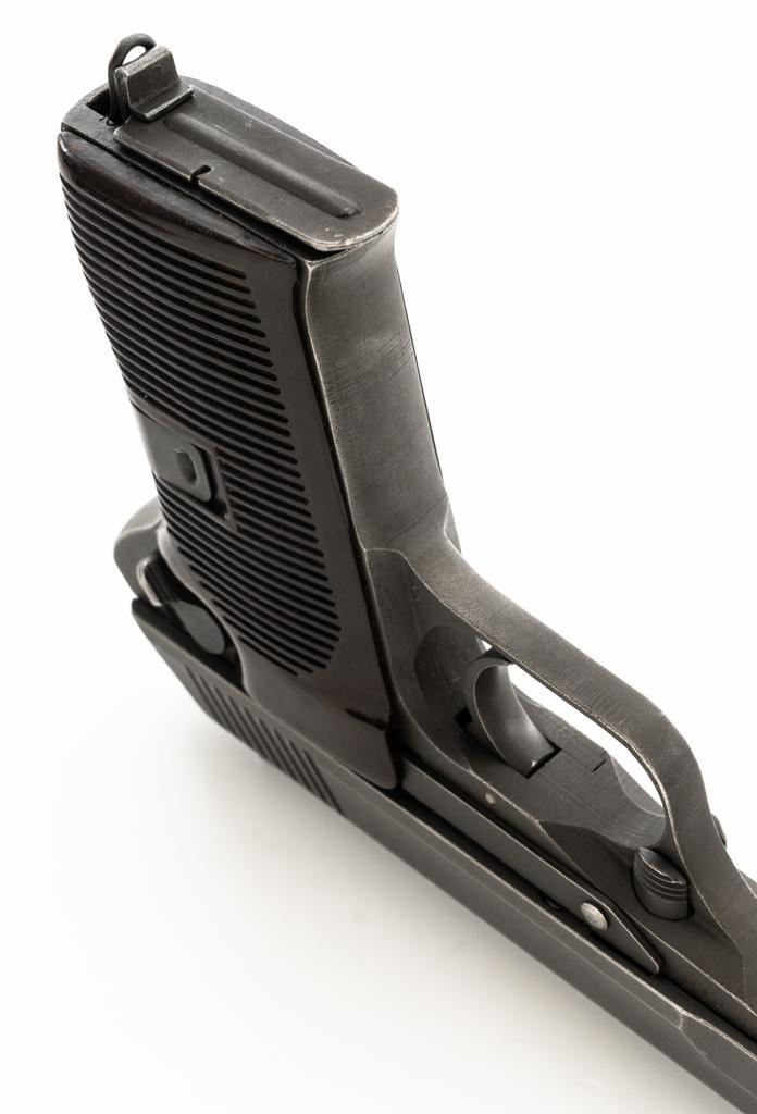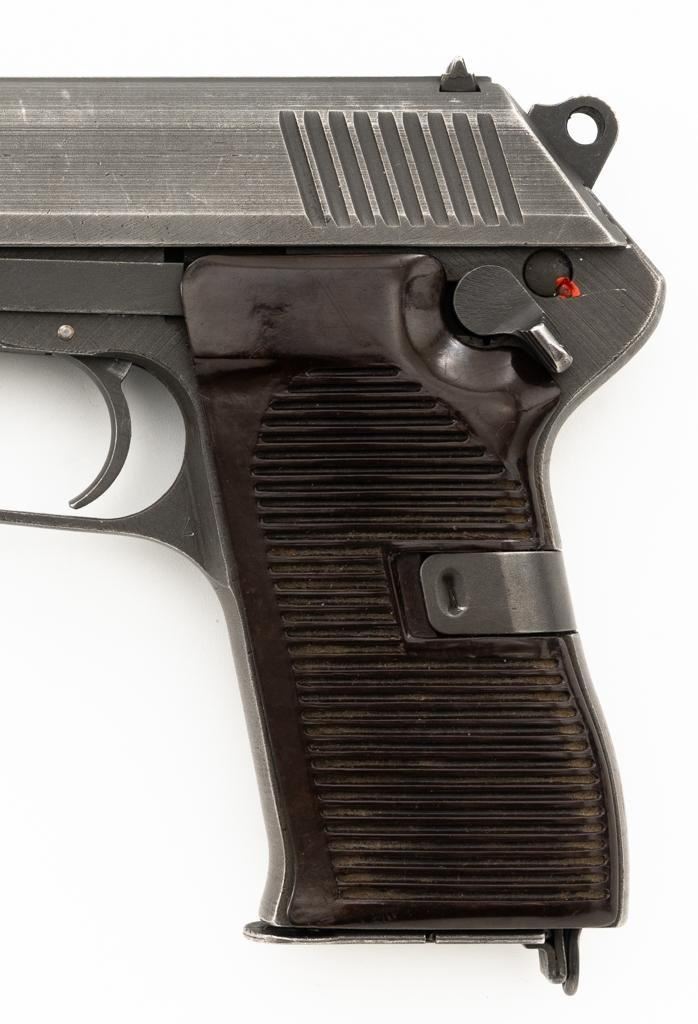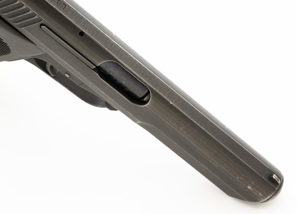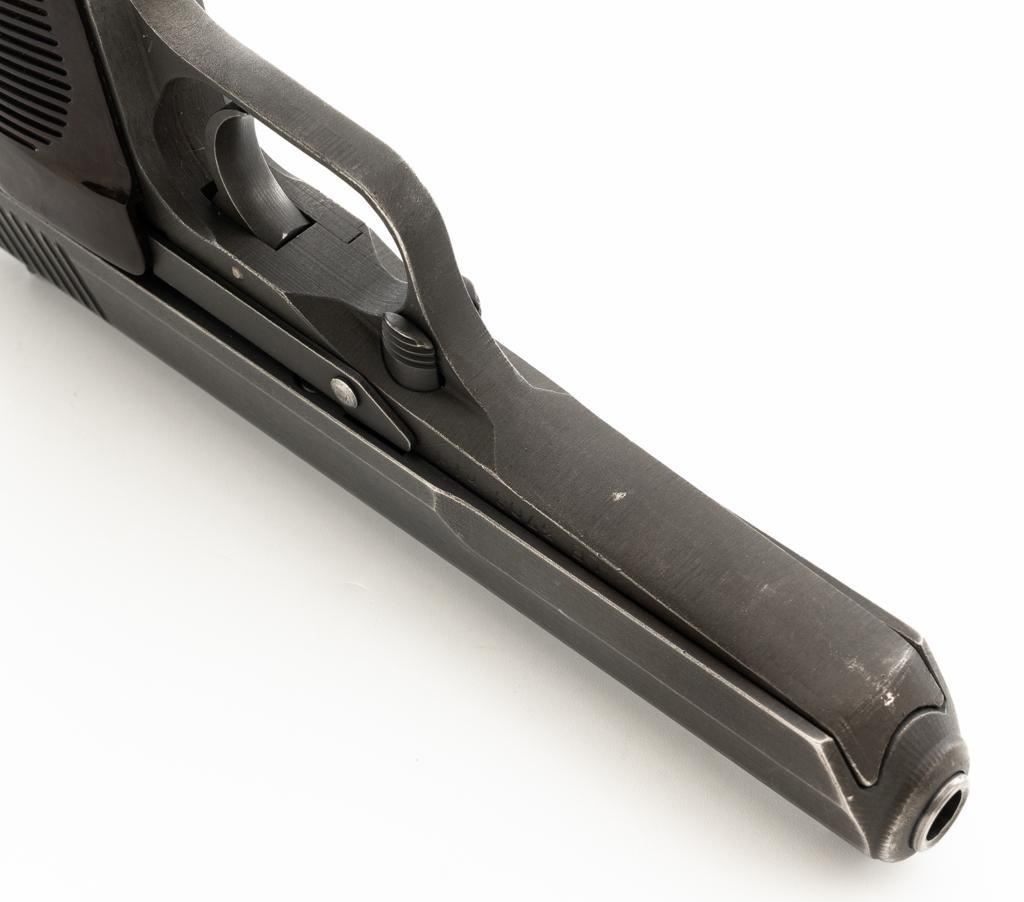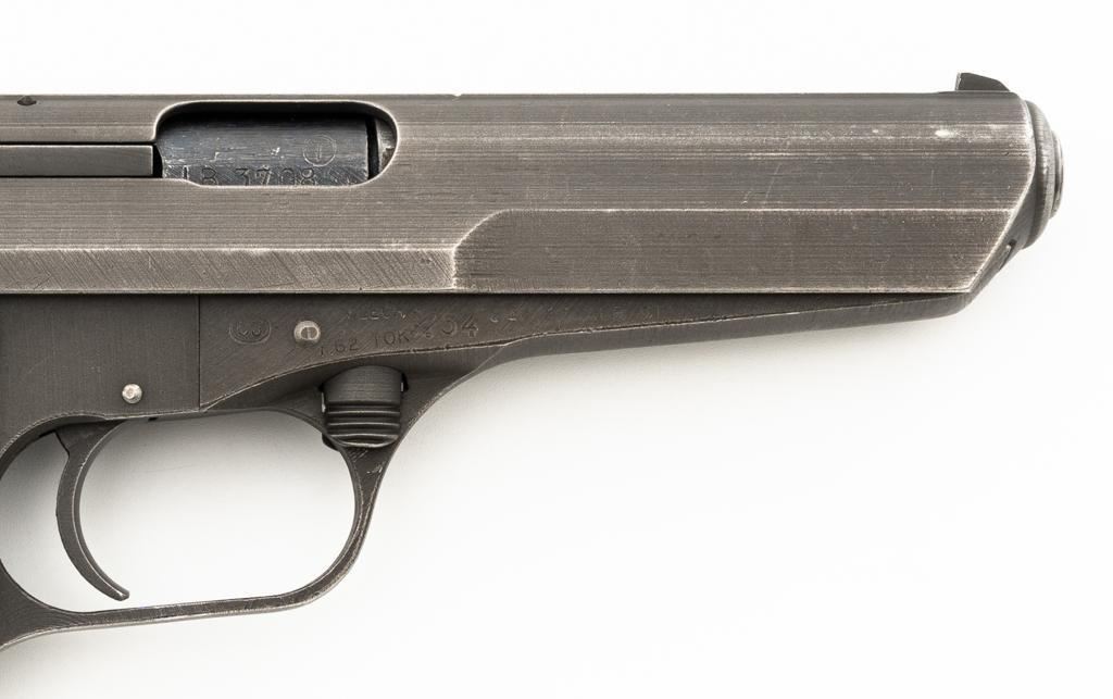 Czech CZ 52 Semi-Automatic Pistol with Five (5) Magazines, #LB3708, 7.62x25mm cal., 4.7" barrel, gray parkerized finish, grooved dark red plastic grips, blade front sight, fixed rear sight with "U"-notched groove, and swiveling lanyard loop at rear of the frame. All five (5) parkerized magazines are unmarked and in good to very good overall condition. Pistol is marked "rid" on left side of the frame with "(crossed swords)/54" on the right side. Matching numbers on frame and slide. Import marked on right side of the frame. Condition overall is very good, retaining approx. 85% finish, showing areas of edgewear and thinning. Grips with scattered light handling marks and scratches. Action operates smoothly. Bore rates fair and is dark, rifling shows moderate+ wear. Est.: $300-$500. (C&R/PPT)