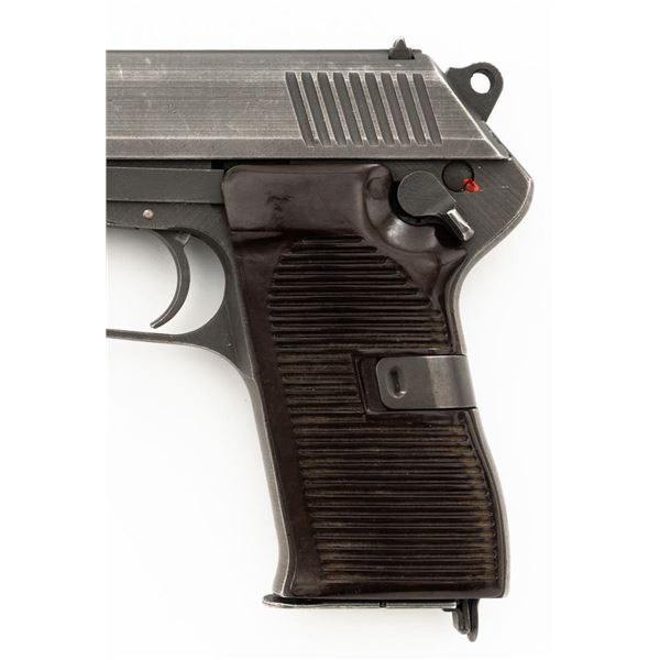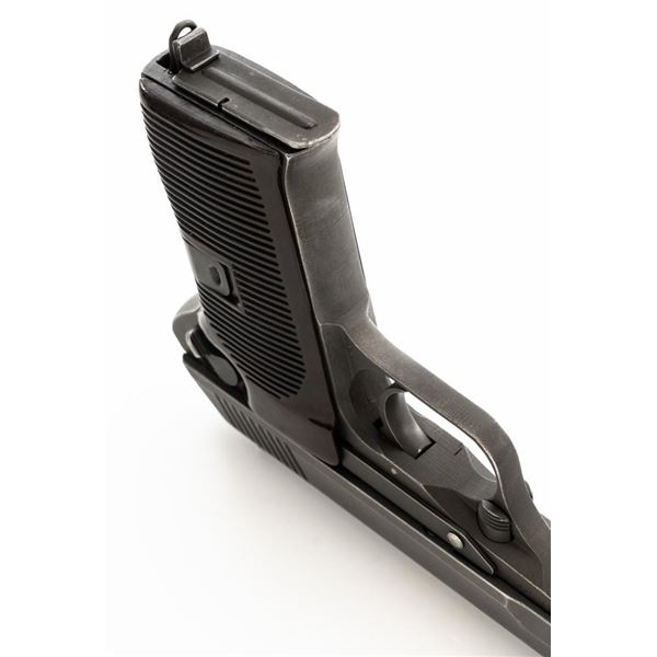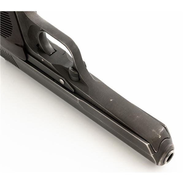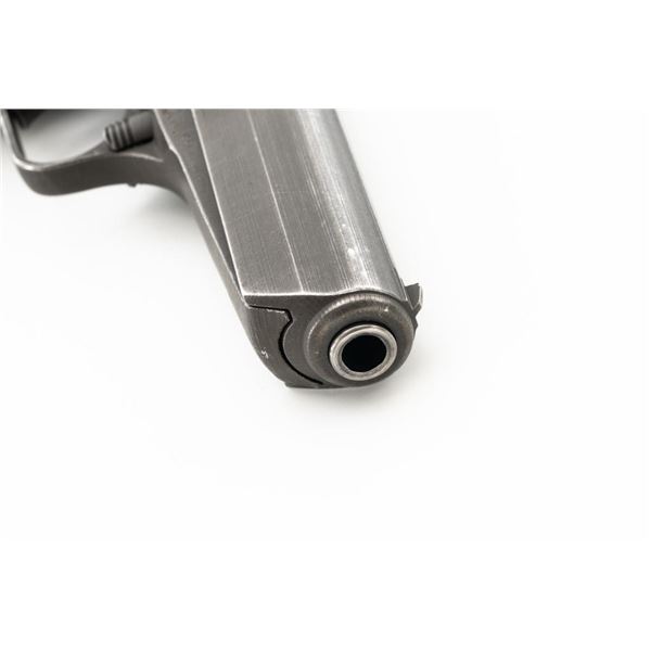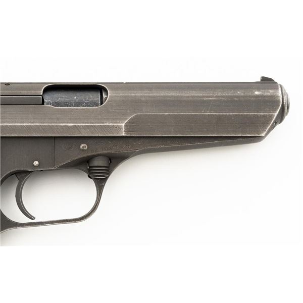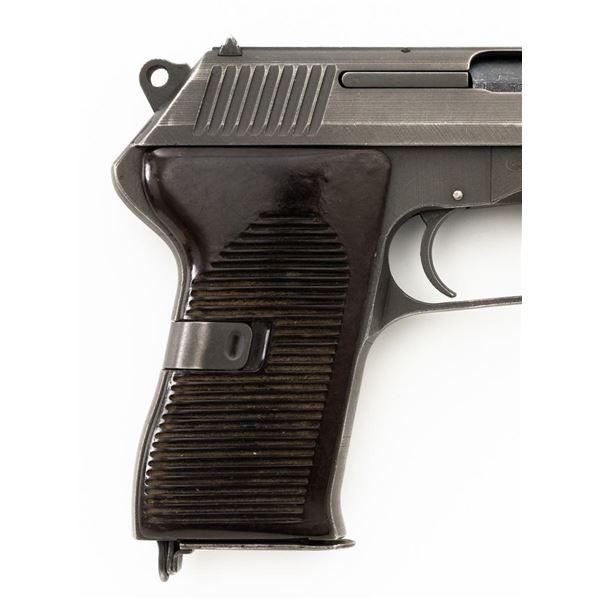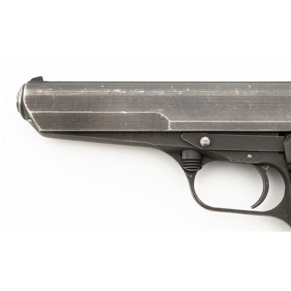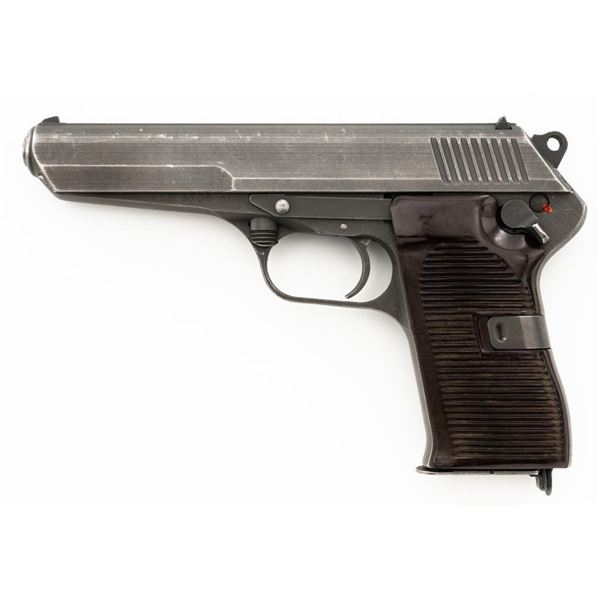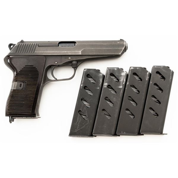 Czech CZ 52 Semi-Automatic Pistol with Five (5) Magazines, #LB3708, 7.62x25mm cal., 4.7" barrel, gray parkerized finish, grooved dark red plastic grips, blade front sight, fixed rear sight with "U"-notched groove, and swiveling lanyard loop at rear of the frame. All five (5) parkerized magazines are unmarked and in good to very good overall condition. Pistol is marked "rid" on left side of the frame with "(crossed swords)/54" on the right side. Matching numbers on frame and slide. Import marked on right side of the frame. Condition overall is very good, retaining approx. 85% finish, showing areas of edgewear and thinning. Grips with scattered light handling marks and scratches. Action operates smoothly. Bore rates fair and is dark, rifling shows moderate+ wear. Est.: $300-$500. (C&R/PPT)
