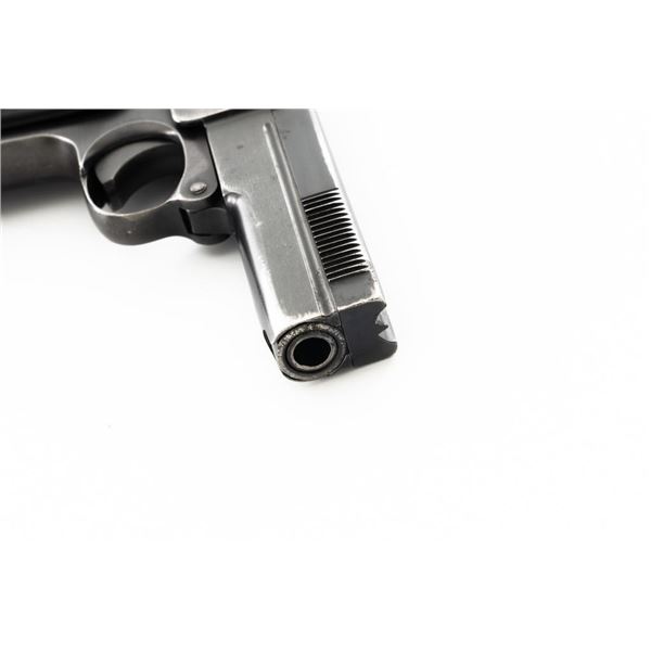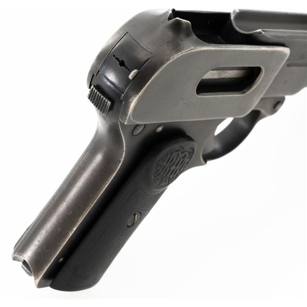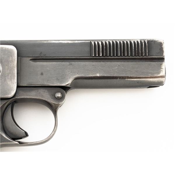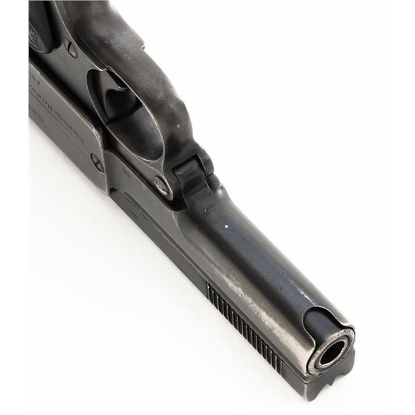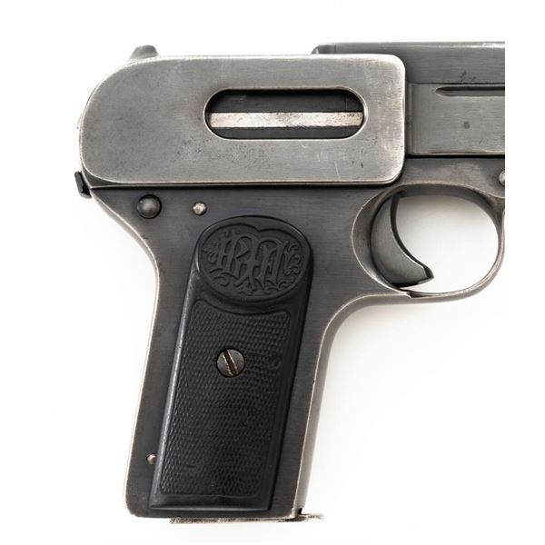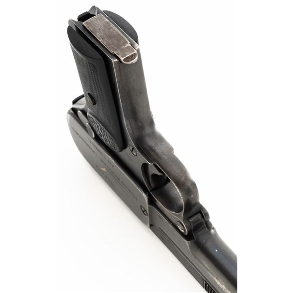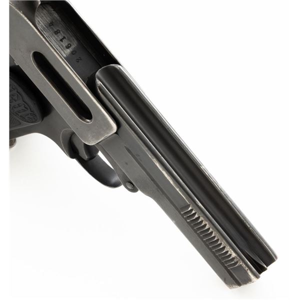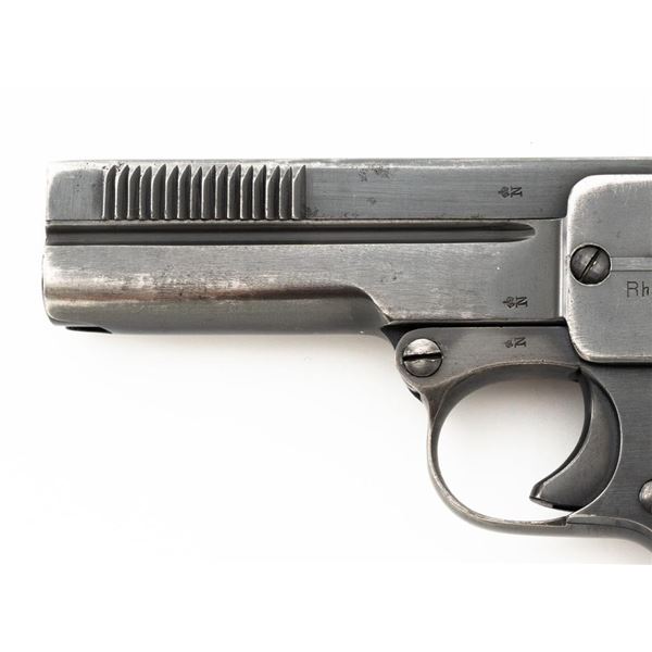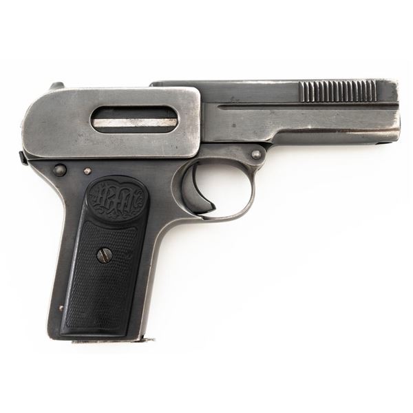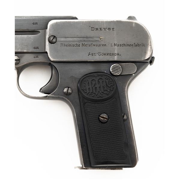 Dreyse Model 1907 Semi-Automatic Pistol, #206184, .32 ACP cal., 3.6" barrel, blued finish, checkered black plastic grips embossed with "RMF" logos on both sides, low profile inverted-"V" front sight, and fixed rear sight with "V"-notched groove. Includes one magazine, marked with an "E" on the floorplate extension. Most of the finish has worn off of the magazine and there is a small dent to left side of the body. Pistol is marked on left side of the frame "DREYSE/Rheinische Metallwaaren & Maschinenfabrik/ABT.SOMMERDA". There are "(crown)N" proof marks on left side of the barrel, slide, and frame. No visible import marks. Condition overall is very good, retaining approx. 80%-85% blue, with wear and spots of patina to the muzzle, slide, and frame. Grips show age and handling wear, with a chip missing from the left side. Action operates smoothly. Bore is bright with very good+ rifling. Est.: $300-$500. (C&R/PPT)